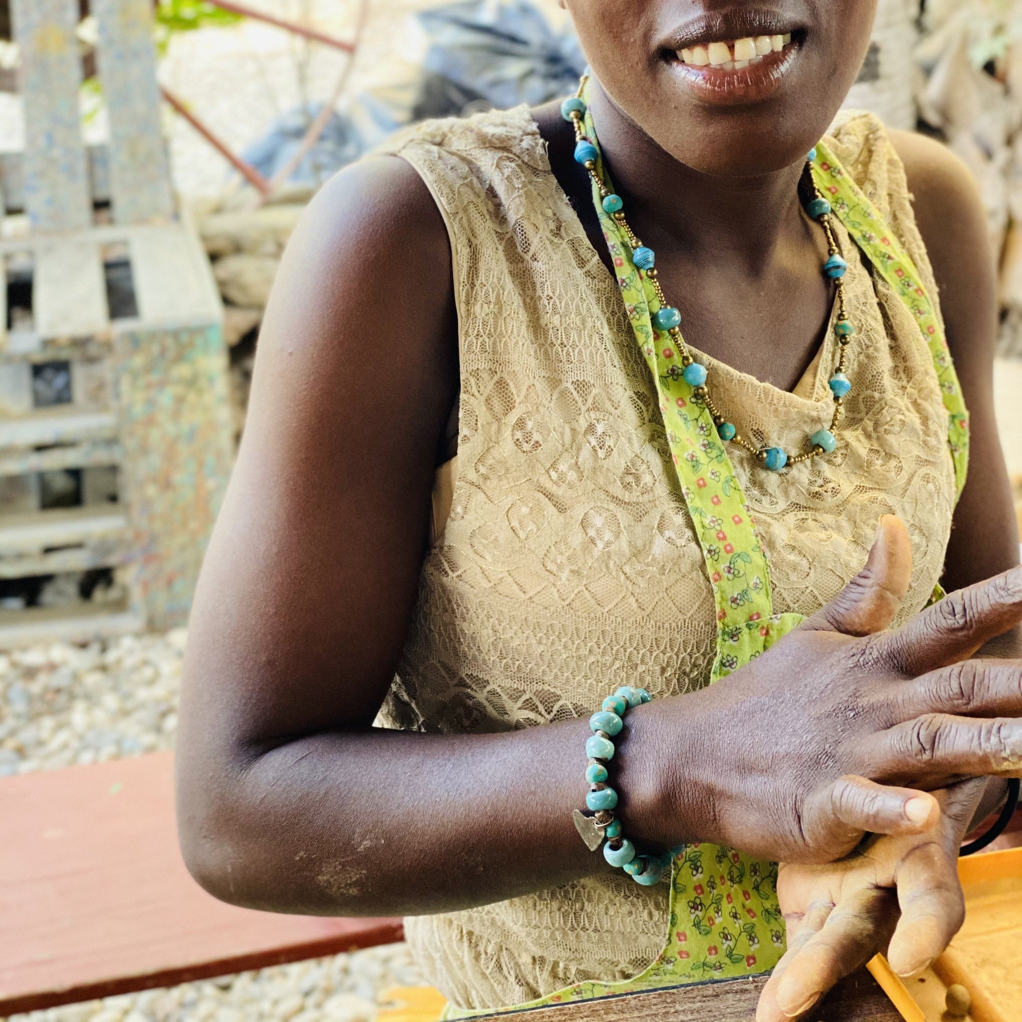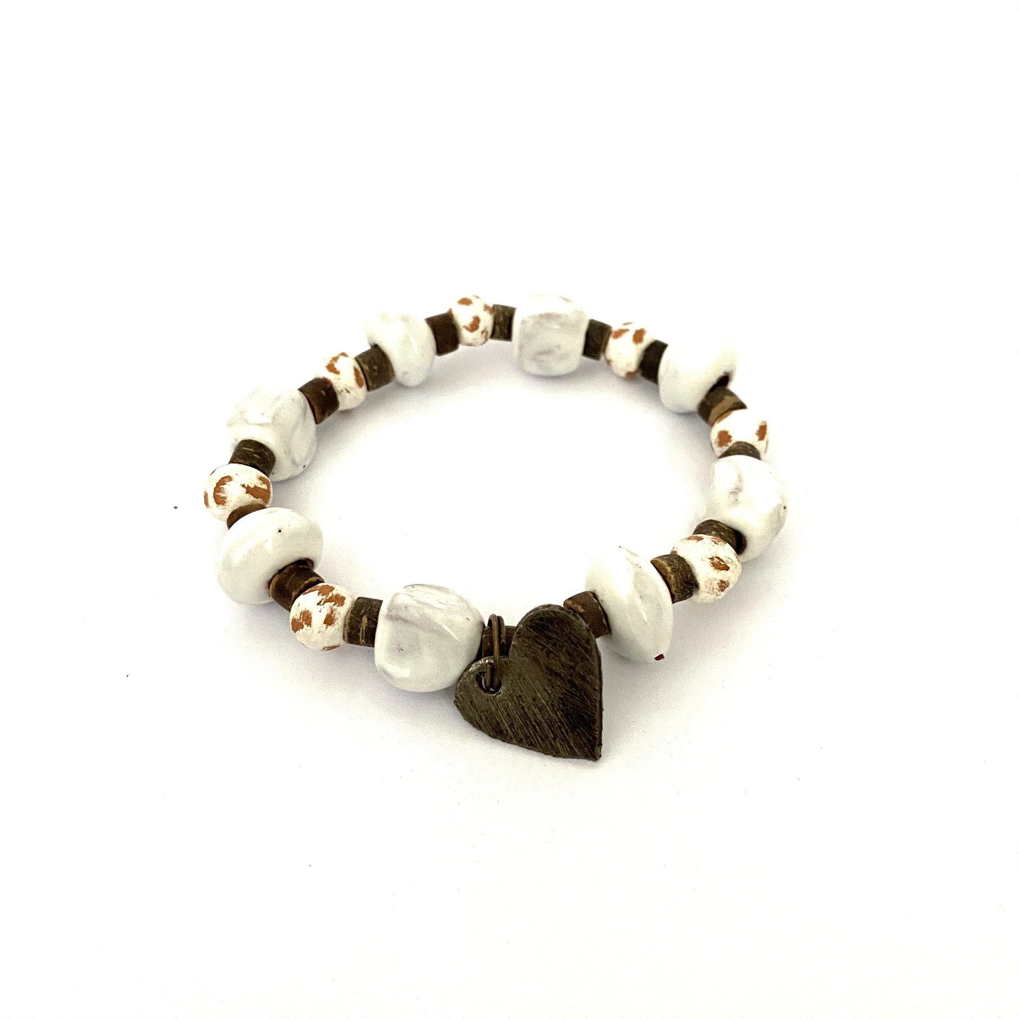 Handmade Haitian clay beads are glazed and fired by hand. This look is perfectly paired with a heart charm!