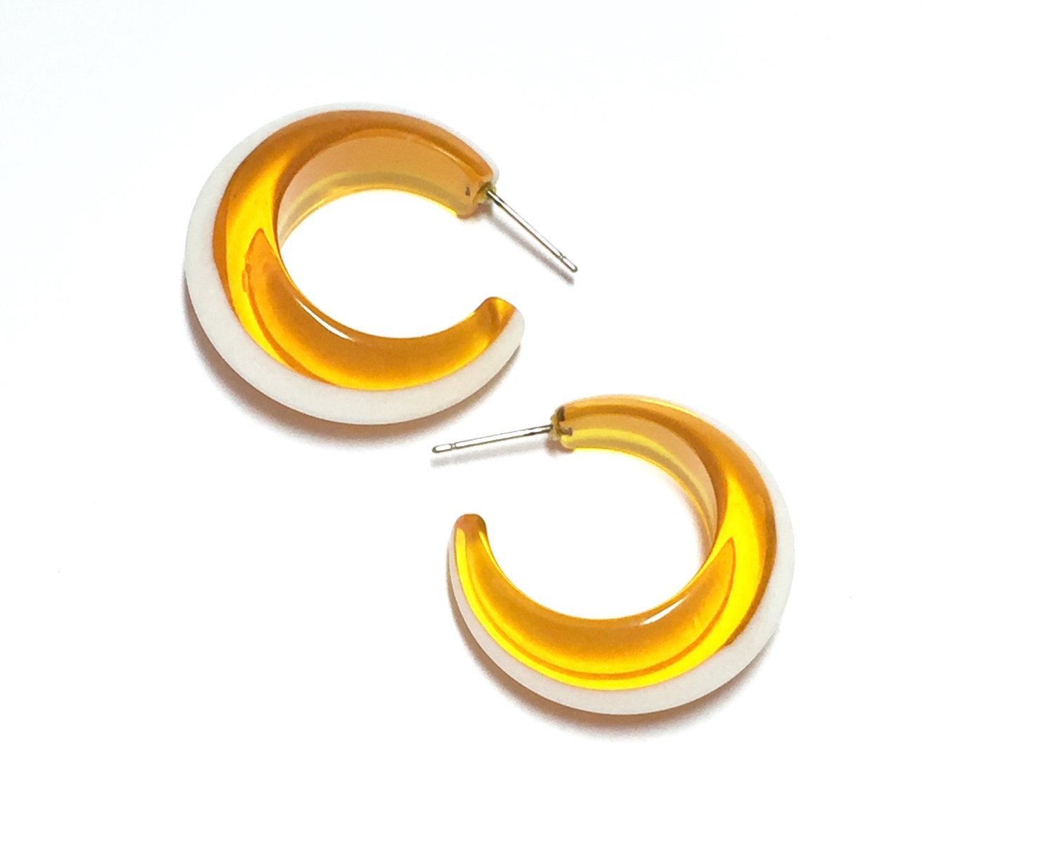 Golden yellow hoop earrings with a stripe of opaque white around the border. These hoop earrings made of vintage lucite are the perfect addition to your wardrobe. This style is known as the 'Pinched Bulb Hoops'. Each measures just under 1.25"n diameter or 29mm and 10mm in width at the widest point.