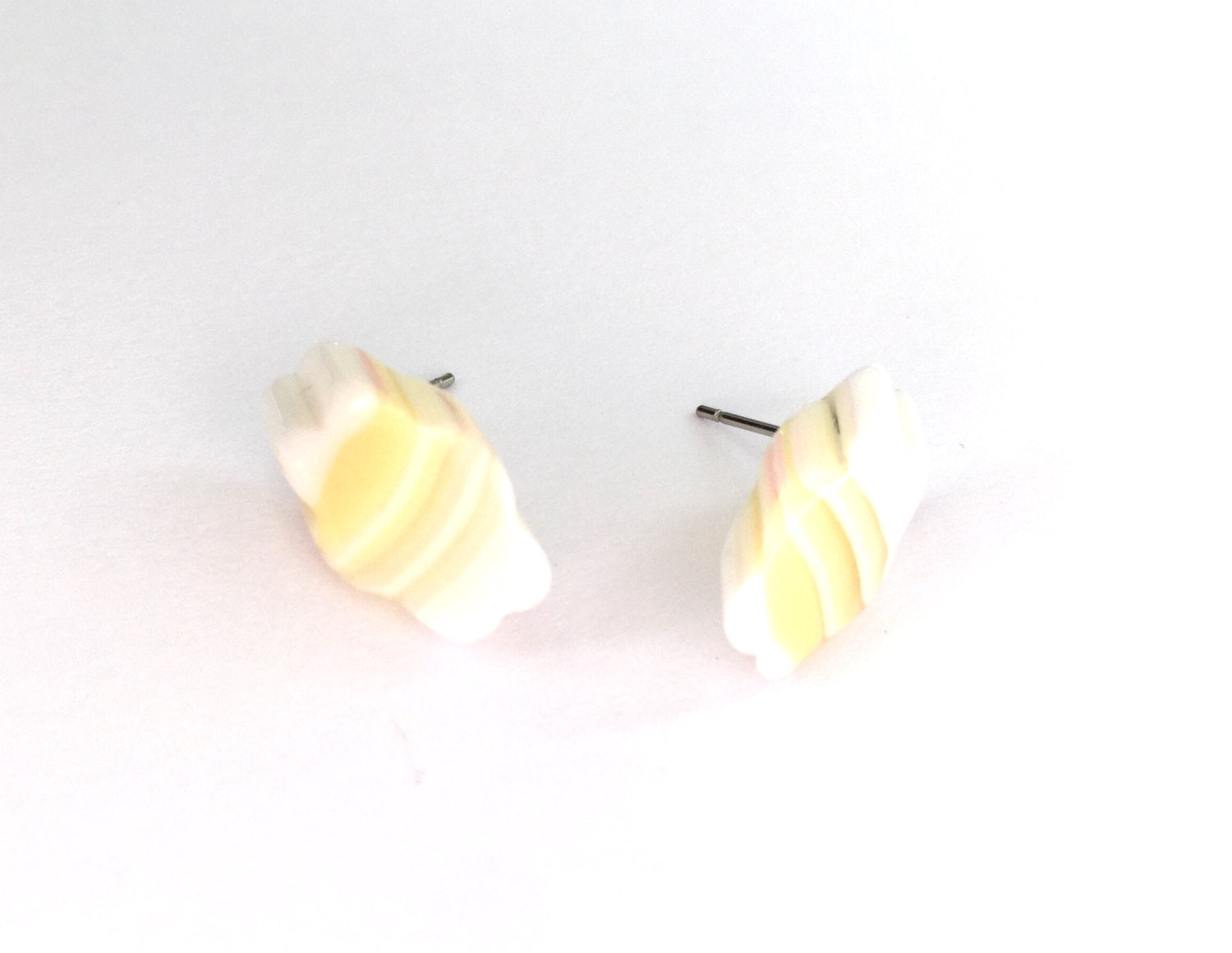 Funky & sweet lucite stud earrings featuring vintage lucite cut in a daisy flower motif. The old lucite was made into 'canes', similar to the way that the Venetians made their glass beads, and then the cane was sliced to make these earring pieces. This is how the stripes & marbling feature was made. Flower shapes cut on a bias so that they're 'sliding'. Each measures approximately 11X15mm in a floral oval shape. White & yellow with a hint of clear, stripes.