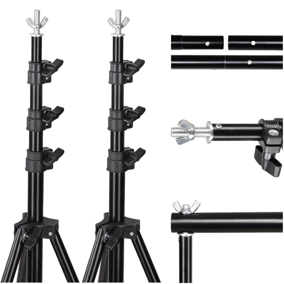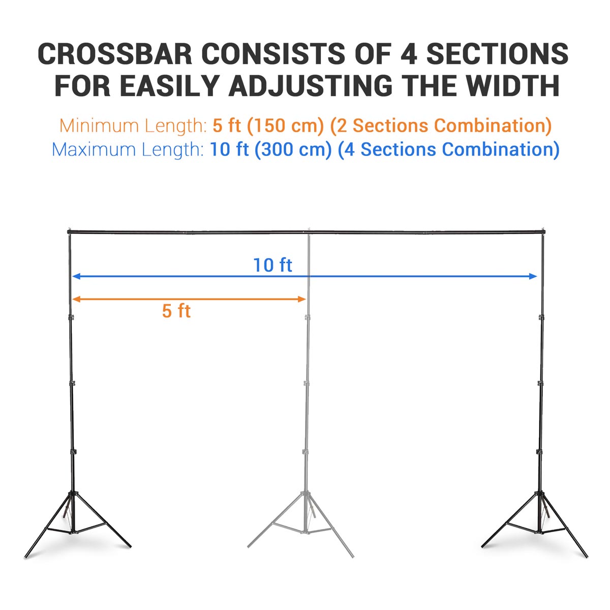 - Adjustable & Customizable - Equipped with 4 pieces of 29" section crossbars featuring an adjustable width from 5 to 10 ft by combining 2 or 4 sections for backdrops of different widths; Also comes with 2 height-adjustable tripods which can be adjusted from 2 7/12 to 8 1/2 ft tall for backdrops of different heights
