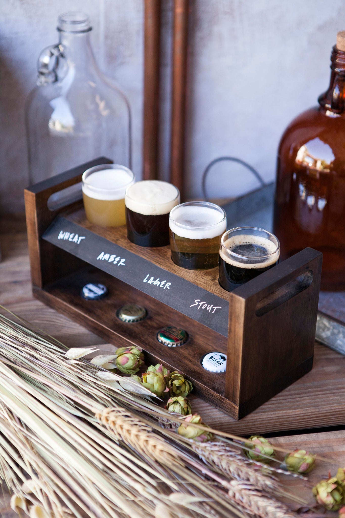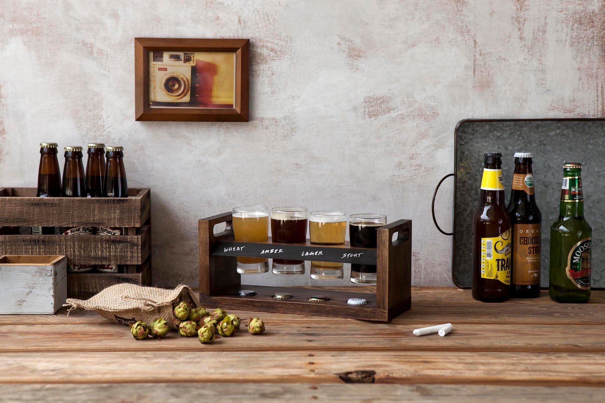 The Craft Beer Flight Set is a stylish-yet-rugged beer flight tasting set made to delight ale-aficionados and Pilsner-poppers alike. This handsome two-tiered acacia tray holds four 4 oz beer glasses suspended in the top shelf and includes a chalkboard panel and soapstone pencil for labeling beers and hollowed areas to neatly hold beer caps. The ultimate housewarming or birthday gift for true beer lovers, this beer tasting set allows you to take the craft beer tasting experience home. Whether it’s an elegant addition to the man cave or the she shed - or a plea for reasonable portions for your favorite newly-21 beer drinker - this Craft Beer Flight Tasting Set is sure to please beer-lovin' men and women everywhere.
