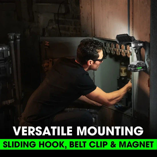 Light up your workspace with the versatile FLEX 24V Inspection Light. This innovative inspection light features angled light panels optimized for lighting large areas and surfaces like a flood light. It also features a 180-degree pivot and 270-degree swivel for multidirectional lighting. Adjustable brightness across three settings of 200, 500, or 1,000 lumens allow you to light for the task at hand, and a sliding hook, belt clip, and magnet provide versatile mounting options. This inspection light delivers the FLEX Advantage of unmatched battery power, runtime, and fast charging (batteries and chargers sold separately). It’s all protected by the FLEX Limited Lifetime Warranty when registered within 30 days of purchase at registermyFLEX.com through December 31, 2024.