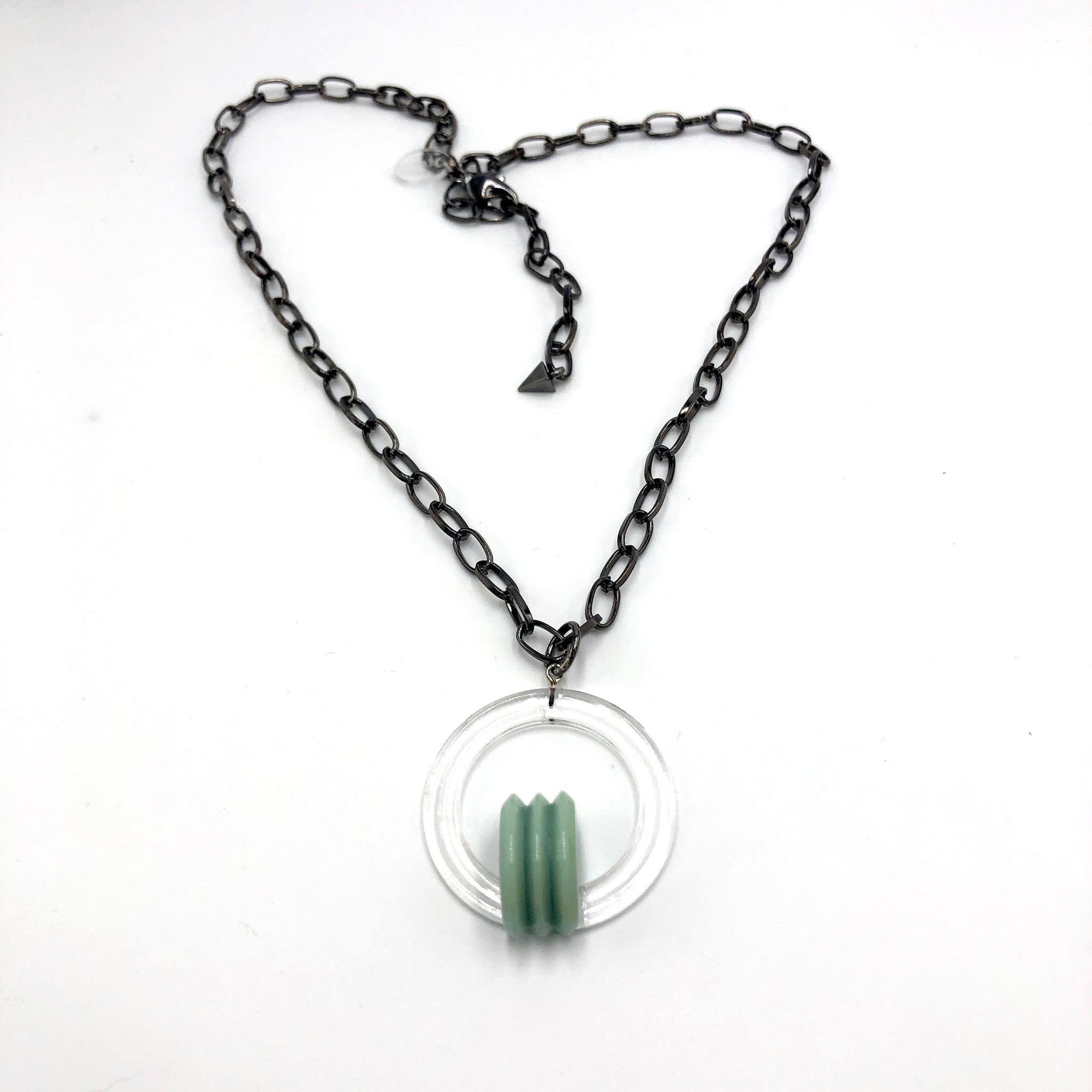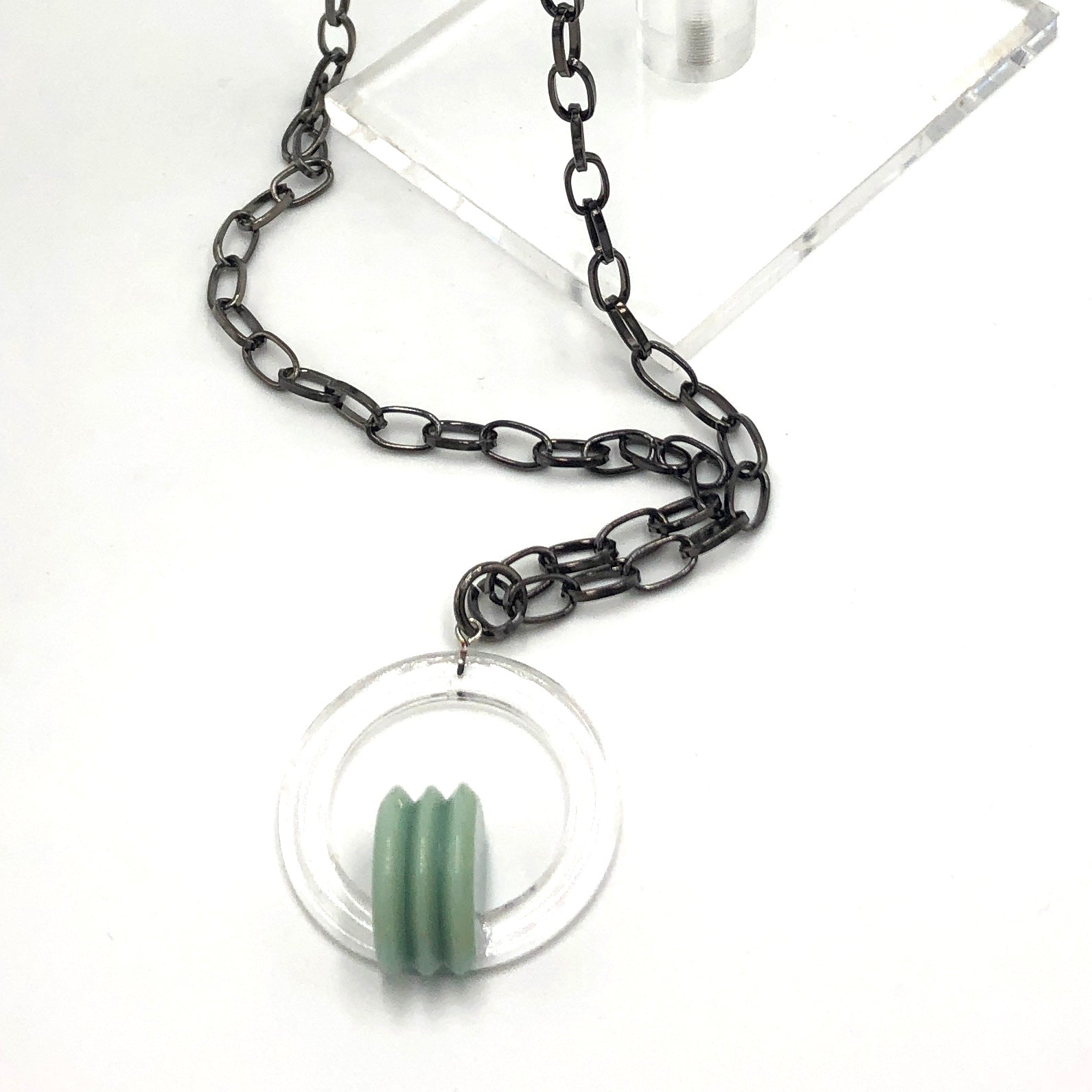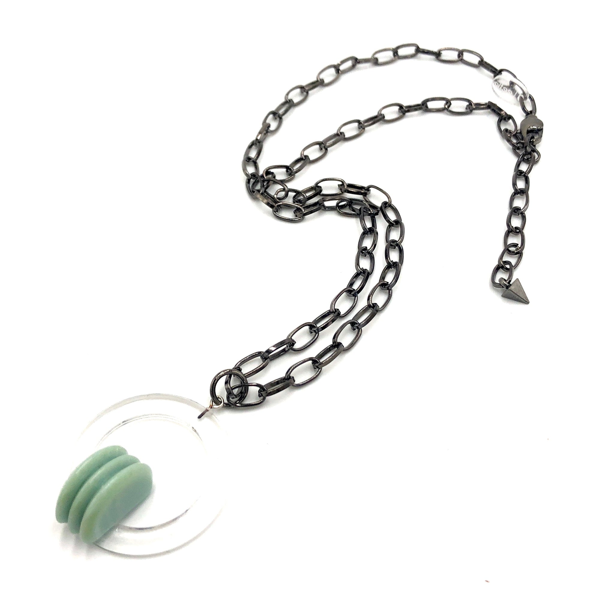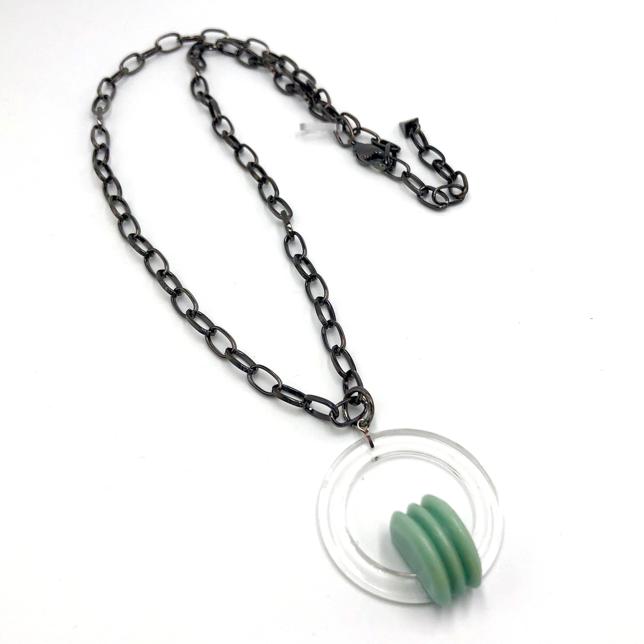 Light jade green carved arched resin pendant meets an epic hammered gunmetal chain necklace.  A limited piece from our Trinket Necklace collection. Vintage lucite parts from the 1960's stacked up with contemporary resin reproductions and paired with fine chain.  The chain is hypoallergenic gunmetal & in a flat link style.