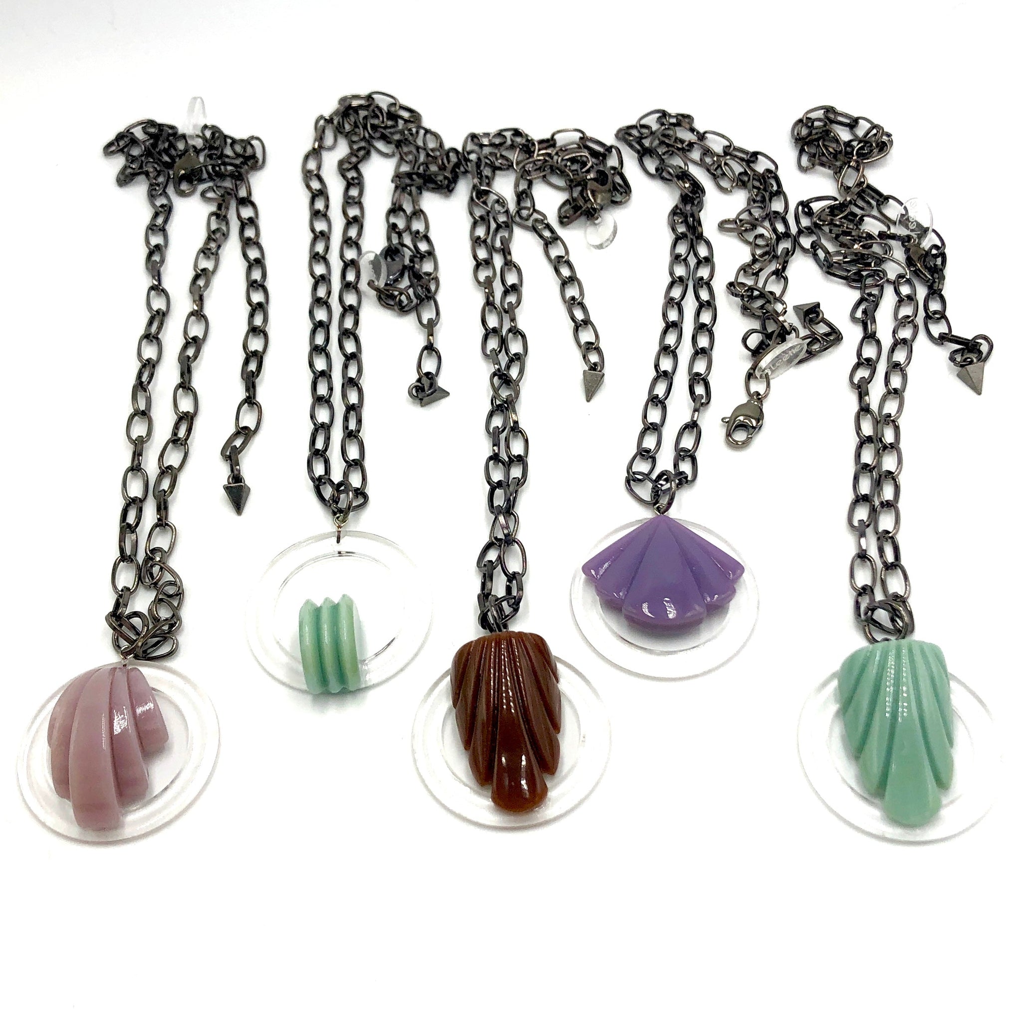 Our new Leetie Layering necklace line! We are going to be offering a collection of vintage lucite and resin pendants, hand soldered and paired with blackened gun metal. A collaboration with Three Beads & a Sting, each style is super limited & available in single lengths with an extender for adjustability. These are made to be worn in multiples and alongside other pieces of varying lengths.