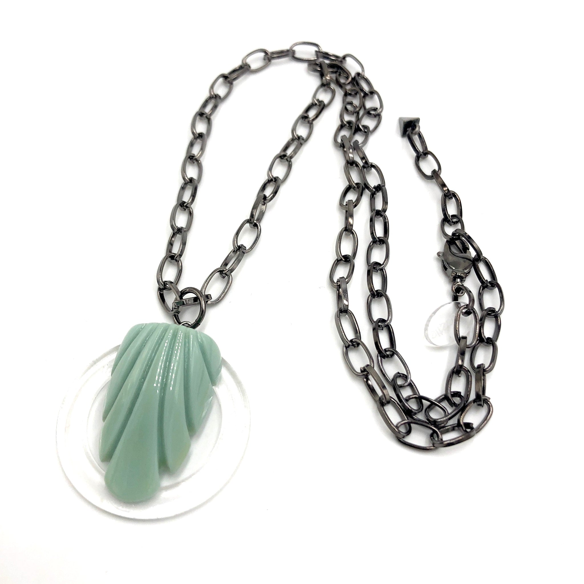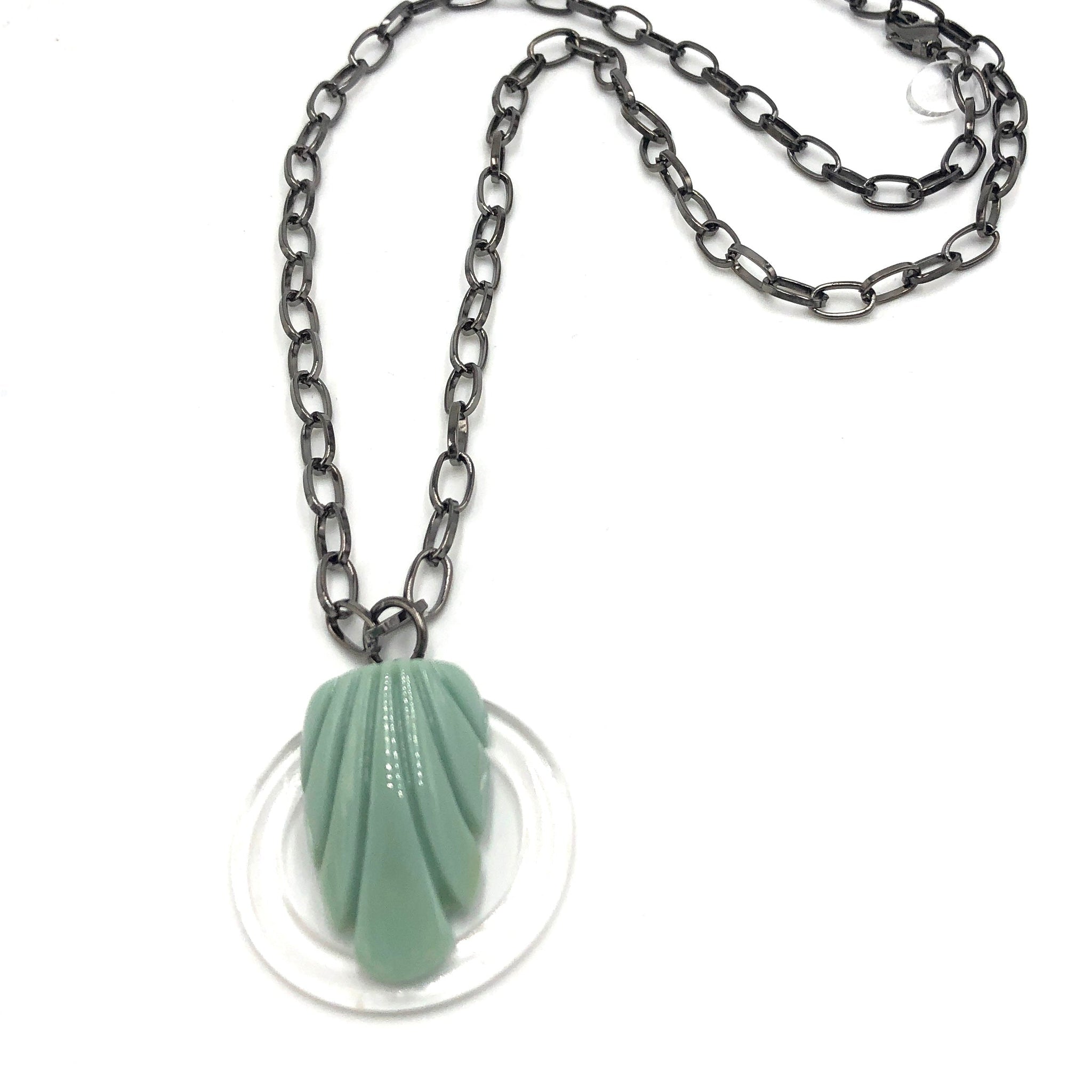 Light jade green carved resin pendant meets an epic hammered gunmetal chain necklace. A limited piece from our Trinket Necklace collection. Vintage lucite parts from the 1960's stacked up with contemporary resin reproductions and paired with fine chain. The chain is hypoallergenic gunmetal & in a flat link style.
