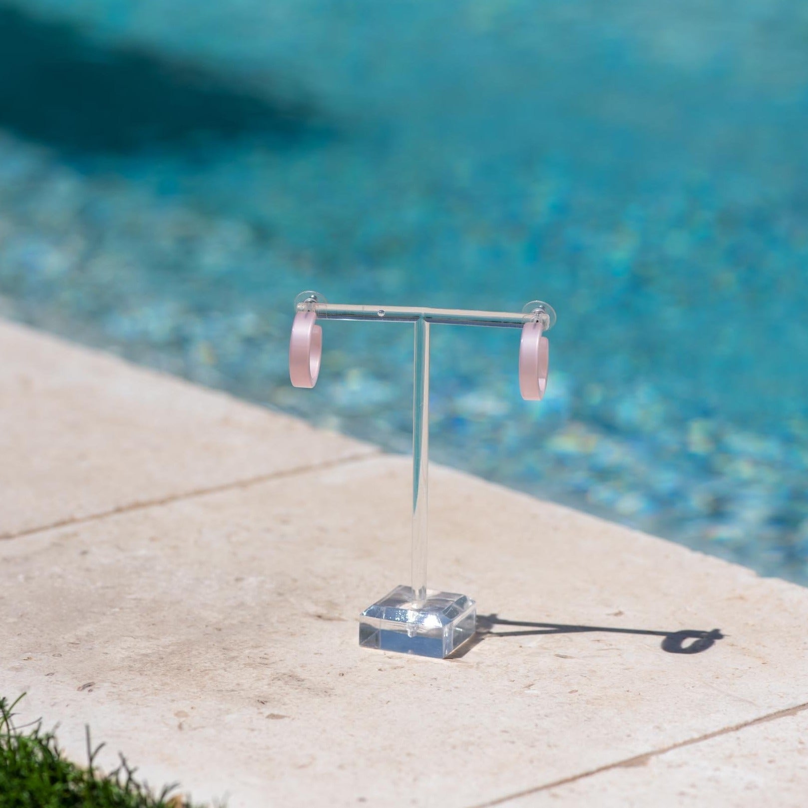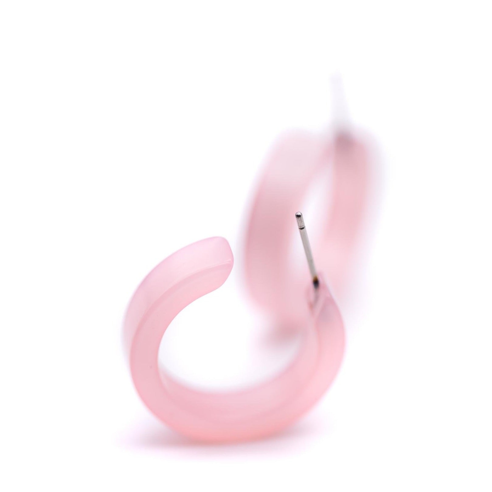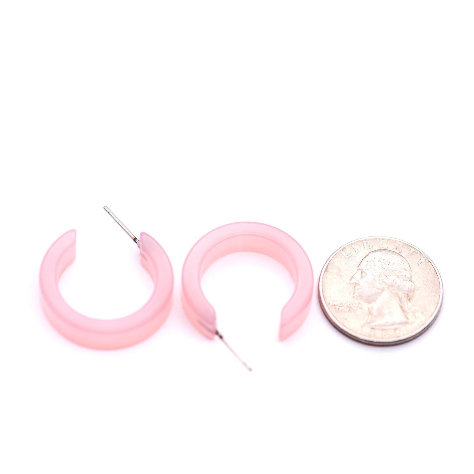 Light pink hoop earrings with a shiny moonglow finish. This is a fun style and is available in some of our most popular colors. It measures 1" or 25mm in diameter. A great size that's not to big & not too small & the perfect pop of color!