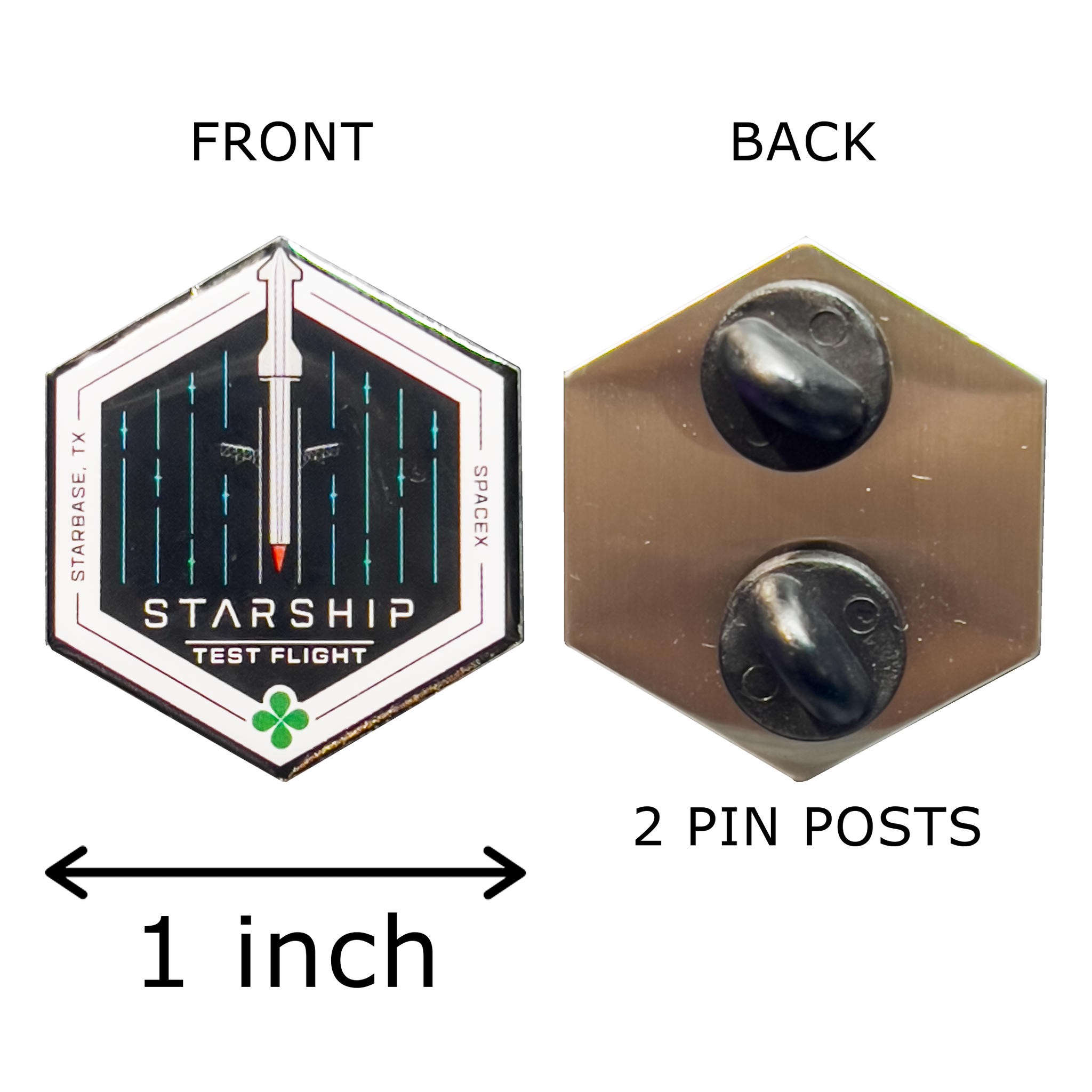 1 inch full color pin. This truly gorgeous mission patch inspired pin is a work of art! It has 2 pin posts to increase functionality; that means it will not spin upside down (no pun intended) when you wear it and it has two rubber pin backs to hold on tight so you won't lose it.