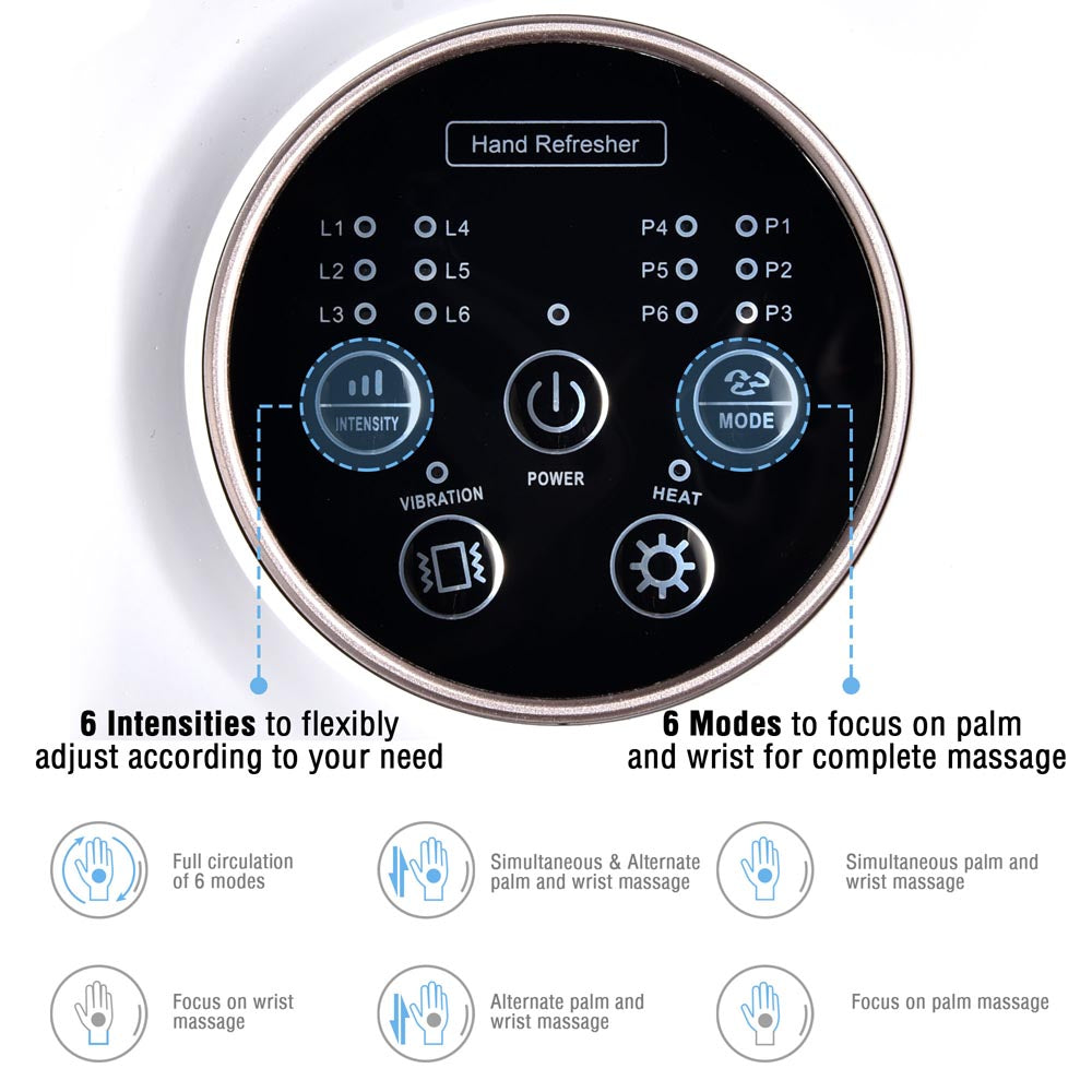 - 6 Modes & Intensities - 6 Preset Modes focus on different parts of hand to provide comprehensive massage for palm and wrist with compression; Adjust intensity in 6 levels on your demand, refreshen your hand to relieve discomfort from mouse hand, cold hand or numbness
