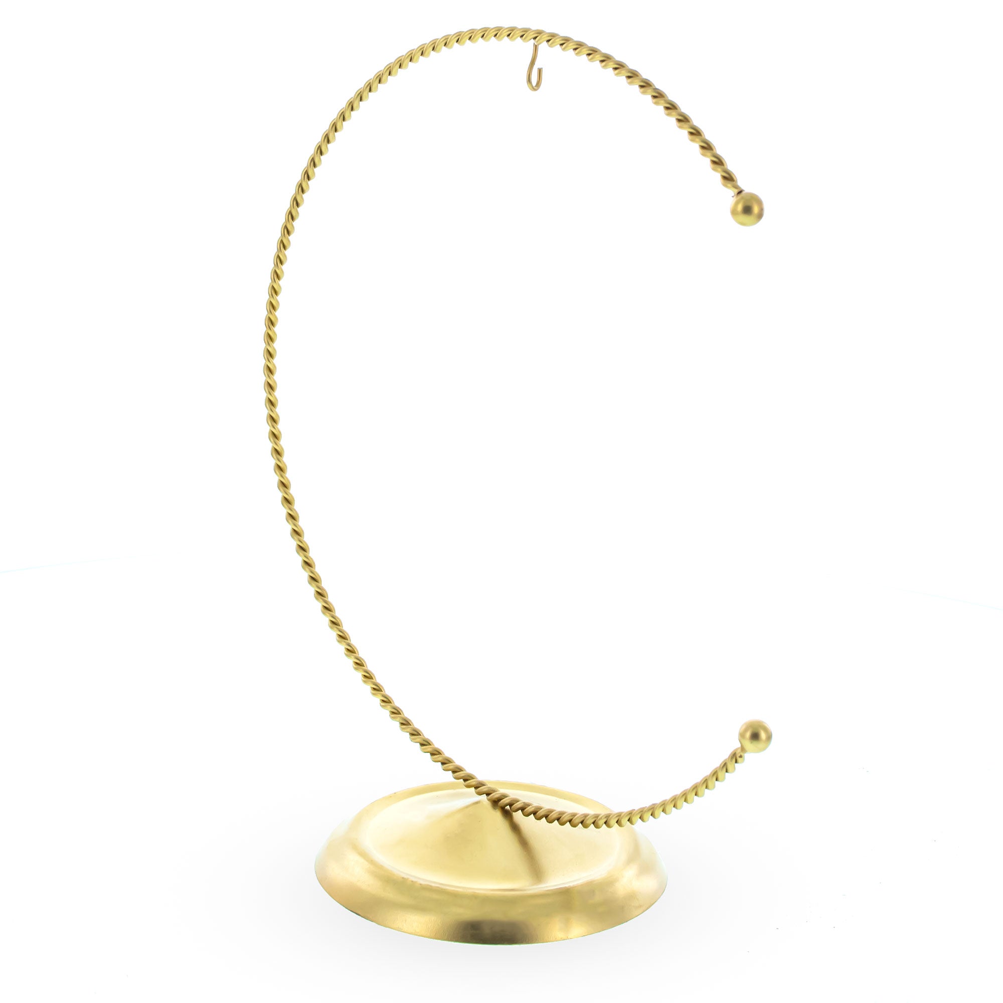 Display your favorite ornaments with a touch of handcrafted elegance using this twisted wire crescent ornament display stand. Featuring a gracefully arched design made from gold-coated, rope-style wire, this stand offers a charming twist on a classic crescent silhouette. The detailed spiral texture adds visual interest while the central hook holds ornaments, crystals, or small hanging décor securely in place. A smooth, weighted base ensures balance and stability on any flat surface.