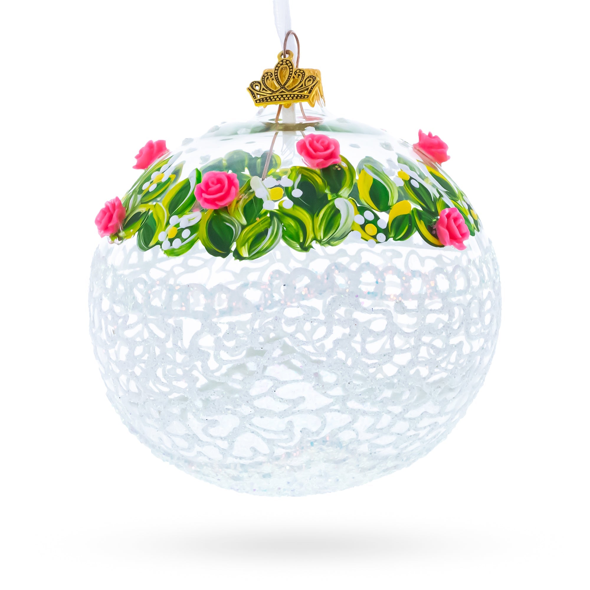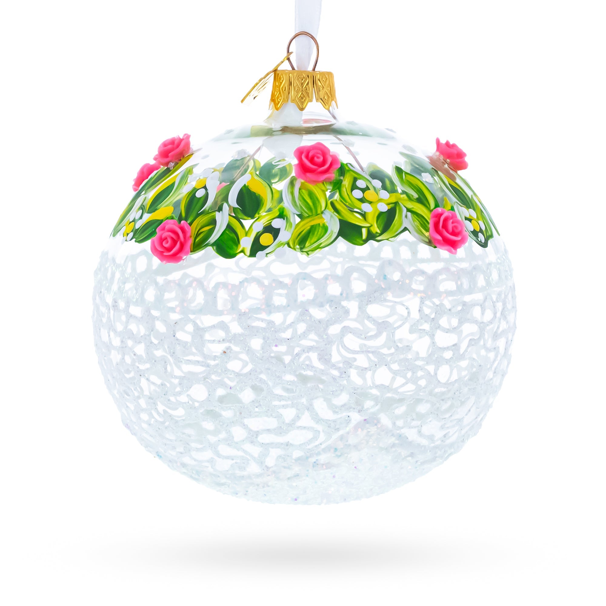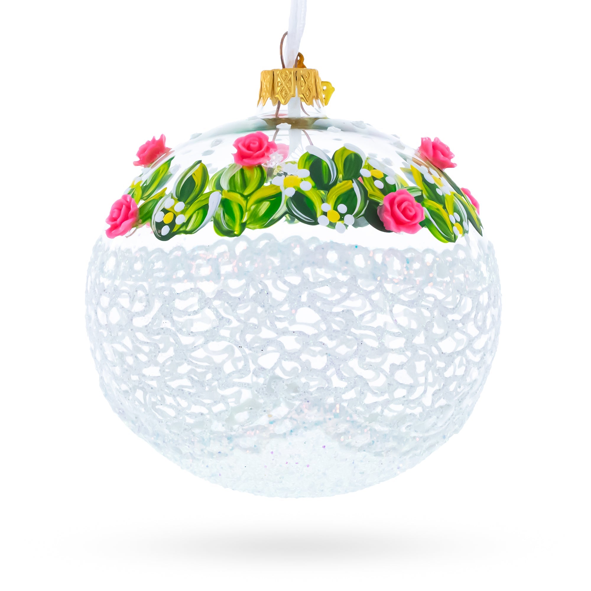 Dimensional Pink Roses Glass Ball Christmas Ornament 4 Inches