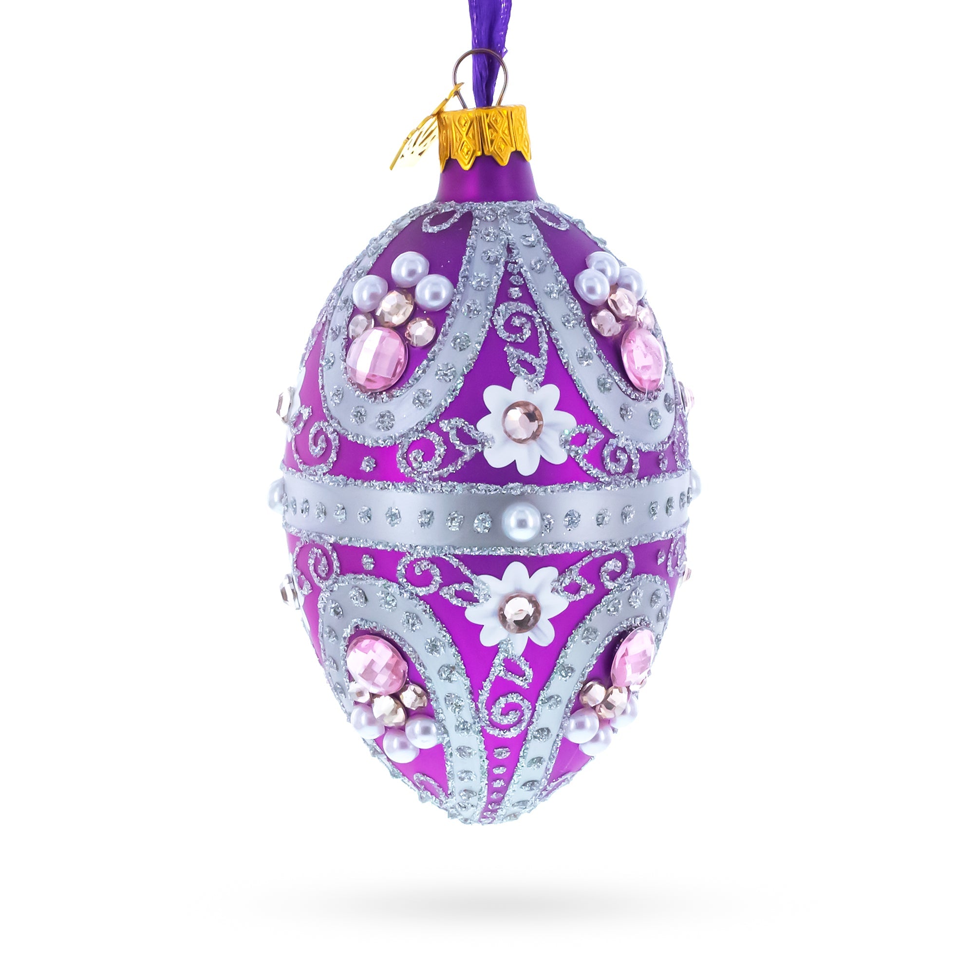 Purple Elegance with Pearls and Floral Accents Glass Egg Ornament 4 Inches