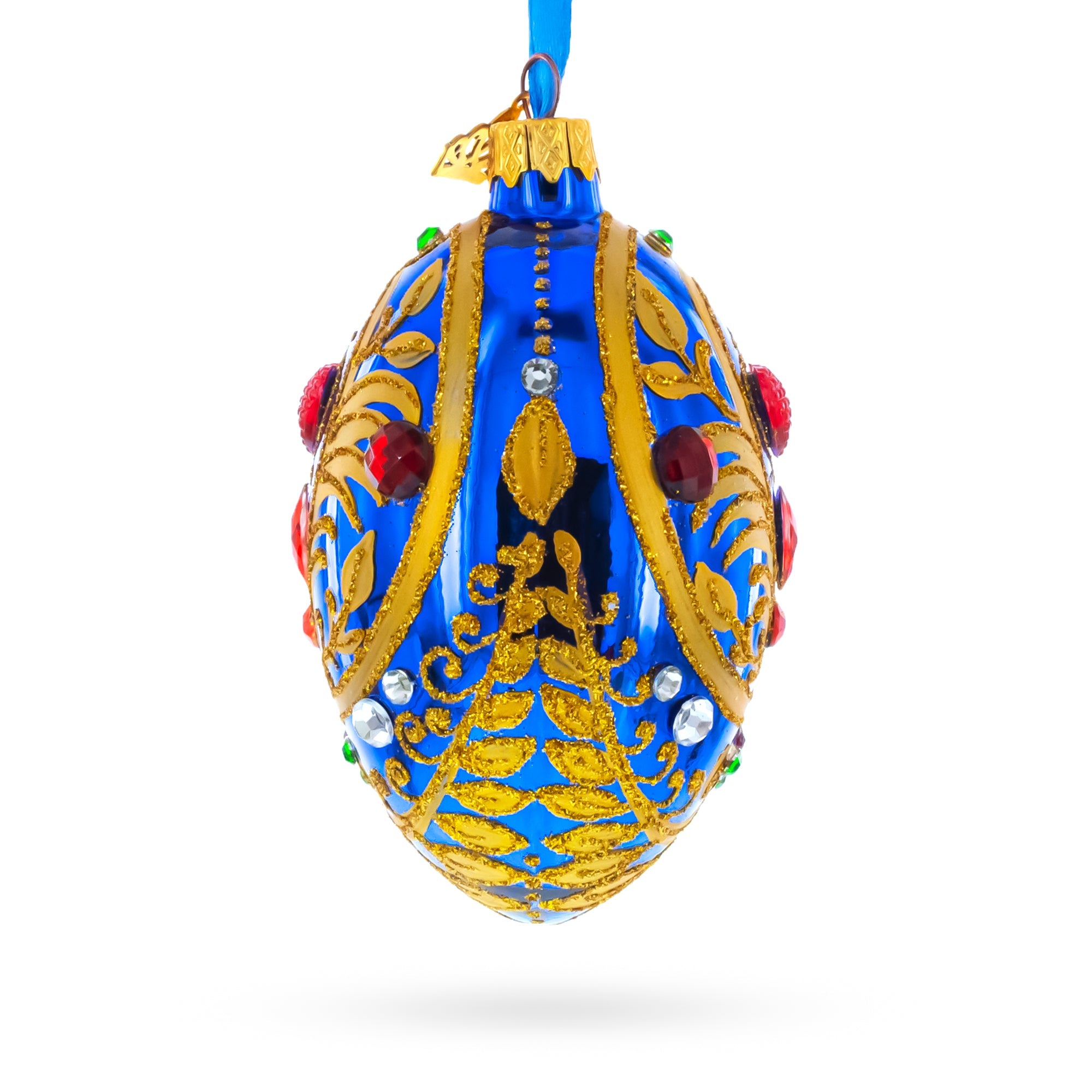 Royal Blue Regal Heart and Gemstones Embellished Glass Egg Ornament 4 Inches