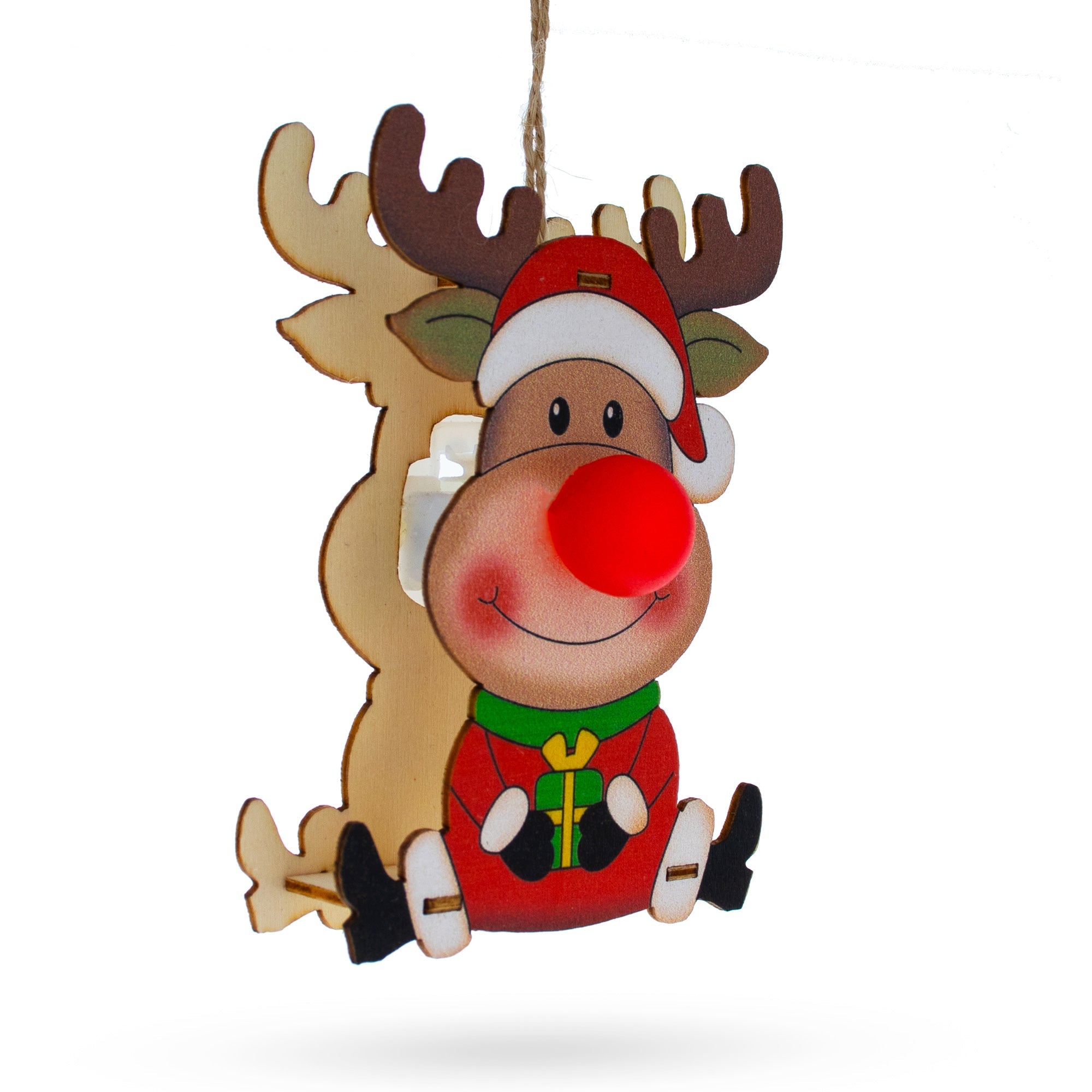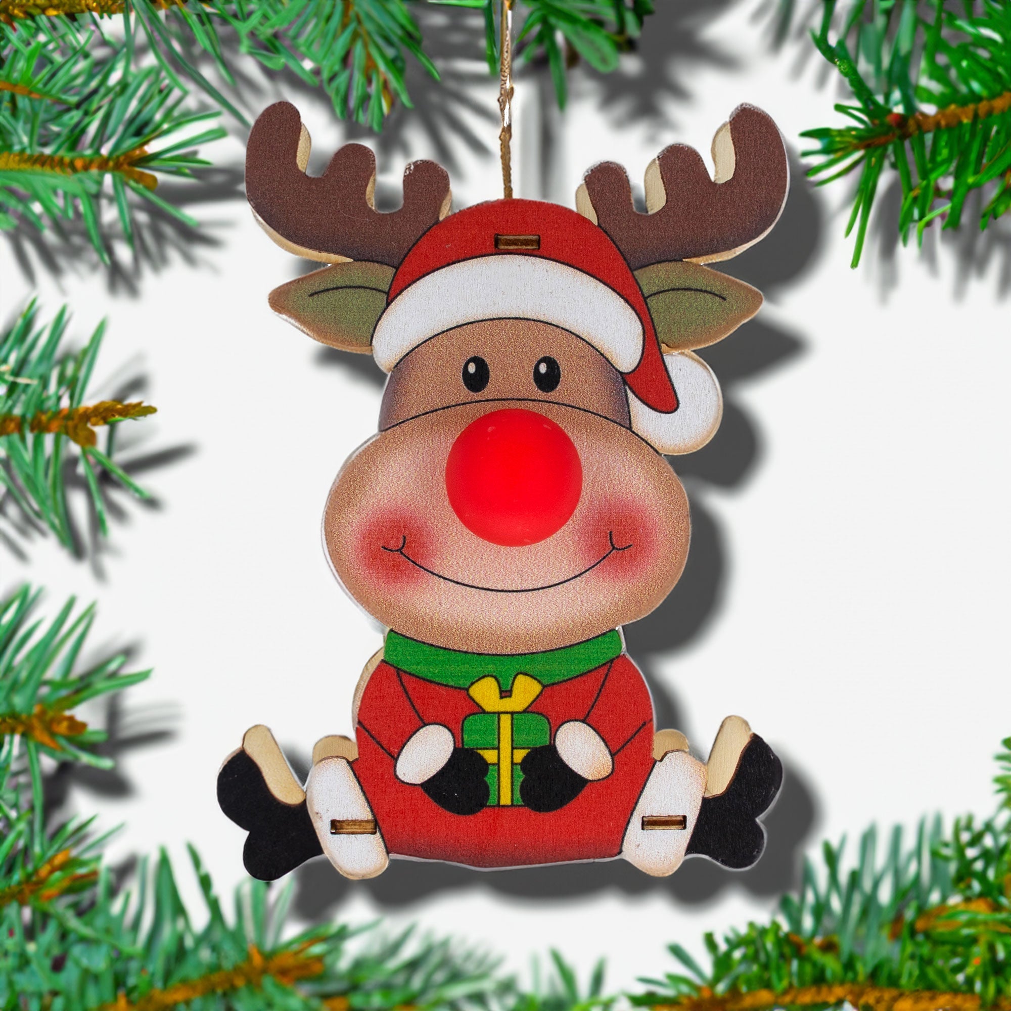 Wooden Reindeer with Present Christmas Ornament with Light Up Nose Cutout