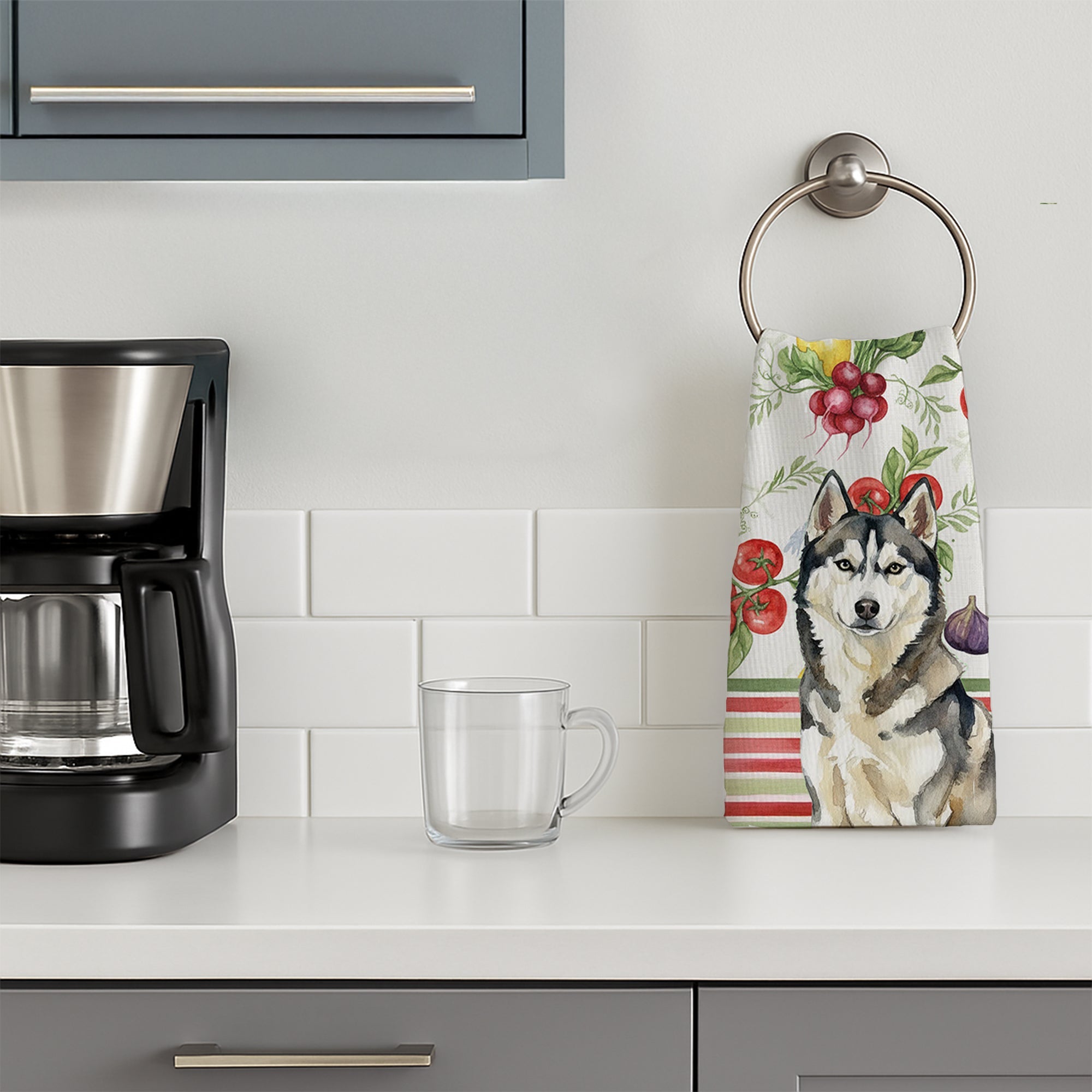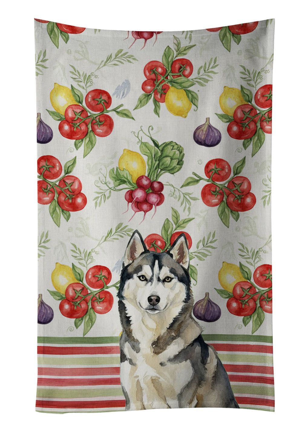 Shown here is the Agouti Siberian Husky Vegetables Kitchen Towel from Caroline's Treasures featuring artwork of a Siberian Husky in a Everyday design. The detailed illustration and vibrant colors make it a standout accent that celebrates both seasonal style and love for the subject. This image features a vibrant watercolor vegetable pattern with tomatoes, lemons, artichokes, figs, radishes, and leafy greens arranged in a repeating design, paired with classic red and green stripes. The bright, garden-fresh palette creates a cheerful, farmhouse-inspired look that feels lively, welcoming, and perfect for kitchen décor. Everyday décor celebrates personal style and the small moments that make a house feel like home. Thoughtful designs add warmth and personality that can be enjoyed year-round. Bring cozy everyday charm to your sink or powder room with a plush velour towel featuring original watercolor artwork. The front is a soft, color-rich minky polyester that polishes glassware to a brilliant shine; the back is 100% white cotton terry loop for quick absorbency on hands, dishes, and counters. Artwork is dyed into the fibers for lasting color that won’t crack or peel. Finished edges keep the shape wash after wash. Size: 15" x 25". Machine wash; tumble dry low. Designed and printed in the USA. Perfect for: Kitchen counters, ovens, and towel bars, everyday drying and cleanup, -themed kitchens, or year-round use for Siberian Husky lovers. Siberian Huskies are energetic working dogs known for their endurance and striking appearance. This northern breed is admired for its intelligence, independence, and strong pack instincts. Makes a heartfelt gift for: Siberian Husky owners, lovers, Everyday gifts, pet parents, friends who adore their Siberian Husky, or anyone celebrating .