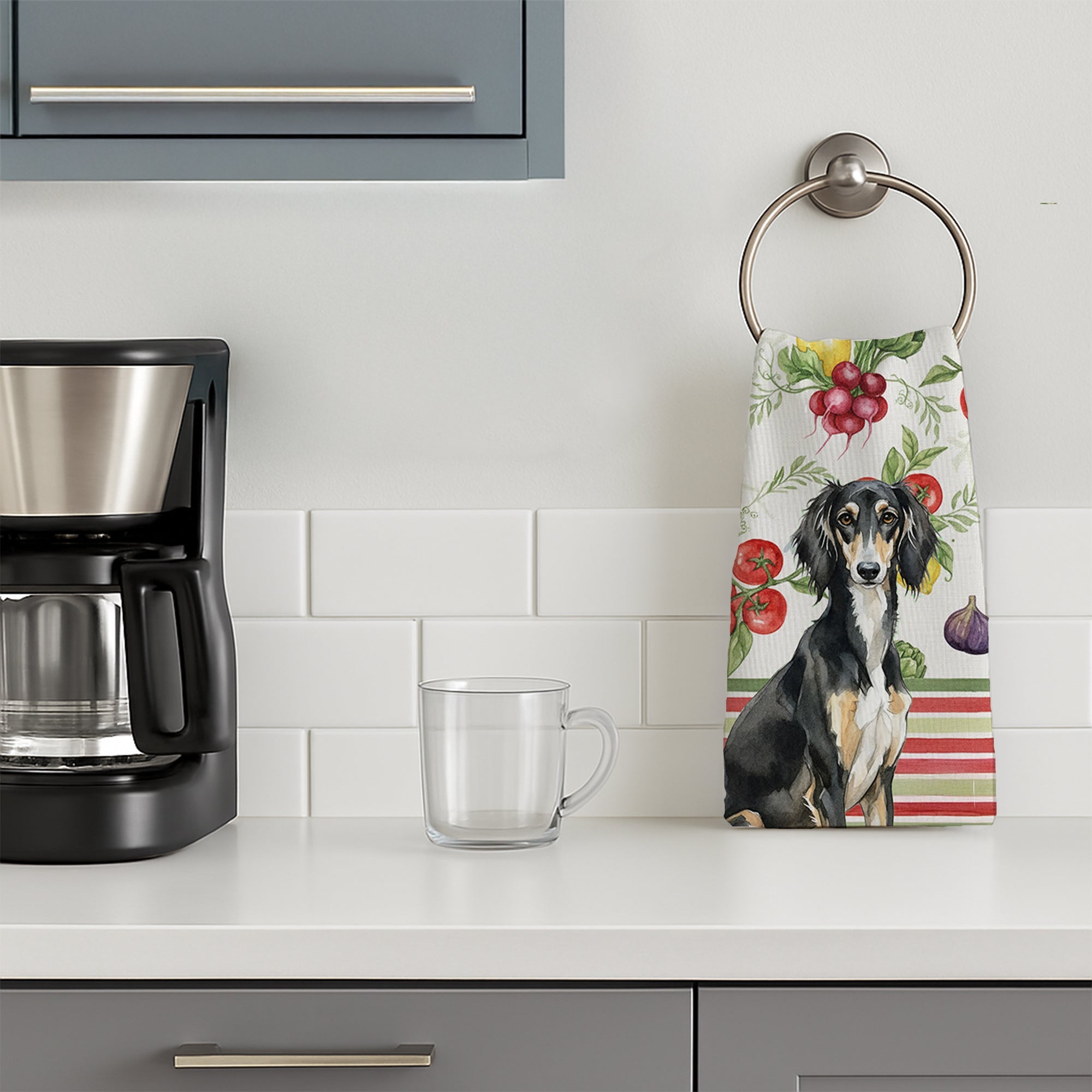 Shown here is the Black and Tan Saluki Vegetables Kitchen Towel from Caroline's Treasures featuring artwork of a Saluki in a Everyday design. The detailed illustration and vibrant colors make it a standout accent that celebrates both seasonal style and love for the subject. This image features a vibrant watercolor vegetable pattern with tomatoes, lemons, artichokes, figs, radishes, and leafy greens arranged in a repeating design, paired with classic red and green stripes. The bright, garden-fresh palette creates a cheerful, farmhouse-inspired look that feels lively, welcoming, and perfect for kitchen décor. Everyday décor celebrates personal style and the small moments that make a house feel like home. Thoughtful designs add warmth and personality that can be enjoyed year-round. Bring cozy everyday charm to your sink or powder room with a plush velour towel featuring original watercolor artwork. The front is a soft, color-rich minky polyester that polishes glassware to a brilliant shine; the back is 100% white cotton terry loop for quick absorbency on hands, dishes, and counters. Artwork is dyed into the fibers for lasting color that won’t crack or peel. Finished edges keep the shape wash after wash. Size: 15" x 25". Machine wash; tumble dry low. Designed and printed in the USA. Perfect for: Kitchen counters, ovens, and towel bars, everyday drying and cleanup, -themed kitchens, or year-round use for Saluki lovers. Salukis are elegant sighthounds known for their speed and graceful build. This ancient breed is admired for its independence, intelligence, and quiet dignity. Makes a heartfelt gift for: Saluki owners, lovers, Everyday gifts, pet parents, friends who adore their Saluki, or anyone celebrating .