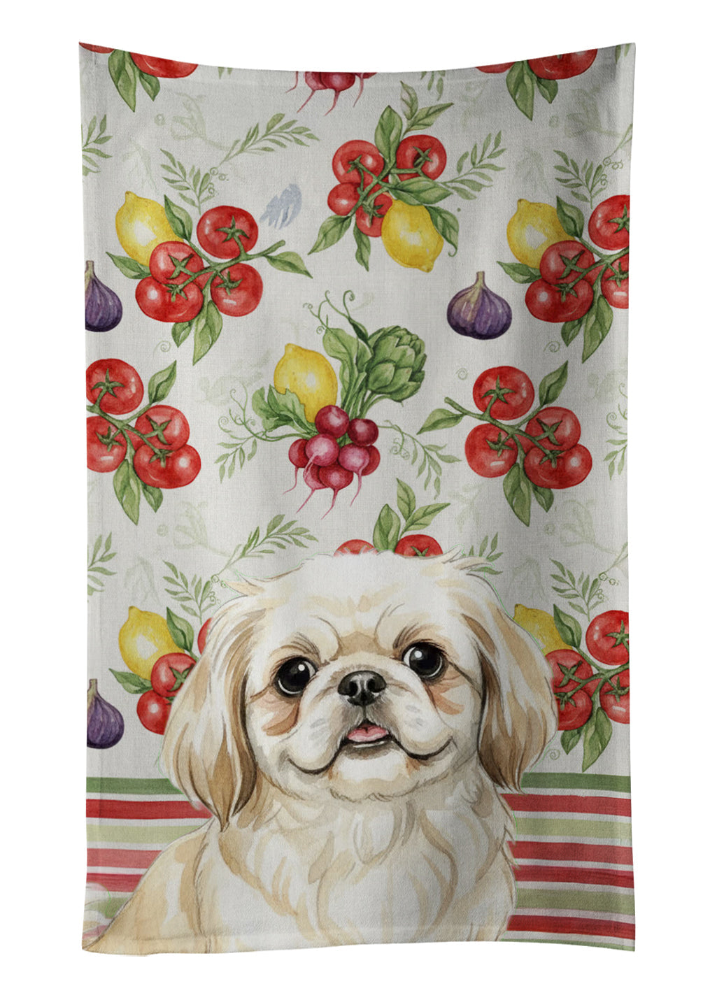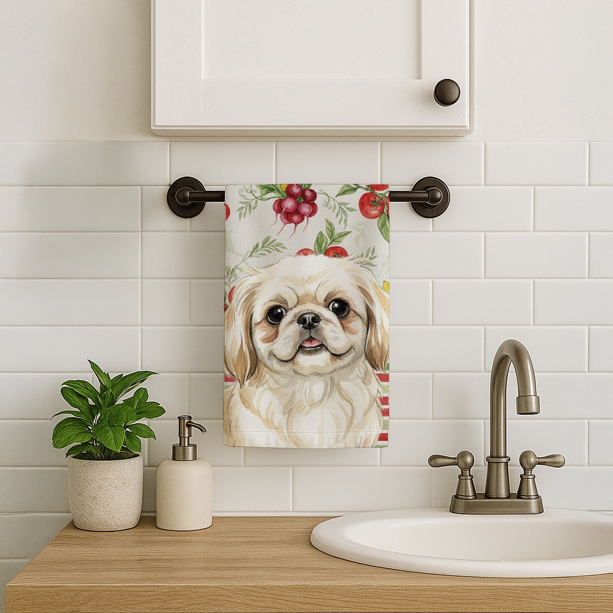 Shown here is the Cream Pekingese Vegetables Kitchen Towel from Caroline's Treasures featuring artwork of a Pekingese in a Everyday design. The detailed illustration and vibrant colors make it a standout accent that celebrates both seasonal style and love for the subject. This image features a vibrant watercolor vegetable pattern with tomatoes, lemons, artichokes, figs, radishes, and leafy greens arranged in a repeating design, paired with classic red and green stripes. The bright, garden-fresh palette creates a cheerful, farmhouse-inspired look that feels lively, welcoming, and perfect for kitchen décor. Everyday décor celebrates personal style and the small moments that make a house feel like home. Thoughtful designs add warmth and personality that can be enjoyed year-round. Bring cozy everyday charm to your sink or powder room with a plush velour towel featuring original watercolor artwork. The front is a soft, color-rich minky polyester that polishes glassware to a brilliant shine; the back is 100% white cotton terry loop for quick absorbency on hands, dishes, and counters. Artwork is dyed into the fibers for lasting color that won’t crack or peel. Finished edges keep the shape wash after wash. Size: 15" x 25". Machine wash; tumble dry low. Designed and printed in the USA. Perfect for: Kitchen counters, ovens, and towel bars, everyday drying and cleanup, -themed kitchens, or year-round use for Pekingese lovers. Pekingese are regal companion dogs known for their distinctive appearance and confident demeanor. This ancient breed is cherished for its loyalty, independence, and dignified presence. Makes a heartfelt gift for: Pekingese owners, lovers, Everyday gifts, pet parents, friends who adore their Pekingese, or anyone celebrating .
