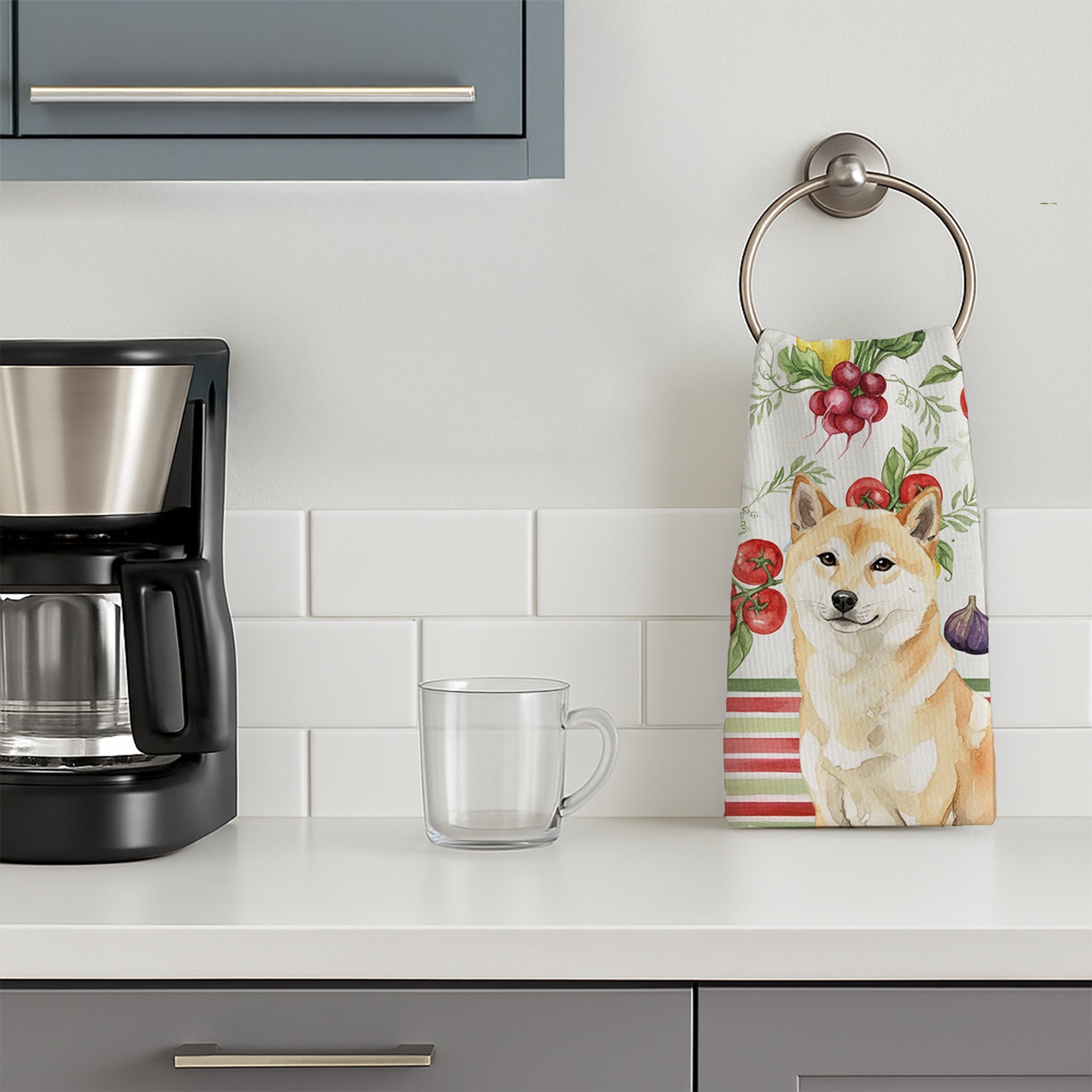 Shown here is the Cream Shiba Inu Vegetables Kitchen Towel from Caroline's Treasures featuring artwork of a Shiba Inu in a Everyday design. The detailed illustration and vibrant colors make it a standout accent that celebrates both seasonal style and love for the subject. This image features a vibrant watercolor vegetable pattern with tomatoes, lemons, artichokes, figs, radishes, and leafy greens arranged in a repeating design, paired with classic red and green stripes. The bright, garden-fresh palette creates a cheerful, farmhouse-inspired look that feels lively, welcoming, and perfect for kitchen décor. Everyday décor celebrates personal style and the small moments that make a house feel like home. Thoughtful designs add warmth and personality that can be enjoyed year-round. Bring cozy everyday charm to your sink or powder room with a plush velour towel featuring original watercolor artwork. The front is a soft, color-rich minky polyester that polishes glassware to a brilliant shine; the back is 100% white cotton terry loop for quick absorbency on hands, dishes, and counters. Artwork is dyed into the fibers for lasting color that won’t crack or peel. Finished edges keep the shape wash after wash. Size: 15" x 25". Machine wash; tumble dry low. Designed and printed in the USA. Perfect for: Kitchen counters, ovens, and towel bars, everyday drying and cleanup, -themed kitchens, or year-round use for Shiba Inu lovers. Shiba Inus are confident companion dogs known for their alert expression and independent spirit. This Japanese breed is admired for its intelligence, loyalty, and fox-like appearance. Makes a heartfelt gift for: Shiba Inu owners, lovers, Everyday gifts, pet parents, friends who adore their Shiba Inu, or anyone celebrating .
