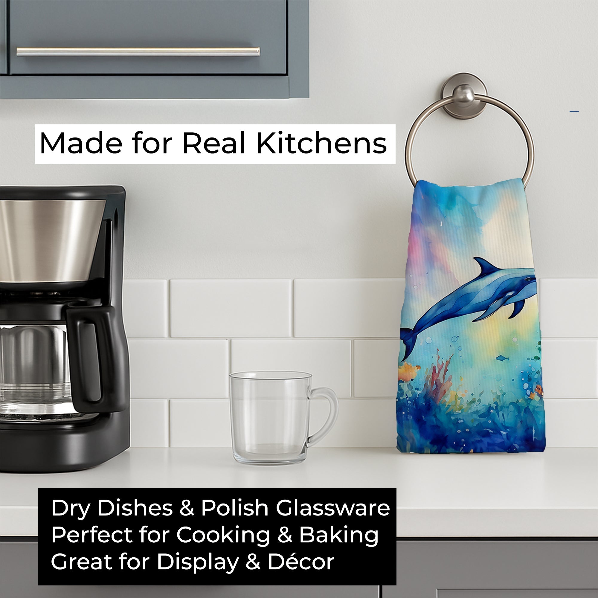Shown here is the Dolphin Kitchen Towel from Caroline's Treasures featuring artwork of a Dolphin in a Everyday design. The detailed illustration and vibrant colors make it a standout accent that celebrates both seasonal style and love for the subject. Set sail into seaside style with our Nautical Collection. Featuring coastal-inspired designs anchored in classic ocean motifs and breezy charm, this collection brings relaxed personality and timeless décor to your home and thoughtful gifts for lovers of coastal living. Everyday décor celebrates personal style and the small moments that make a house feel like home. Thoughtful designs add warmth and personality that can be enjoyed year-round. Bring cozy everyday charm to your sink or powder room with a plush velour towel featuring original watercolor artwork. The front is a soft, color-rich minky polyester that polishes glassware to a brilliant shine; the back is 100% white cotton terry loop for quick absorbency on hands, dishes, and counters. Artwork is dyed into the fibers for lasting color that won’t crack or peel. Finished edges keep the shape wash after wash. Size: 15" x 25". Machine wash; tumble dry low. Designed and printed in the USA. Perfect for: Kitchen counters, ovens, and towel bars, everyday drying and cleanup, Fish-themed kitchens, or year-round use for Dolphin lovers. Dolphins are streamlined marine mammals with smooth bodies. Their graceful movement conveys intelligence and energy. Makes a heartfelt gift for: Dolphin owners, Fish lovers, Everyday gifts, pet parents, friends who adore their Dolphin, or anyone celebrating Fish.