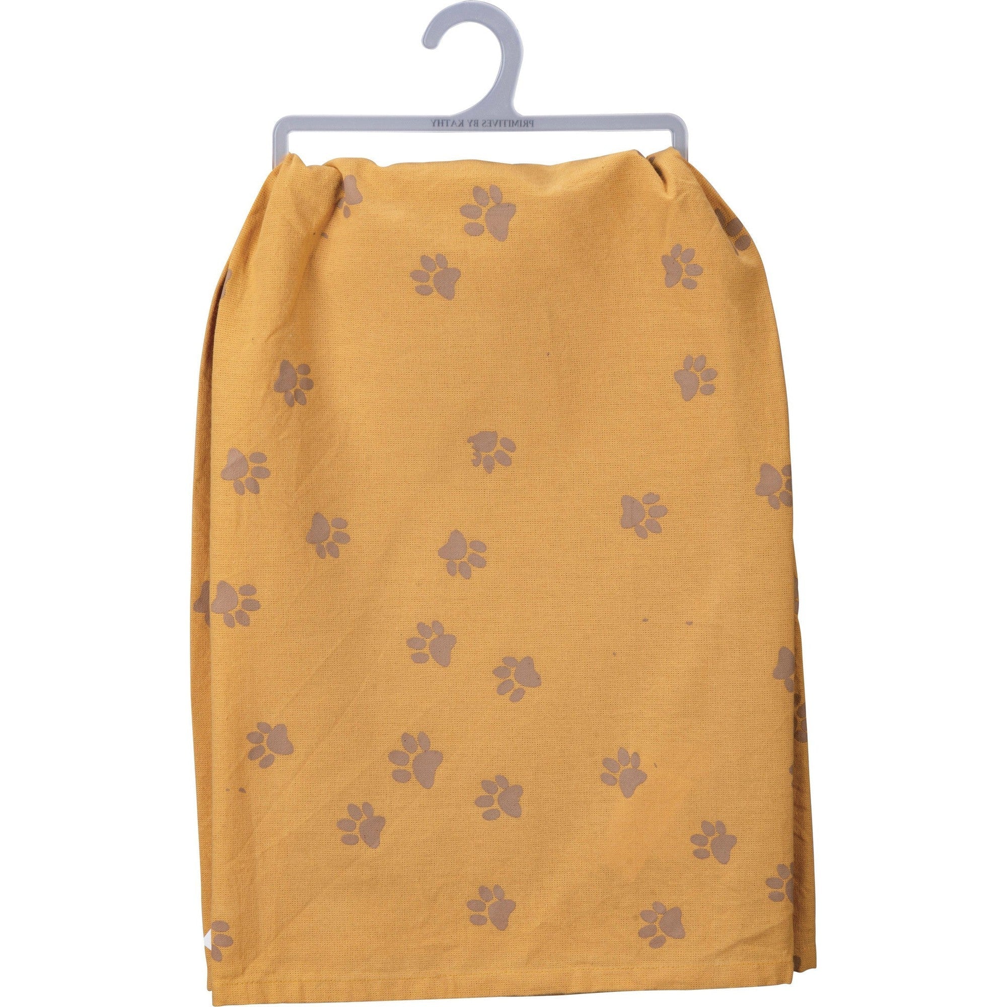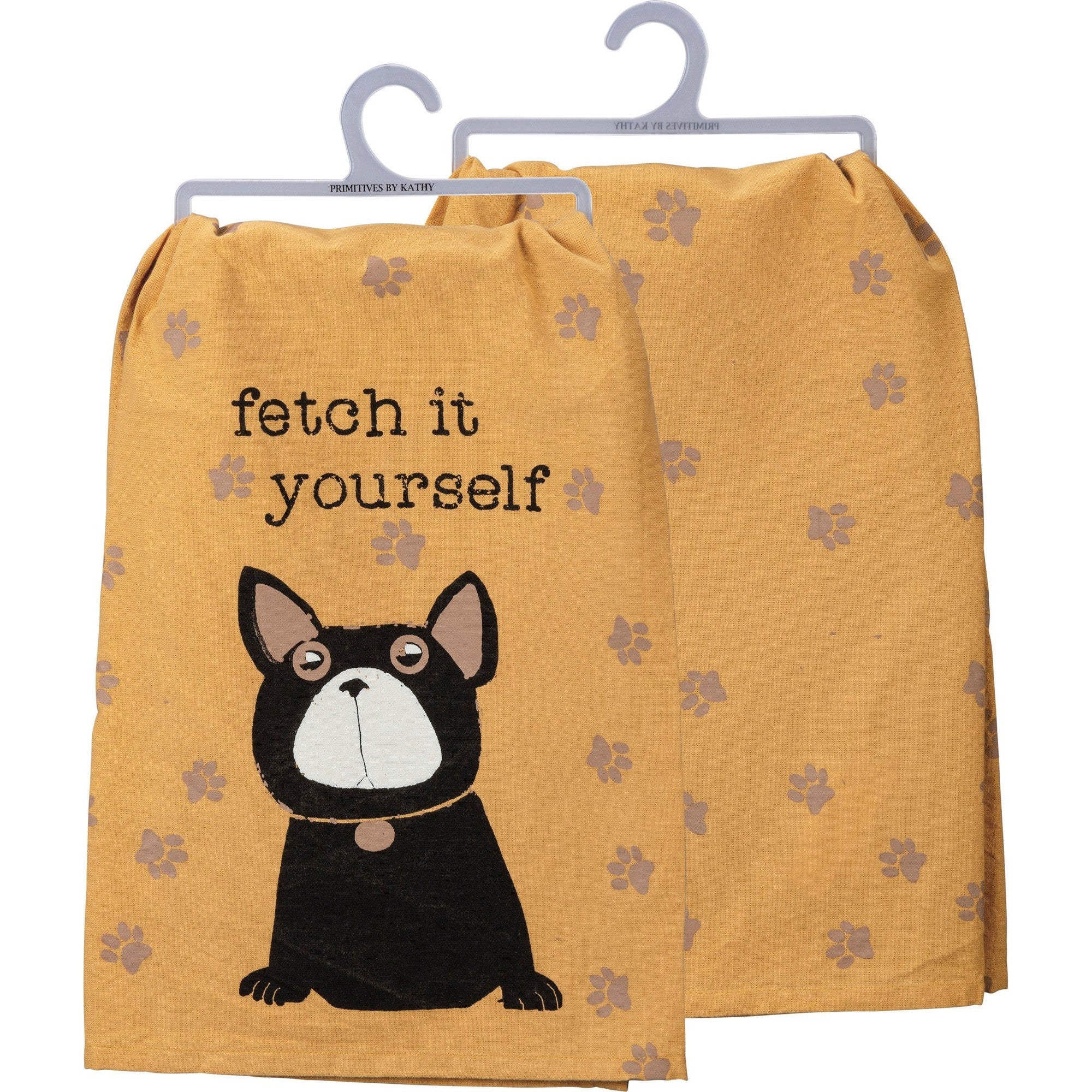 A rustic-inspired cotton kitchen towel featuring a "Fetch It Yourself" sentiment with dog and paw print designs throughout.