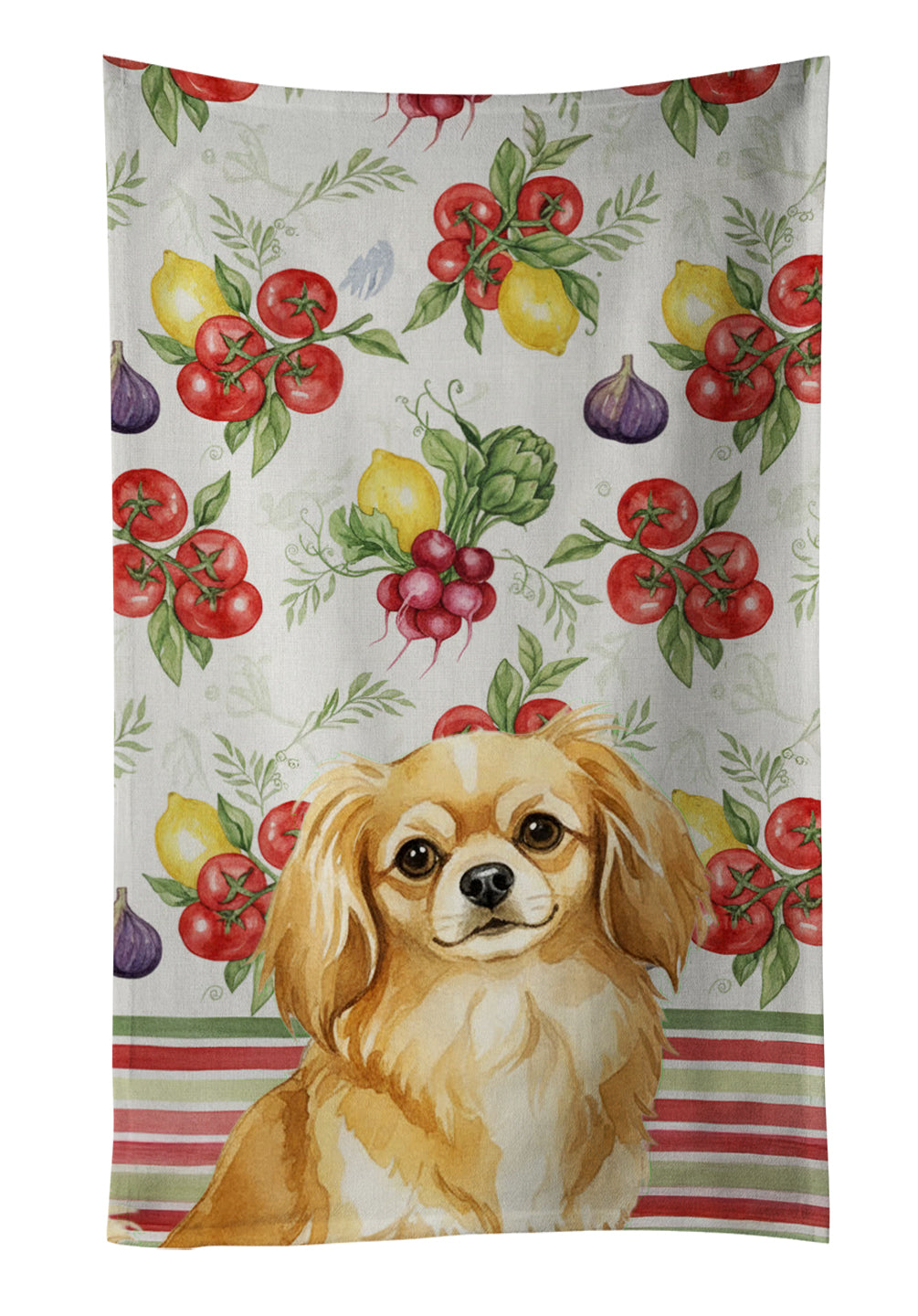 Shown here is the Gold Tibetan Spaniel Vegetables Kitchen Towel from Caroline's Treasures featuring artwork of a Tibetan Spaniel in a Everyday design. The detailed illustration and vibrant colors make it a standout accent that celebrates both seasonal style and love for the subject. This image features a vibrant watercolor vegetable pattern with tomatoes, lemons, artichokes, figs, radishes, and leafy greens arranged in a repeating design, paired with classic red and green stripes. The bright, garden-fresh palette creates a cheerful, farmhouse-inspired look that feels lively, welcoming, and perfect for kitchen décor. Everyday décor celebrates personal style and the small moments that make a house feel like home. Thoughtful designs add warmth and personality that can be enjoyed year-round. Bring cozy everyday charm to your sink or powder room with a plush velour towel featuring original watercolor artwork. The front is a soft, color-rich minky polyester that polishes glassware to a brilliant shine; the back is 100% white cotton terry loop for quick absorbency on hands, dishes, and counters. Artwork is dyed into the fibers for lasting color that won’t crack or peel. Finished edges keep the shape wash after wash. Size: 15" x 25". Machine wash; tumble dry low. Designed and printed in the USA. Perfect for: Kitchen counters, ovens, and towel bars, everyday drying and cleanup, -themed kitchens, or year-round use for Tibetan Spaniel lovers. Tibetan Spaniels are small companion dogs known for their intelligence and alert nature. This breed is cherished for its loyalty, independence, and affectionate personality. Makes a heartfelt gift for: Tibetan Spaniel owners, lovers, Everyday gifts, pet parents, friends who adore their Tibetan Spaniel, or anyone celebrating .