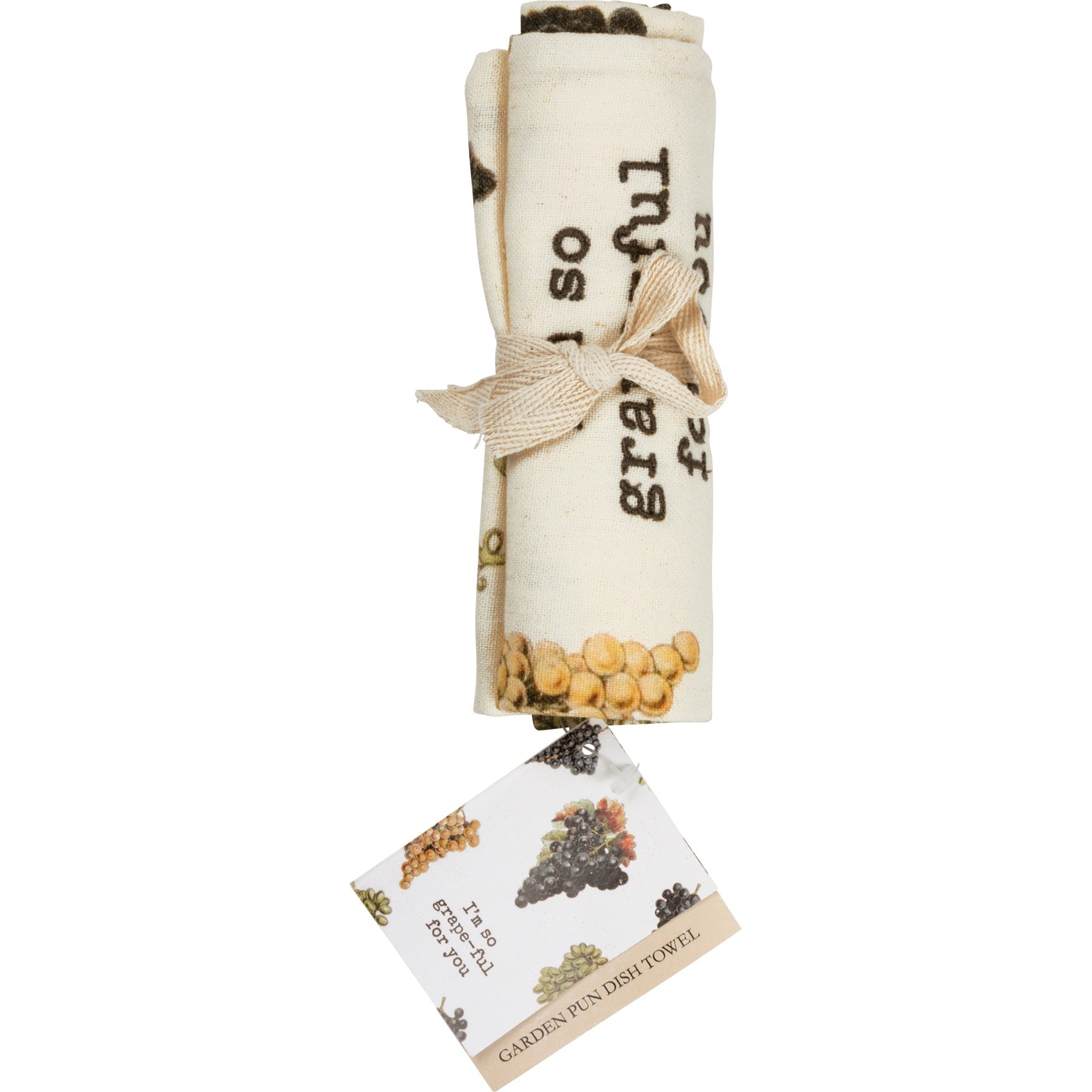 A cotton linen blend kitchen towel featuring all-over retro style grape bunch designs and punny embroidered "I'm So Grape-ful For You" sentiment. Features a cotton tape loop in the corner for easy hanging. Towel comes rolled and wrapped with cotton tape and features a hangtag displaying the full design.