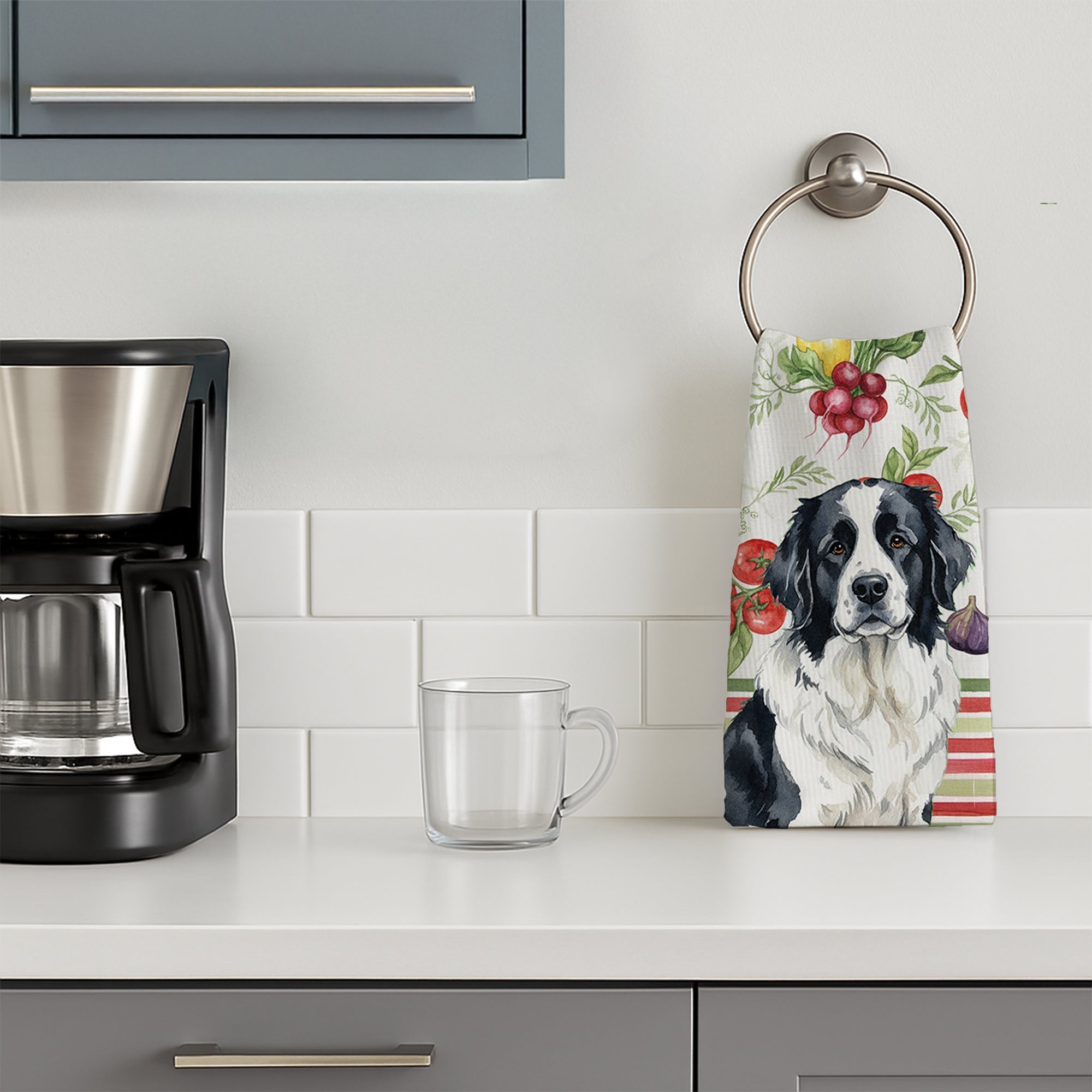 Shown here is the Landseer Newfoundland Vegetables Kitchen Towel from Caroline's Treasures featuring artwork of a Newfoundland in a Everyday design. The detailed illustration and vibrant colors make it a standout accent that celebrates both seasonal style and love for the subject. This image features a vibrant watercolor vegetable pattern with tomatoes, lemons, artichokes, figs, radishes, and leafy greens arranged in a repeating design, paired with classic red and green stripes. The bright, garden-fresh palette creates a cheerful, farmhouse-inspired look that feels lively, welcoming, and perfect for kitchen décor. Everyday décor celebrates personal style and the small moments that make a house feel like home. Thoughtful designs add warmth and personality that can be enjoyed year-round. Bring cozy everyday charm to your sink or powder room with a plush velour towel featuring original watercolor artwork. The front is a soft, color-rich minky polyester that polishes glassware to a brilliant shine; the back is 100% white cotton terry loop for quick absorbency on hands, dishes, and counters. Artwork is dyed into the fibers for lasting color that won’t crack or peel. Finished edges keep the shape wash after wash. Size: 15" x 25". Machine wash; tumble dry low. Designed and printed in the USA. Perfect for: Kitchen counters, ovens, and towel bars, everyday drying and cleanup, -themed kitchens, or year-round use for Newfoundland lovers. Newfoundlands are gentle working dogs known for their strength and sweet temperament. Often called Newfies, this breed is cherished for its loyalty, patience, and calm confidence. Makes a heartfelt gift for: Newfoundland owners, lovers, Everyday gifts, pet parents, friends who adore their Newfoundland, or anyone celebrating .