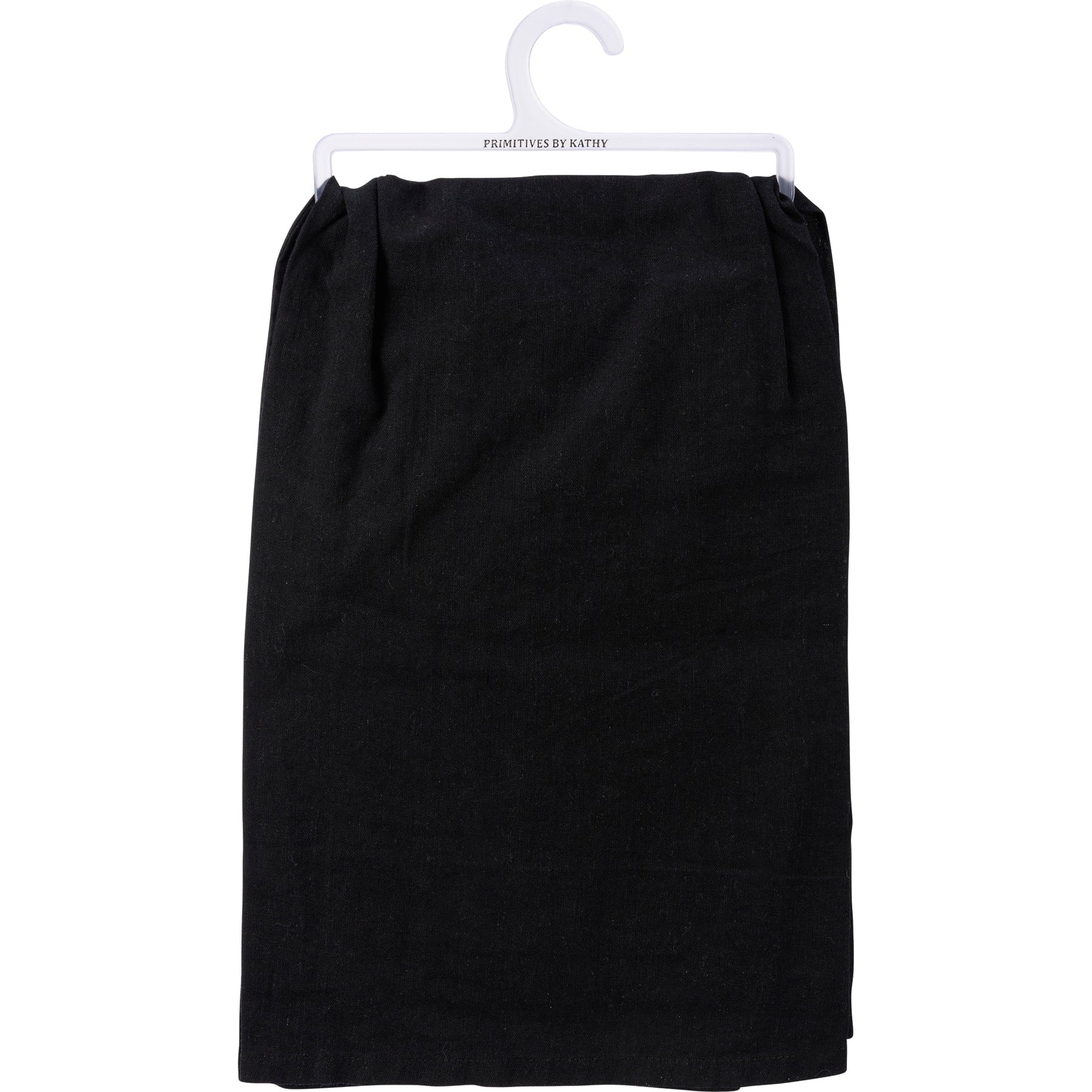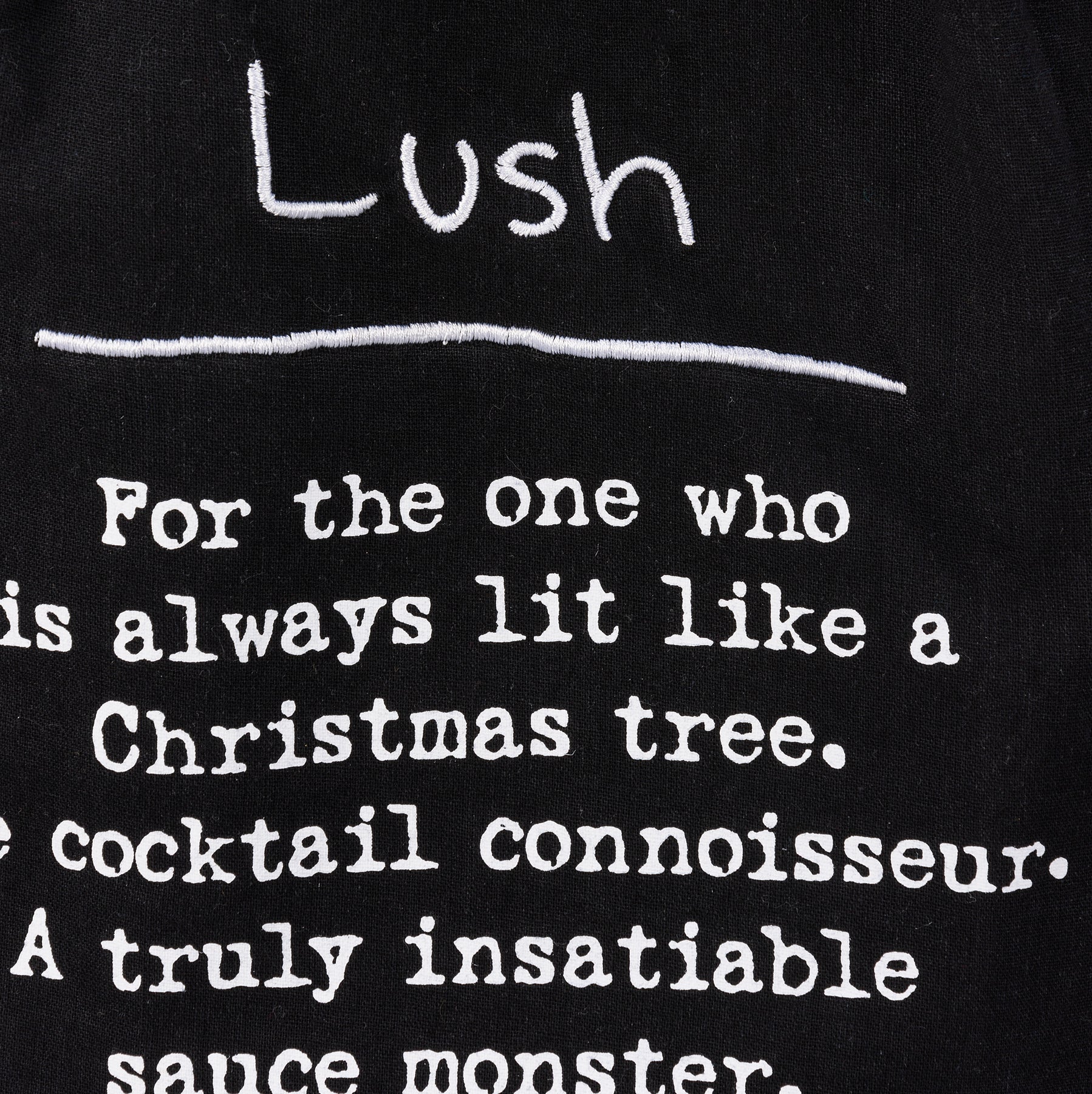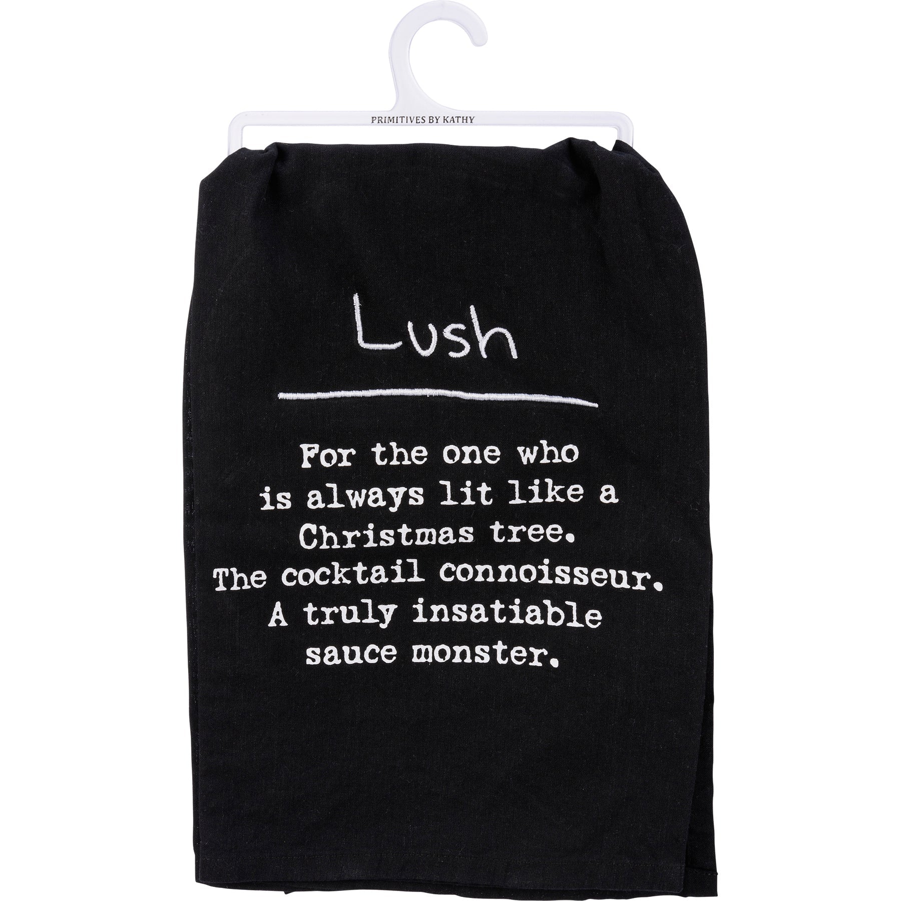 A black cotton kitchen towel featuring an embroidered and printed "Lush - For The One Who Is Always Lit Like A Christmas Tree. The Cocktail Connoisseur. A Truly Insatiable Sauce Monster." sentiment that makes the item feel tailor-made for the lushes in your life.
