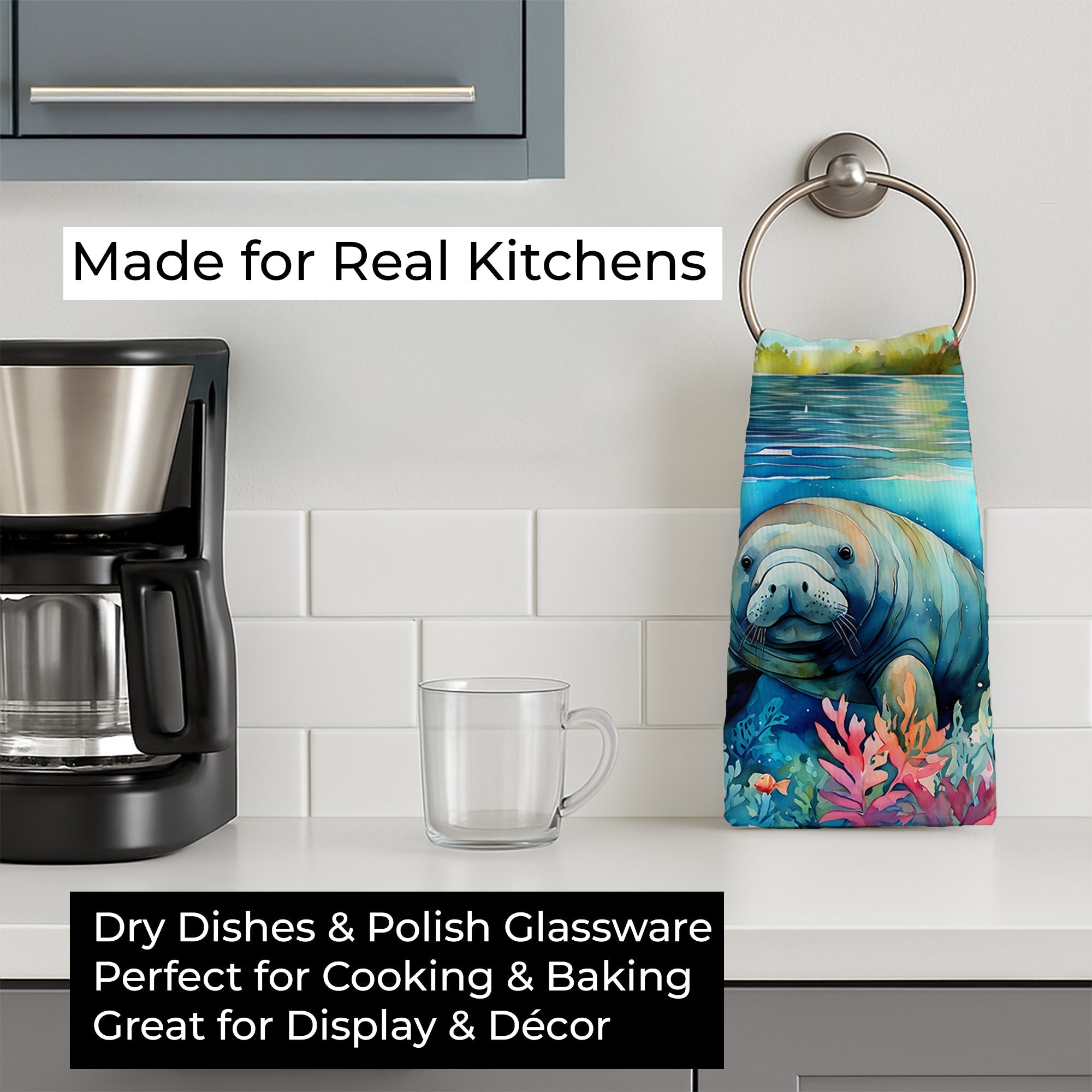 Shown here is the Manatee Kitchen Towel from Caroline's Treasures featuring artwork of a Manatee in a Everyday design. The detailed illustration and vibrant colors make it a standout accent that celebrates both seasonal style and love for the subject. Set sail into seaside style with our Nautical Collection. Featuring coastal-inspired designs anchored in classic ocean motifs and breezy charm, this collection brings relaxed personality and timeless décor to your home and thoughtful gifts for lovers of coastal living. Everyday décor celebrates personal style and the small moments that make a house feel like home. Thoughtful designs add warmth and personality that can be enjoyed year-round. Bring cozy everyday charm to your sink or powder room with a plush velour towel featuring original watercolor artwork. The front is a soft, color-rich minky polyester that polishes glassware to a brilliant shine; the back is 100% white cotton terry loop for quick absorbency on hands, dishes, and counters. Artwork is dyed into the fibers for lasting color that won’t crack or peel. Finished edges keep the shape wash after wash. Size: 15" x 25". Machine wash; tumble dry low. Designed and printed in the USA. Perfect for: Kitchen counters, ovens, and towel bars, everyday drying and cleanup, Fish-themed kitchens, or year-round use for Manatee lovers. Manatees are large marine mammals with rounded bodies and gentle expressions. Their presence conveys calm and tranquility. Makes a heartfelt gift for: Manatee owners, Fish lovers, Everyday gifts, pet parents, friends who adore their Manatee, or anyone celebrating Fish.