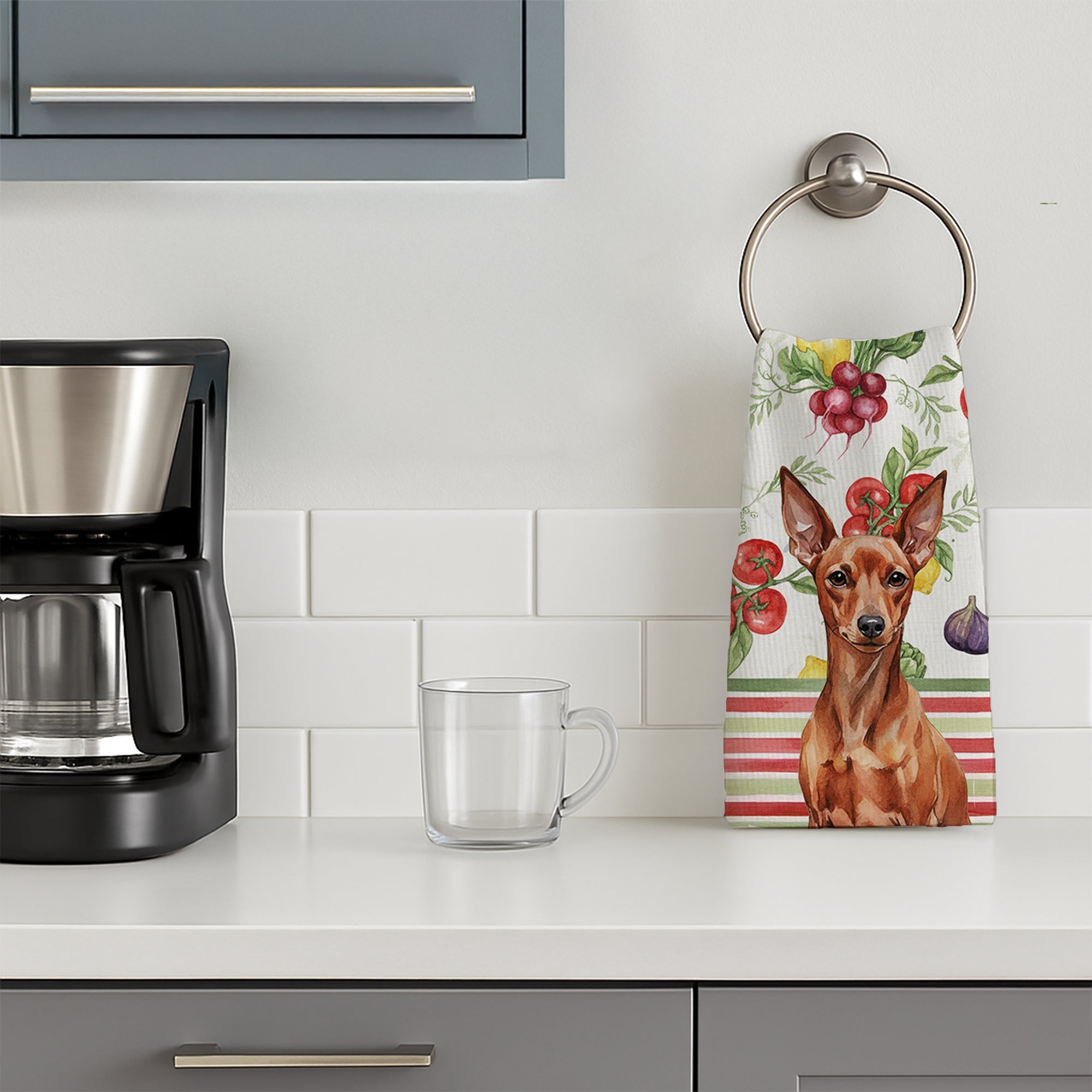 Shown here is the Red Miniature Pinscher Min Pin Vegetables Kitchen Towel from Caroline's Treasures featuring artwork of a Miniature Pinscher in a Everyday design. The detailed illustration and vibrant colors make it a standout accent that celebrates both seasonal style and love for the subject. This image features a vibrant watercolor vegetable pattern with tomatoes, lemons, artichokes, figs, radishes, and leafy greens arranged in a repeating design, paired with classic red and green stripes. The bright, garden-fresh palette creates a cheerful, farmhouse-inspired look that feels lively, welcoming, and perfect for kitchen décor. Everyday décor celebrates personal style and the small moments that make a house feel like home. Thoughtful designs add warmth and personality that can be enjoyed year-round. Bring cozy everyday charm to your sink or powder room with a plush velour towel featuring original watercolor artwork. The front is a soft, color-rich minky polyester that polishes glassware to a brilliant shine; the back is 100% white cotton terry loop for quick absorbency on hands, dishes, and counters. Artwork is dyed into the fibers for lasting color that won’t crack or peel. Finished edges keep the shape wash after wash. Size: 15" x 25". Machine wash; tumble dry low. Designed and printed in the USA. Perfect for: Kitchen counters, ovens, and towel bars, everyday drying and cleanup, -themed kitchens, or year-round use for Miniature Pinscher lovers. Miniature Pinschers, often called Min Pins, are energetic companion dogs known for their confidence and alert personality. This spirited breed is valued for its intelligence and fearless attitude. Makes a heartfelt gift for: Miniature Pinscher owners, lovers, Everyday gifts, pet parents, friends who adore their Miniature Pinscher, or anyone celebrating .