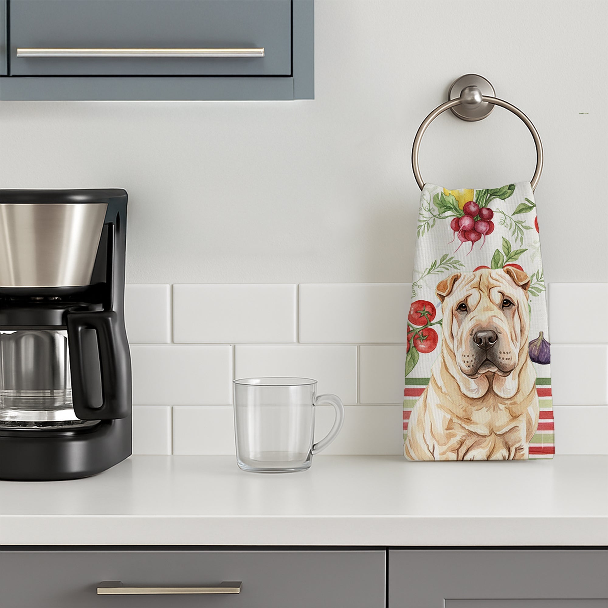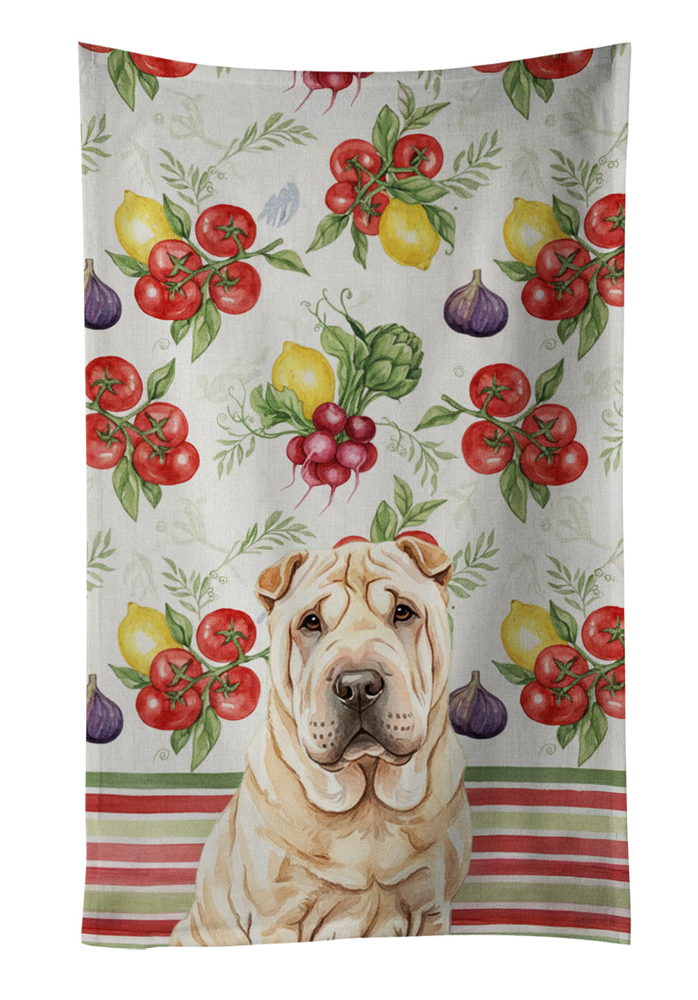Shown here is the Shar Pei Vegetables Kitchen Towel from Caroline's Treasures featuring artwork of a Shar Pei in a Everyday design. The detailed illustration and vibrant colors make it a standout accent that celebrates both seasonal style and love for the subject. This image features a vibrant watercolor vegetable pattern with tomatoes, lemons, artichokes, figs, radishes, and leafy greens arranged in a repeating design, paired with classic red and green stripes. The bright, garden-fresh palette creates a cheerful, farmhouse-inspired look that feels lively, welcoming, and perfect for kitchen décor. Everyday décor celebrates personal style and the small moments that make a house feel like home. Thoughtful designs add warmth and personality that can be enjoyed year-round. Bring cozy everyday charm to your sink or powder room with a plush velour towel featuring original watercolor artwork. The front is a soft, color-rich minky polyester that polishes glassware to a brilliant shine; the back is 100% white cotton terry loop for quick absorbency on hands, dishes, and counters. Artwork is dyed into the fibers for lasting color that won’t crack or peel. Finished edges keep the shape wash after wash. Size: 15" x 25". Machine wash; tumble dry low. Designed and printed in the USA. Perfect for: Kitchen counters, ovens, and towel bars, everyday drying and cleanup, -themed kitchens, or year-round use for Shar Pei lovers. Shar Peis are distinctive dogs known for their wrinkled skin and reserved temperament. This ancient breed is respected for its loyalty, independence, and calm demeanor. Makes a heartfelt gift for: Shar Pei owners, lovers, Everyday gifts, pet parents, friends who adore their Shar Pei, or anyone celebrating .