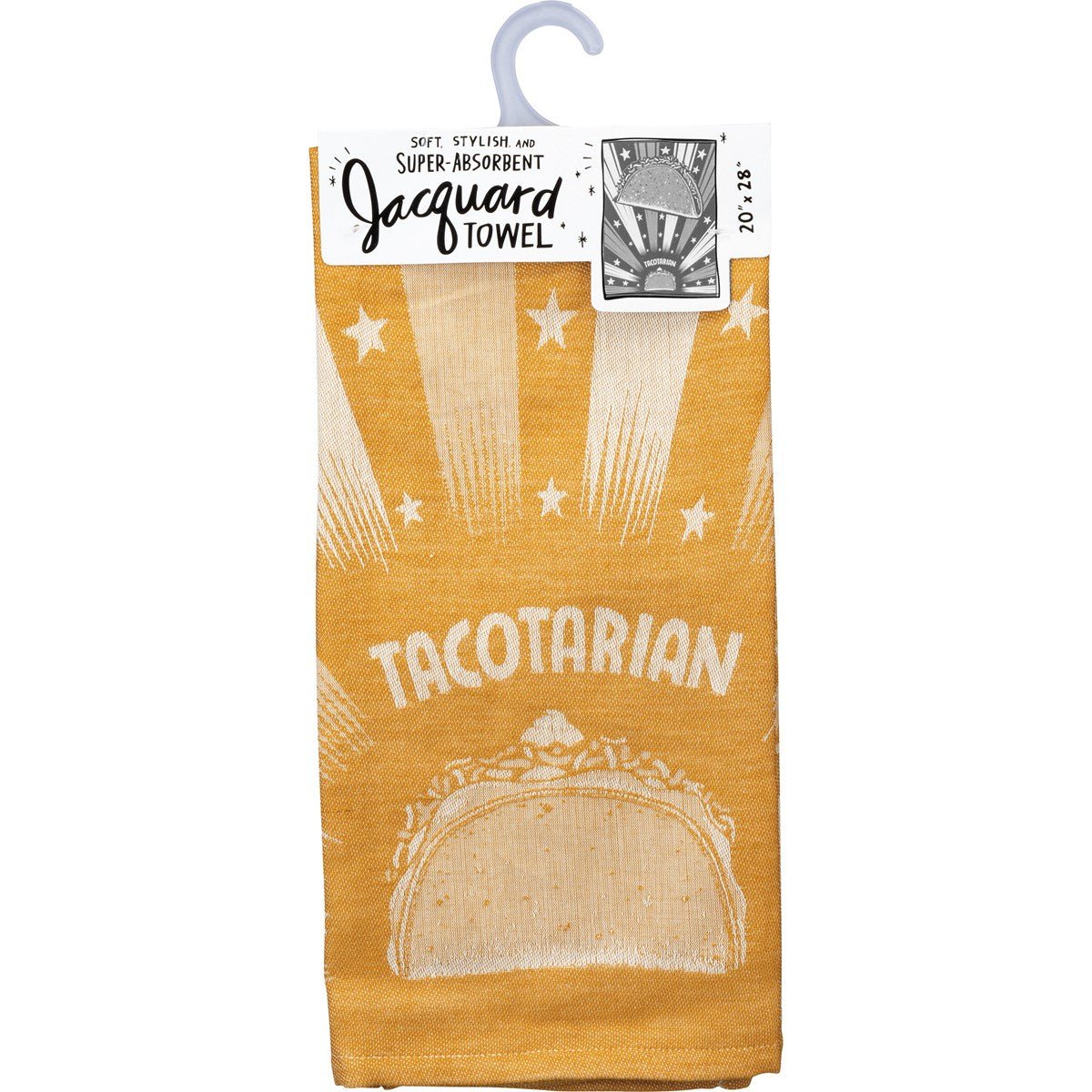 A jacquard woven cotton dish towel featuring a taco and stars design with "Tacotarian" sentiment.