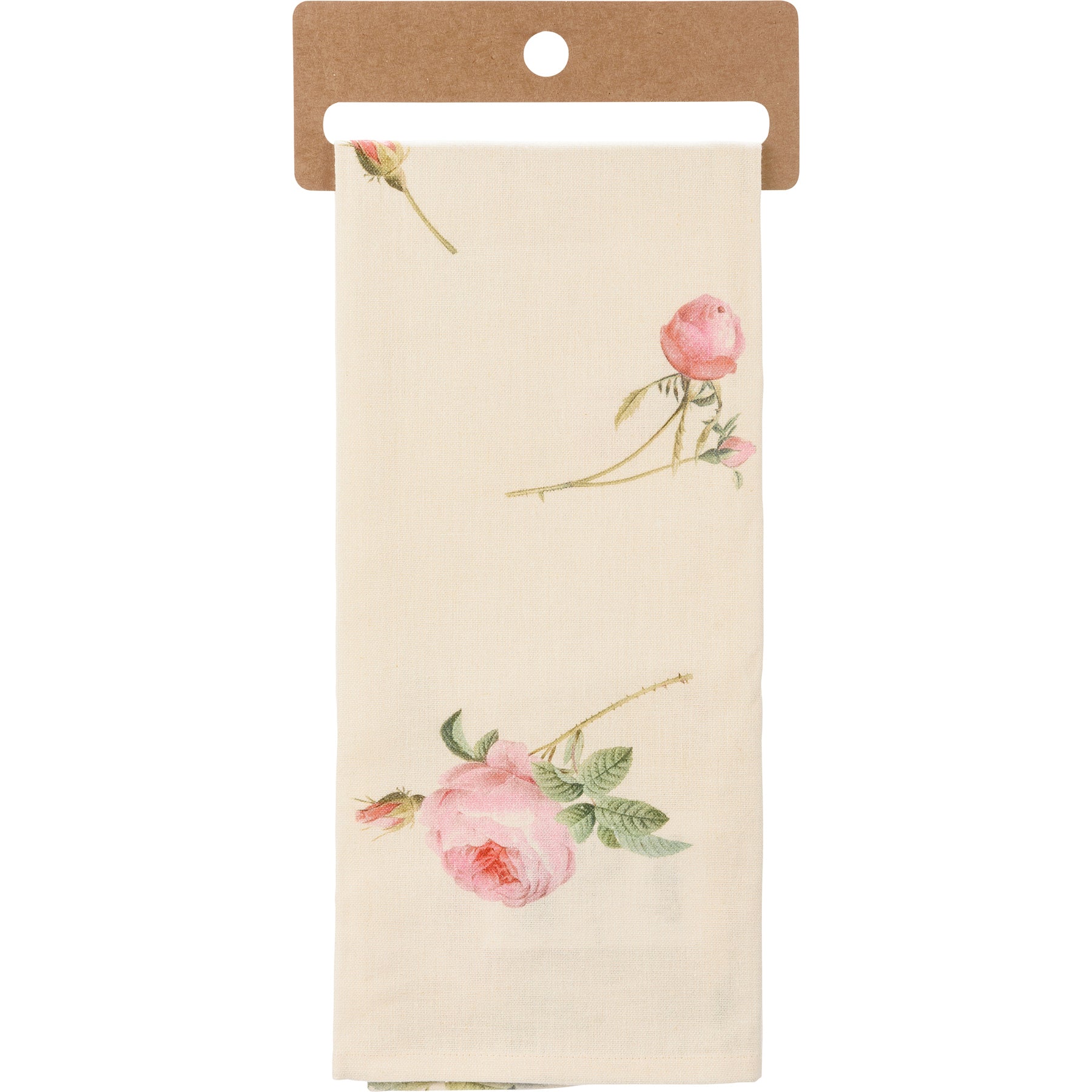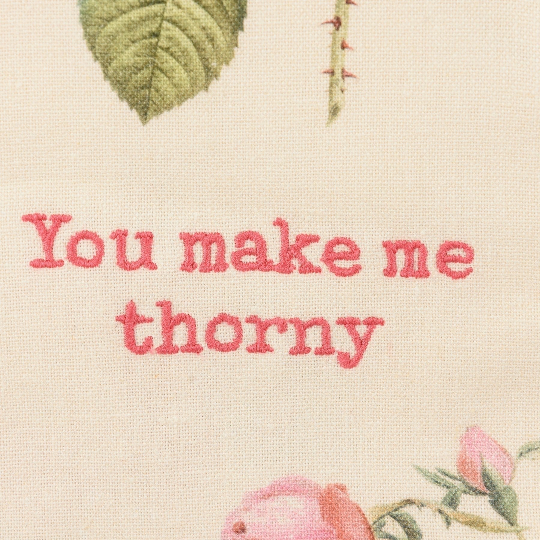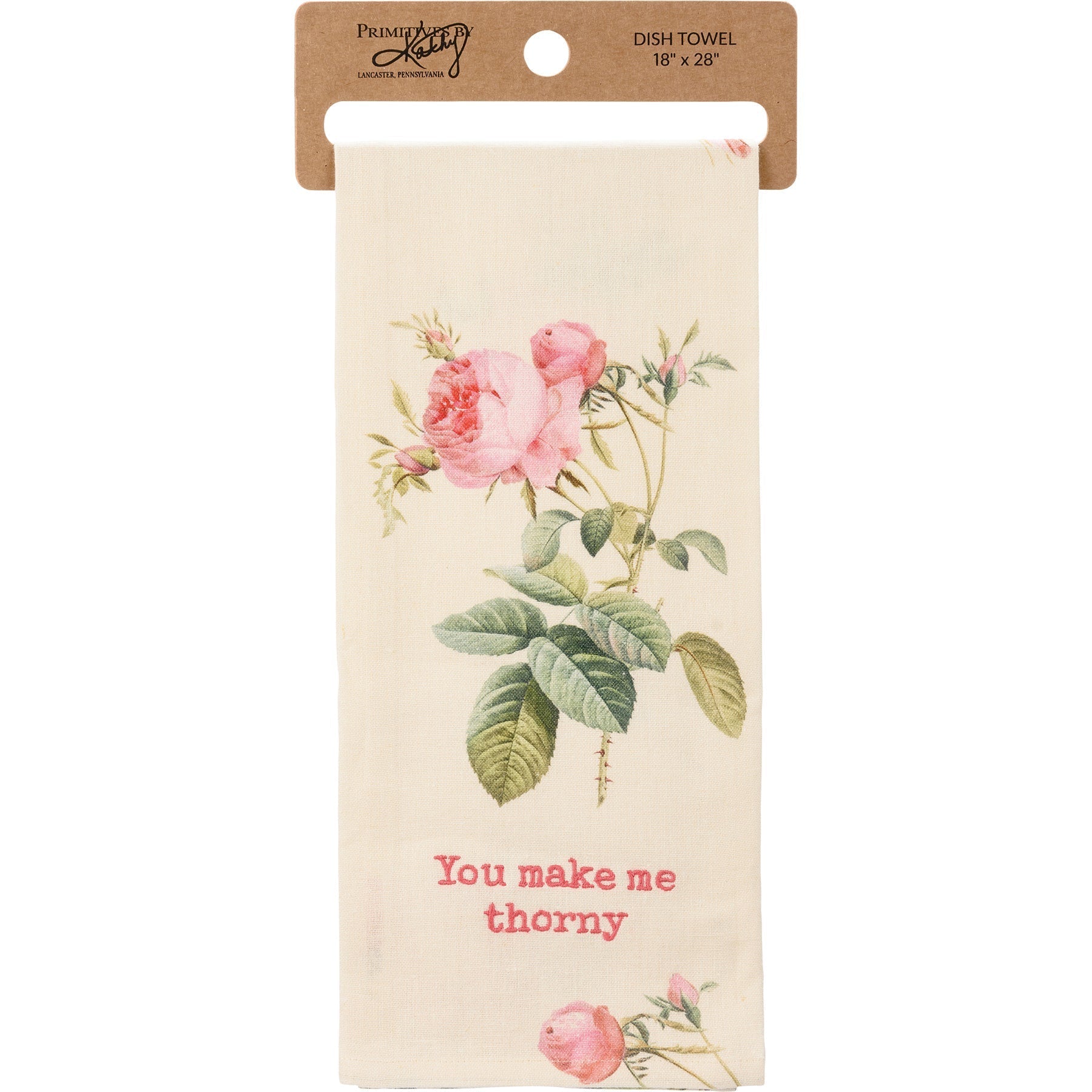 A cotton linen blend kitchen towel featuring all-over vintage style rose designs and punny embroidered "You Make Me Thorny" sentiment. Features a cotton tape loop in the corner for easy hanging. Towel is packaged on a cardboard hanger with a hole to easily hang on rack.