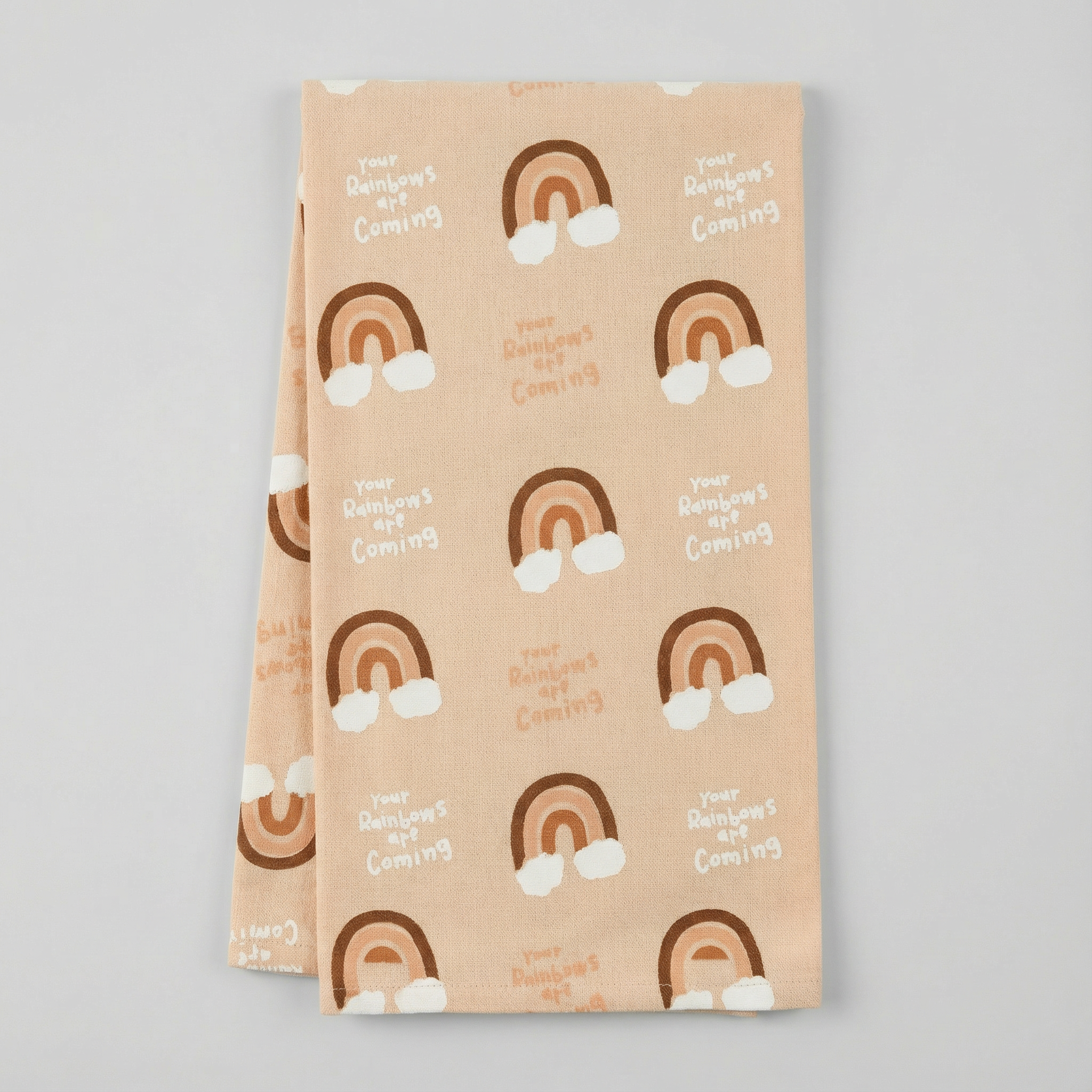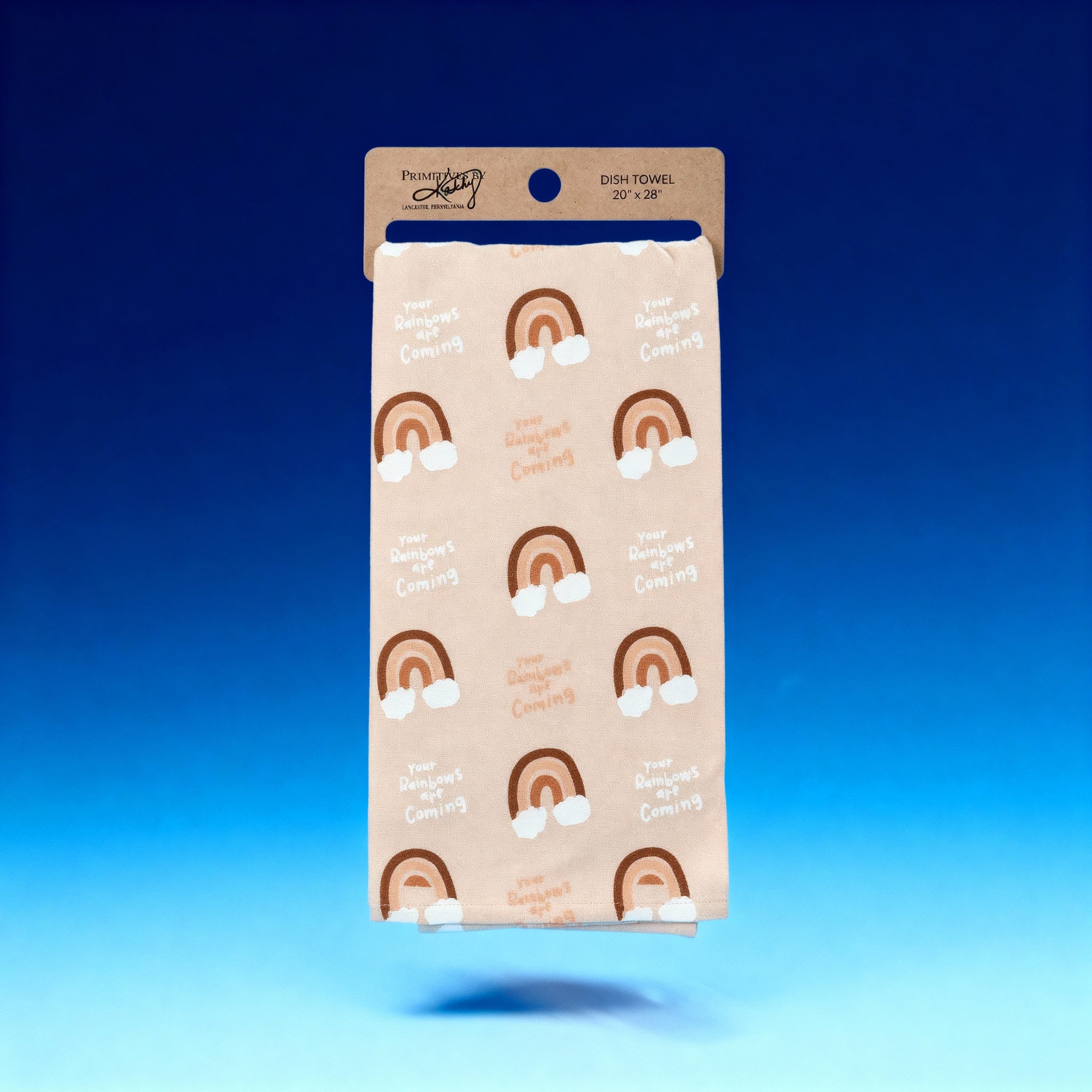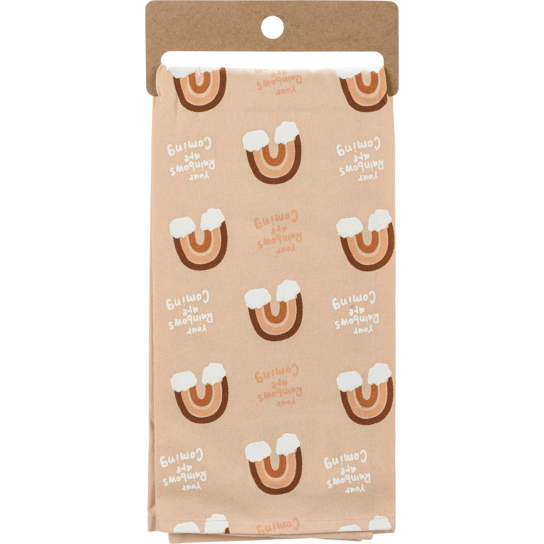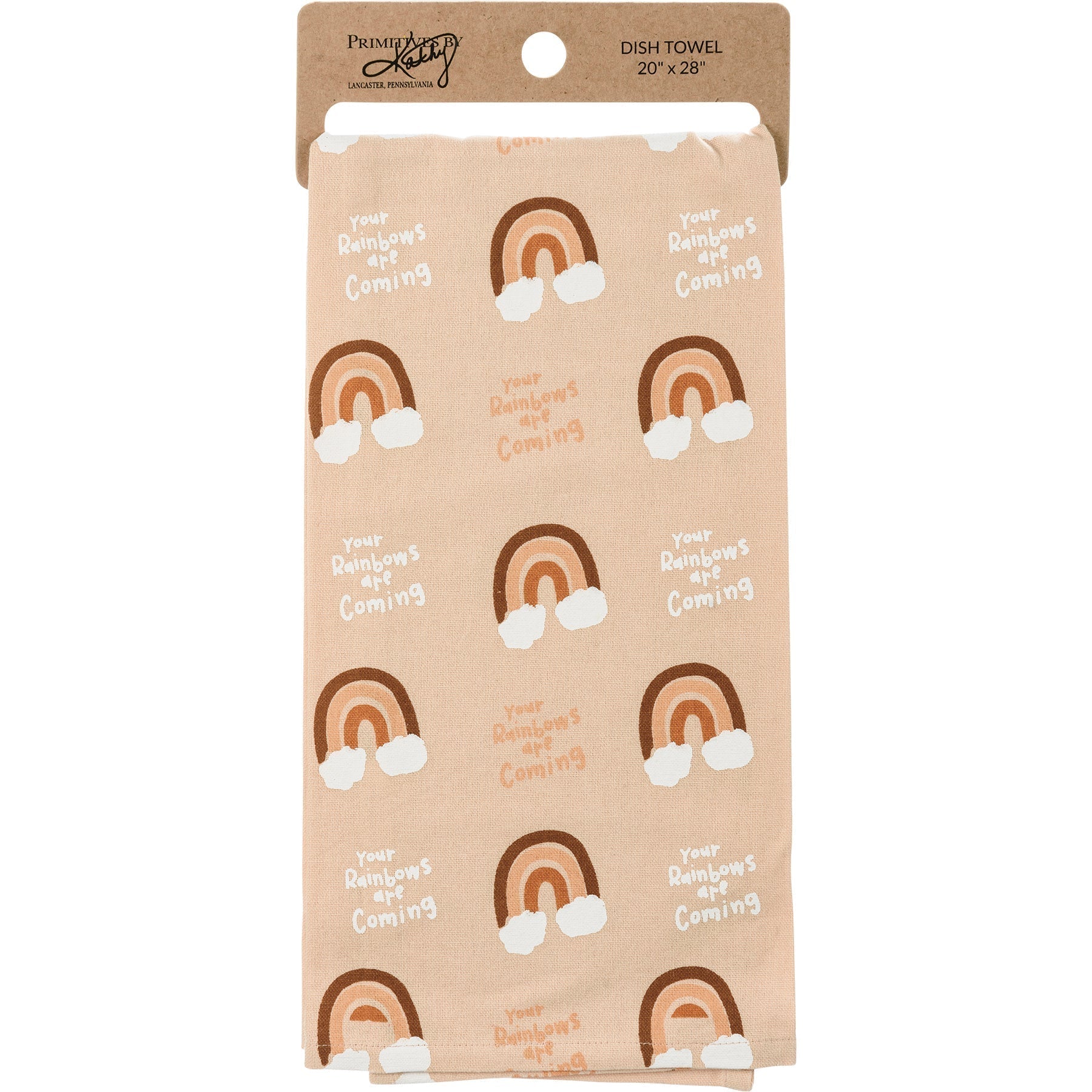 A cotton kitchen towel featuring an all-over rainbow design with an embroidered "Your Rainbows Are Coming" sentiment. Towel is packaged on a cardboard hanger with a hole to easily hang on rack.