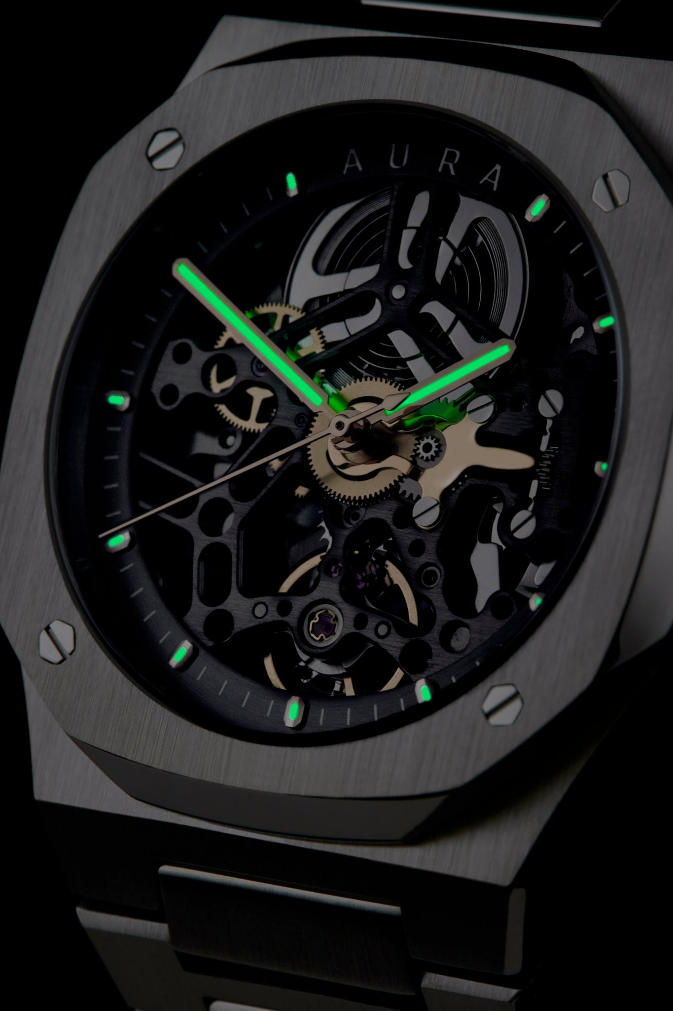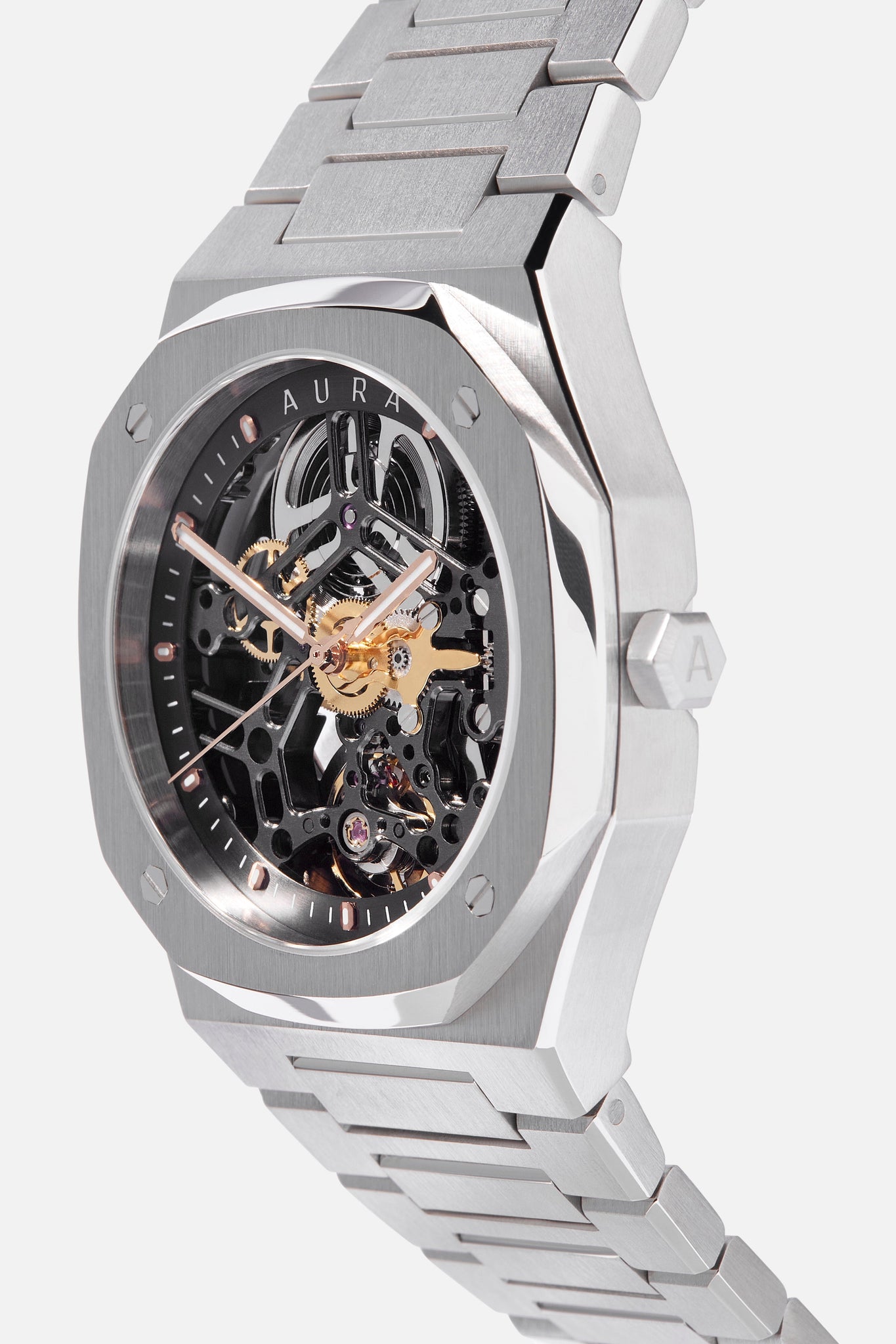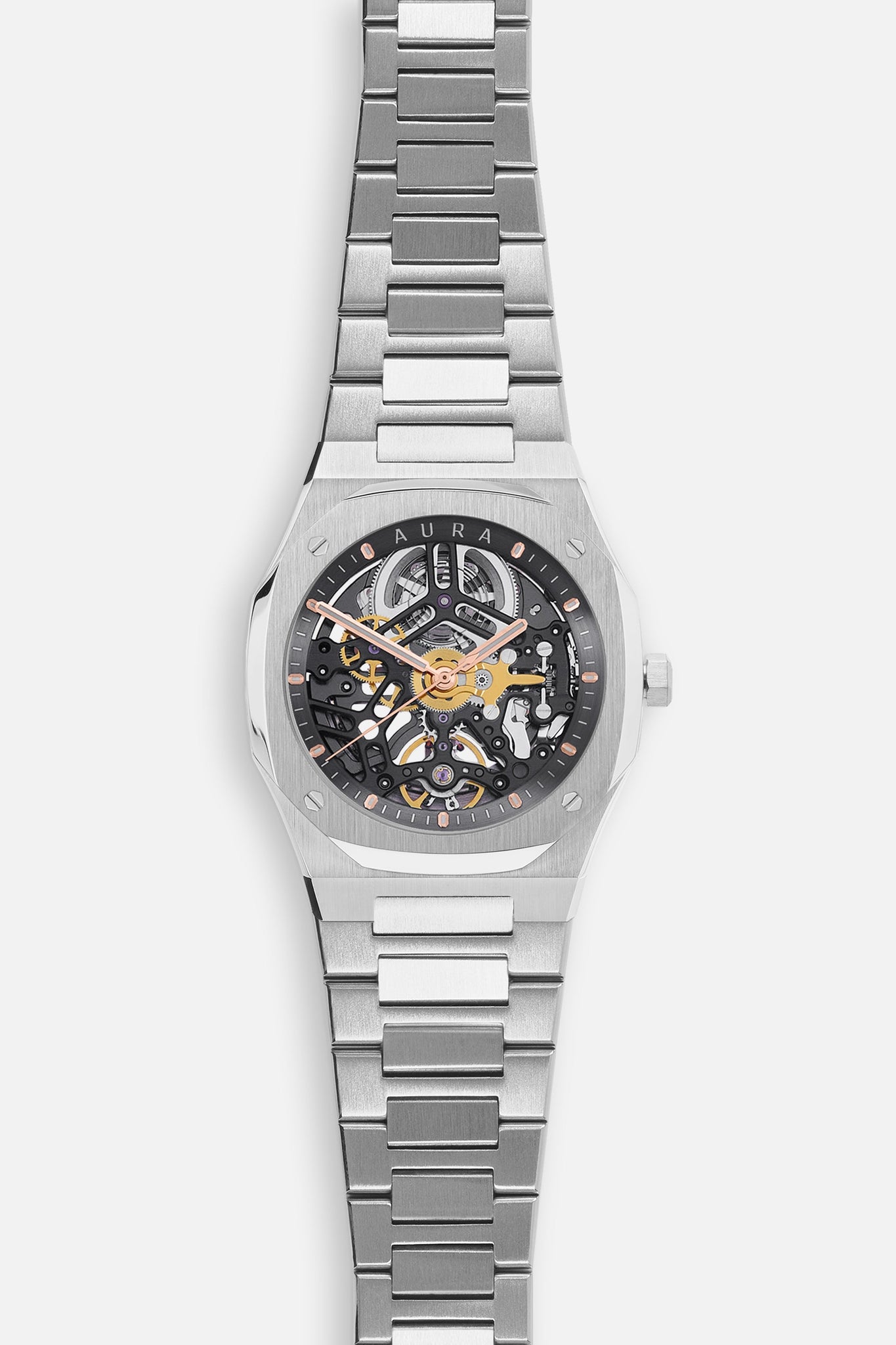 Introducing the latest iteration of our esteemed Skeleton series, the Stainless Steel Skeleton 002. This exceptional timepiece stands out with its mesmerizing self-winding transparent skeleton movement, offering a captivating glimpse into the intricate mechanics that power it. Crafted with utmost precision and durability in mind, its robust stainless steel case ensures longevity and resilience against the rigors of everyday wear. Complemented by an integrated steel bracelet, this watch exudes both sophistication and strength, making it a timeless accessory for the discerning connoisseur. Explore the fusion of innovation and elegance with the Stainless Steel Skeleton 002, a testament to our commitment to excellence in horology.