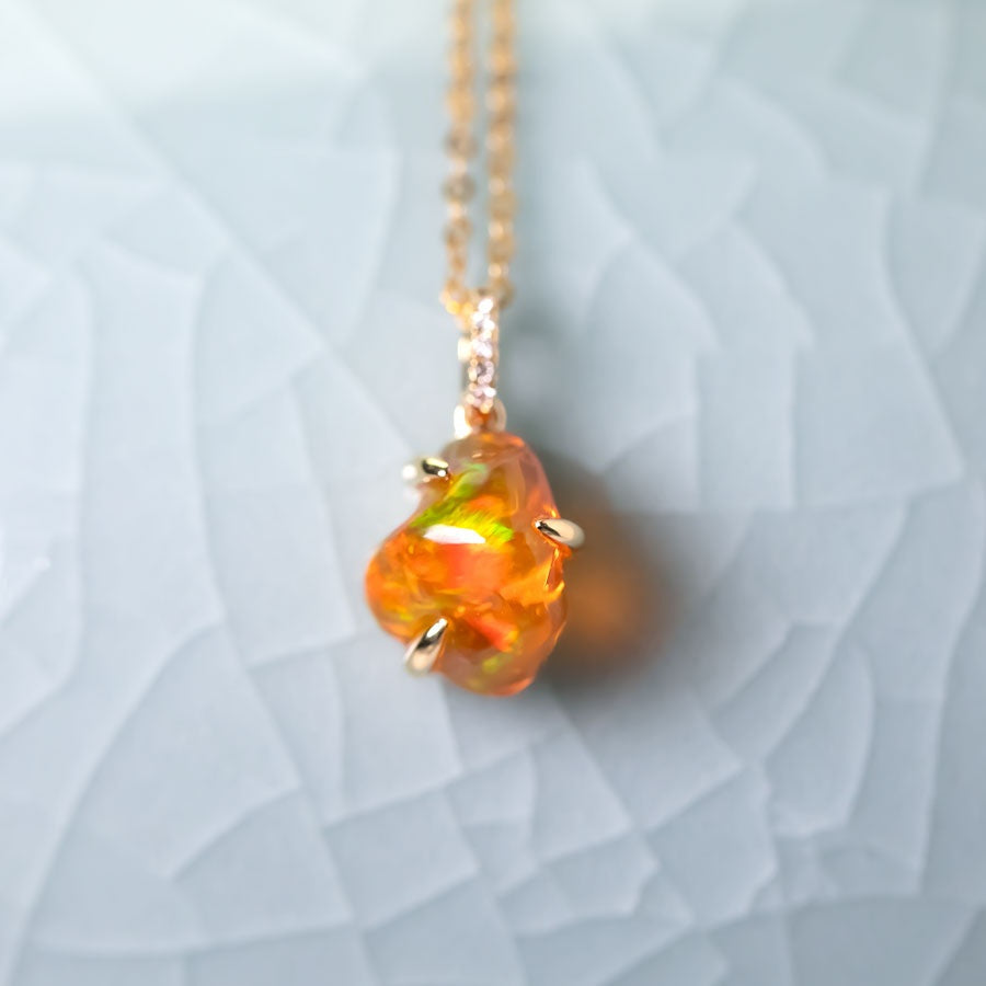 1.84 ct Mexican Fire Opal & Diamond Pendant Necklace 18K Yellow Gold.