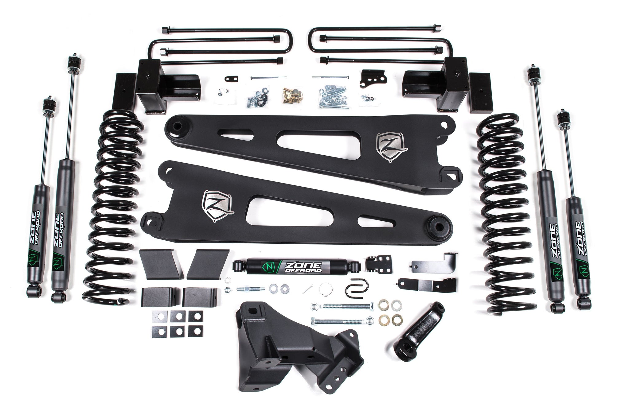 Take your Super Duty to new heights with this 4" lift kit from Zone Offroad - now available for gas and diesel trucks! These kits can be cofigured with either radius arm drop brackets or upgraded to stout Zone HD Radius Arms for superior strength and durability. Kits include everything needed to reliably lift your truck and the capability to run up to 37" tires, from coil springs to steering correction and rear lift blocks to level the stance. Upgrade your stock shocks with Nitro Series Gas Shocks, or Fox 2.0 Adventure Series for even greater performance and control. As with all Zone lift kits, these kits are backed by Factory Protection Plus, the comprehensive extended warranty giving you peace of mind on or off the road with a 5-year, 60,000-mile drivetrain warranty and Zone Offroad's limited lifetime warranty. Get the look, performance, and capability your truck deserves!
