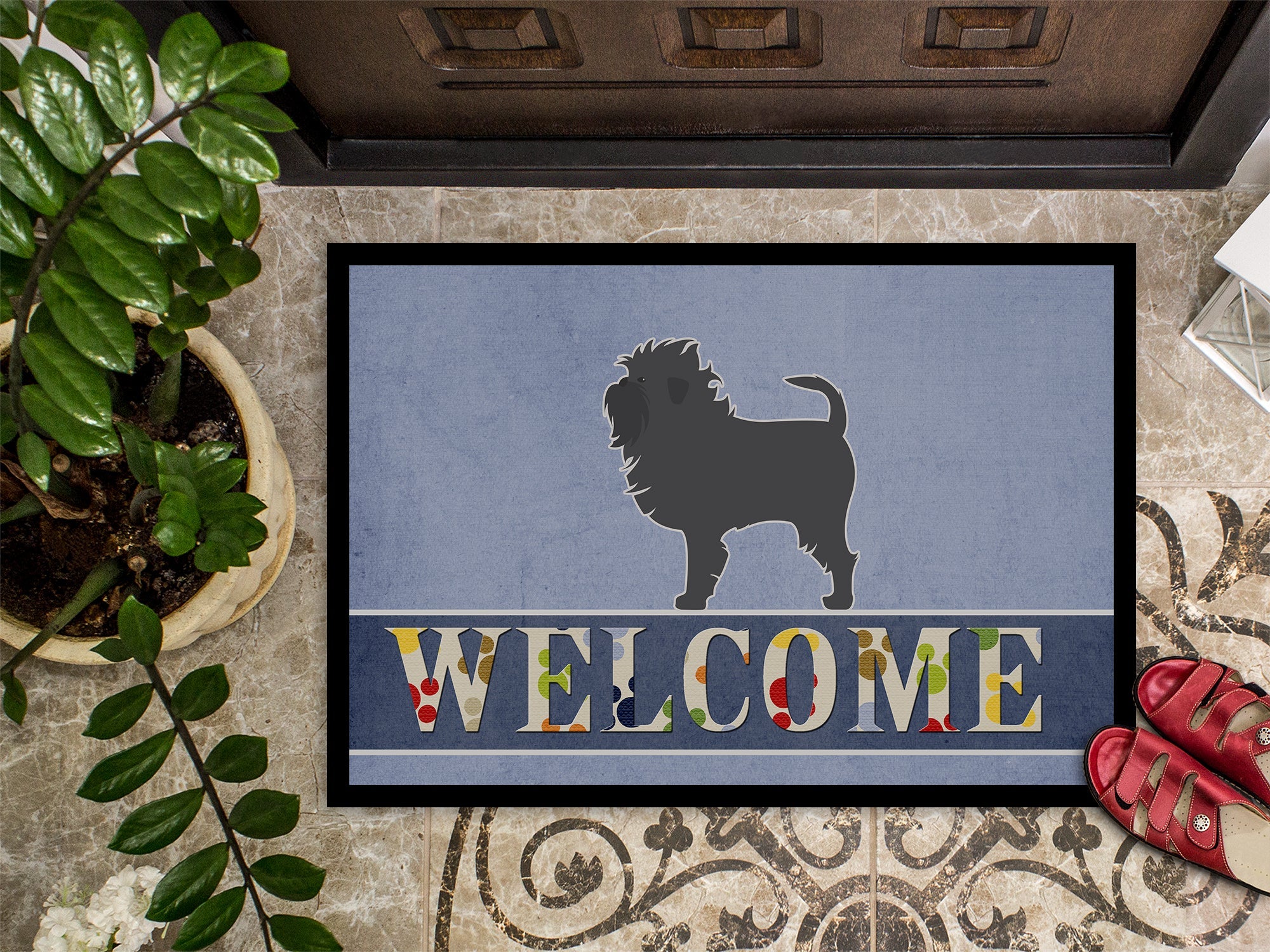 Decorate your space with our Affenpinscher artwork on a Doormat. Welcome your guests in style with our Artwork Door Mat, designed to withstand almost any weather condition. This mat, measuring approximately 24 by 36 inches, is held together by durable black binding tape. Its top layer, composed of polyester felt, is dyed with the eye-catching image you see on the mat. A few layers below provide the mat with stability, while its rubber bottom is stamped to help prevent slipping and ensures safety. Our mat works wonderfully as both an indoor or outdoor door mat. For cleaning, simply hose it off with water or use a power washer - no need for any cleaner that produces suds. Avoid scrubbing with a brush, instead, opt for the vacuum on floor setting. Designed manufactured and printed in the USA, this mat is a perfect addition to your porch, outdoor kitchen, entryway, or any indoor space. Its unique design makes it a charming decorative rug that greets your guests and adds a stylish touch to your home decor.
