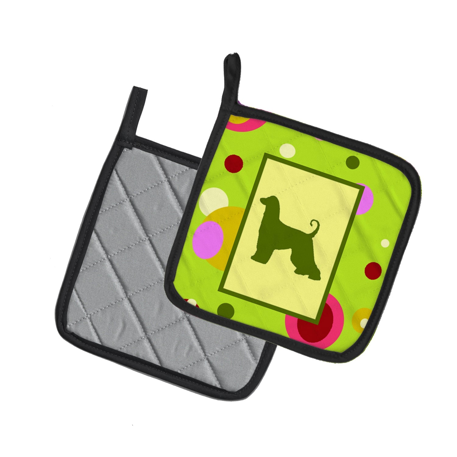 Decorate your space with our Afghan Hound artwork on a Pair of Pot Holders. A Pair of Pot Holders to match your kitchen decor. Made in the USA these are thick and functional. Full color artwork decorates the front polyester fabric of the hot pad and accented by a black trim. Use these at as a trivet for your Thanksgiving or Christmas tablescape. Filled with insulated fabric and quilted for durability. These colorful pot holders will make a great gift for your favorite home cook or executive chef. Each pot holder measures approximately 7 1/2 inches by 7 1/2 inches. A hanging tab is included.