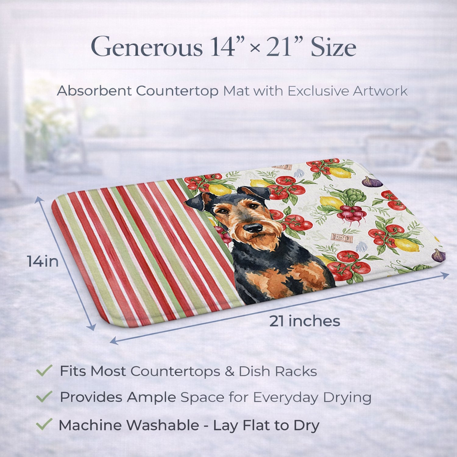 Shown here is the Airedale Terrier Vegetables Dish Drying Mat from Caroline's Treasures featuring artwork of a Airedale Terrier in a Everyday design. The detailed illustration and vibrant colors make it a standout accent that celebrates both seasonal style and love for the subject. This image features a vibrant watercolor vegetable pattern with tomatoes, lemons, artichokes, figs, radishes, and leafy greens arranged in a repeating design, paired with classic red and green stripes. The bright, garden-fresh palette creates a cheerful, farmhouse-inspired look that feels lively, welcoming, and perfect for kitchen décor. Everyday décor celebrates personal style and the small moments that make a house feel like home. Thoughtful designs add warmth and personality that can be enjoyed year-round. Say goodbye to messy countertops and soggy dish towels with our innovative dish drying mat. Our high-quality dish drying pad is designed to keep your countertops dry while offering a stylish and efficient solution. Whether you're air drying dishes, glasses, stemware, silverware, pots, pans, bottles, or even fruits and vegetables, our dish mat is the perfect choice. The 14 inches x 21 inches size fits most counters and dish drying racks, and the non-slip design ensures stability. Made with water-absorbent polyester and a polyurethane foam insert, our dish drying mat is not only functional but also durable. It's machine washable and printed in the USA for long-lasting use. The beautiful artwork adds flair to your kitchen decor, making it a perfect housewarming gift or present for any occasion. Upgrade your kitchen experience with our absorbent and versatile dish drying mat. Perfect for: Kitchen counters and sinks, everyday dish drying and countertop protection, Dogs-themed homes, or year-round use for Airedale Terrier lovers. Airedale Terriers, often called the King of Terriers, are intelligent, confident, and versatile dogs. Known for their courage and loyalty, this breed is valued for its strong work ethic and affectionate bond with its family. Makes a heartfelt gift for: Airedale Terrier owners, Dogs lovers, Everyday gifts, pet parents, friends who adore their Airedale Terrier, or anyone celebrating Dogs.