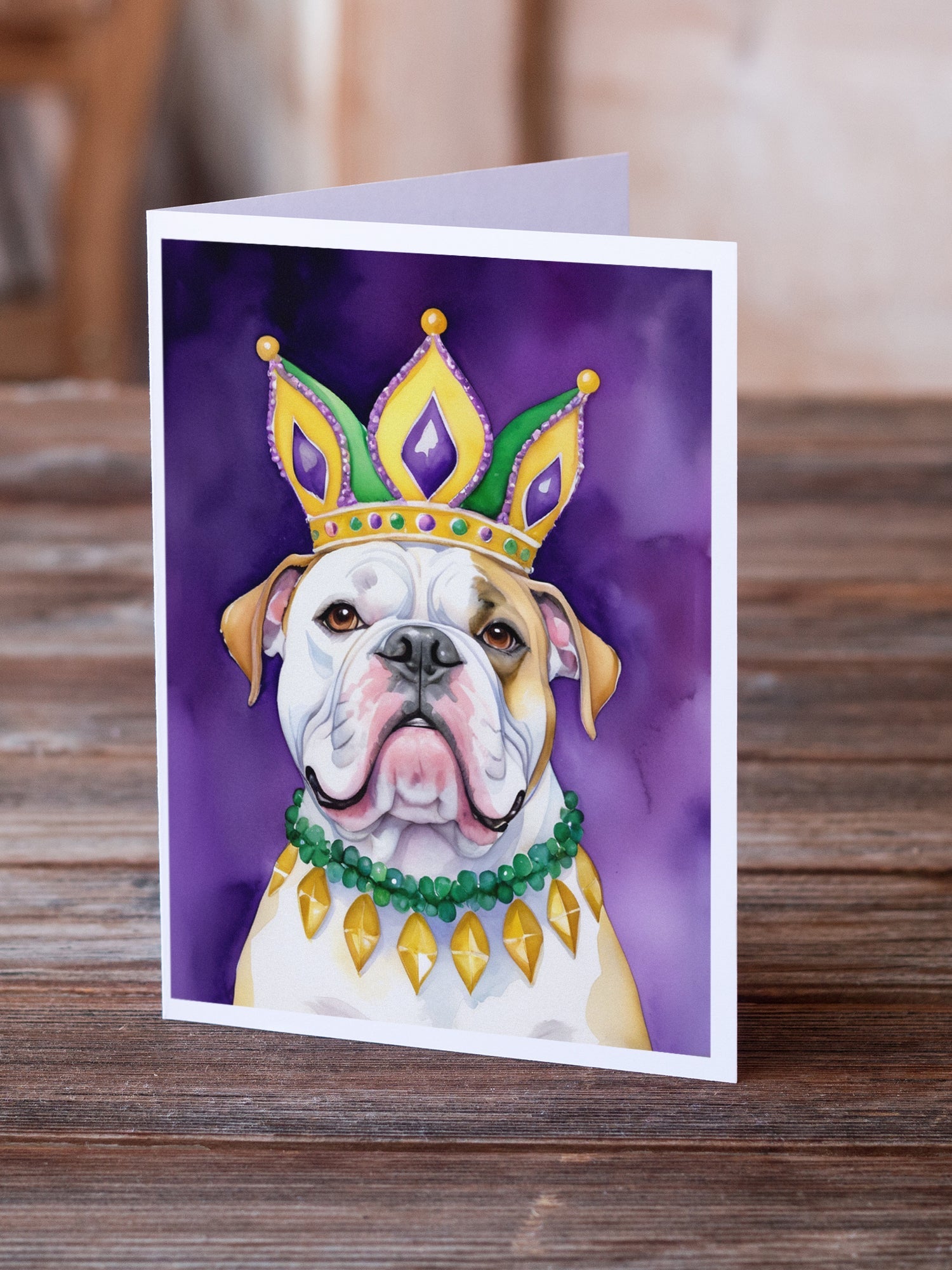 Decorate your space with our Mardi Gras American Bulldog artwork on a . Celebrate special moments with Caroline's Treasures Printed Greeting Card Pack. This pack includes eight beautifully folded 5x7 cards, accompanied by eight matching white envelopes. With blank interiors, these cards provide ample space for your personalized messages and heartfelt holiday greetings. Each card features captivating full-color artwork, meticulously printed in our facility on high-quality 80 lb cover stock or 216 GSM. The super smooth finish of the white cards enhances the visual impact of the artwork, creating a truly stunning presentation. Designed by our talented in-house artists or licensed artists, the artwork on these cards showcases their creativity and attention to detail. From vibrant illustrations to captivating designs, each card tells its own unique story. Whether it's for birthdays, anniversaries, holidays, or any special occasion, Caroline's Treasures Greeting Card Pack is the perfect way to convey your heartfelt sentiments. Share joy, love, and warm wishes with these exquisite cards and make every moment unforgettable.