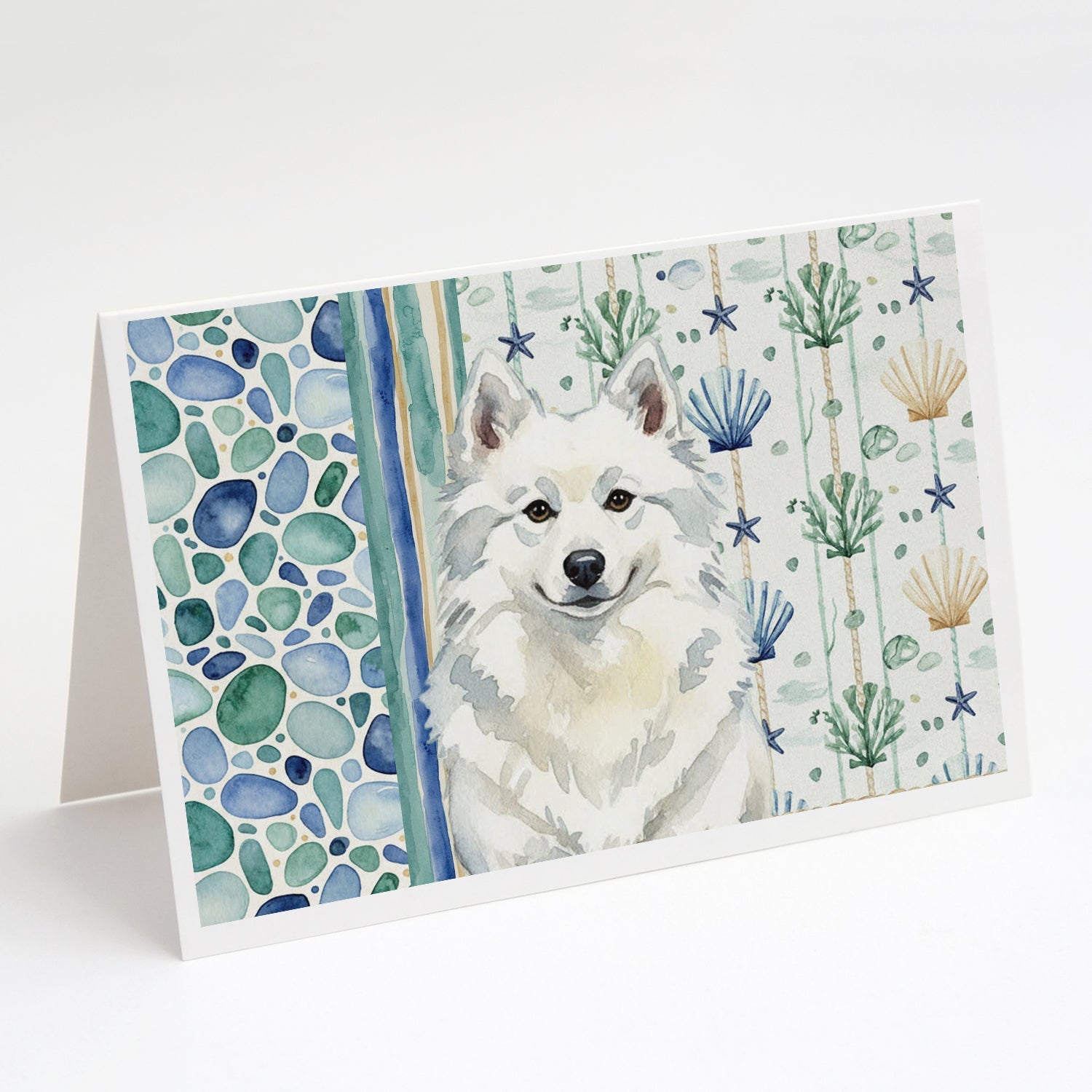 Shown here is the American Eskimo Coastal Sea Glass Greeting Cards Pack of 8 from Caroline's Treasures featuring artwork of a Alaskan Malamute in a Everyday design. The detailed illustration and vibrant colors make it a standout accent that celebrates both seasonal style and love for the subject. This image features a calming coastal watercolor pattern with soft seashells, seaweed, starfish, and pebble-inspired accents arranged in a repeating design. The soothing palette of blues, greens, and sandy neutrals creates a relaxed, beach-inspired look that adds a fresh and tranquil feel to any space. Everyday décor celebrates personal style and the small moments that make a house feel like home. Thoughtful designs add warmth and personality that can be enjoyed year-round. Celebrate special moments with Caroline's Treasures Printed Greeting Card Pack. This pack includes eight beautifully folded 5x7 cards, accompanied by eight matching white envelopes. With blank interiors, these cards provide ample space for your personalized messages and heartfelt holiday greetings. Each card features captivating full-color artwork, meticulously printed in our facility on high-quality 80 lb cover stock or 216 GSM. The super smooth finish of the white cards enhances the visual impact of the artwork, creating a truly stunning presentation. Designed by our talented in-house artists or licensed artists, the artwork on these cards showcases their creativity and attention to detail. From vibrant illustrations to captivating designs, each card tells its own unique story. Whether it's for birthdays, anniversaries, holidays, or any special occasion, Caroline's Treasures Greeting Card Pack is the perfect way to convey your heartfelt sentiments. Share joy, love, and warm wishes with these exquisite cards and make every moment unforgettable. Perfect for: Writing personal messages, everyday correspondence, and thoughtful notes, Dogs-themed stationery collections, or year-round use for Alaskan Malamute lovers. Alaskan Malamutes are strong working dogs known for their endurance, loyalty, and friendly disposition. Bred for hauling and cold climates, this powerful northern breed is cherished for its affectionate nature and impressive strength. Makes a heartfelt gift for: Alaskan Malamute owners, Dogs lovers, Everyday gifts, pet parents, friends who adore their Alaskan Malamute, or anyone celebrating Dogs.