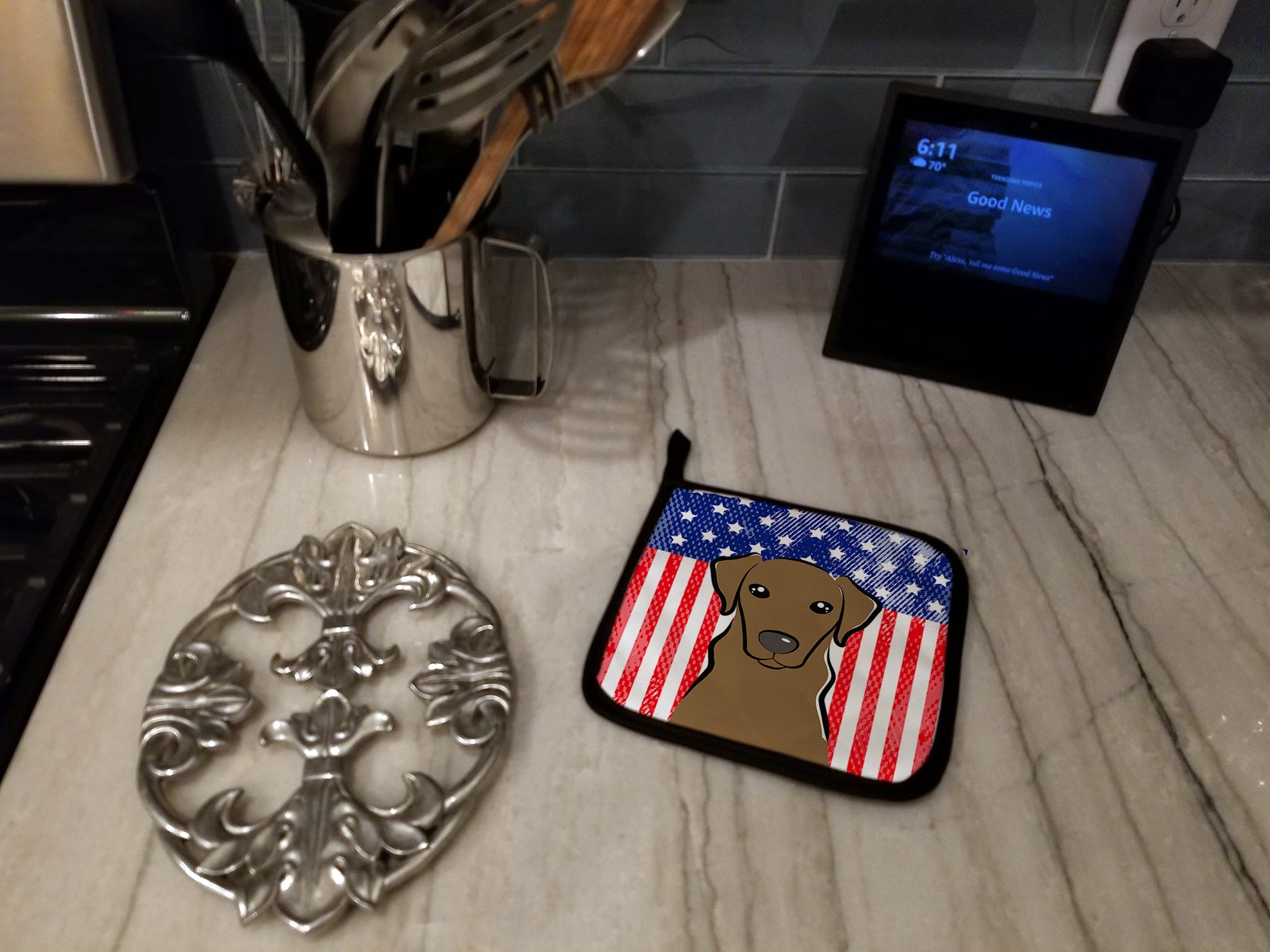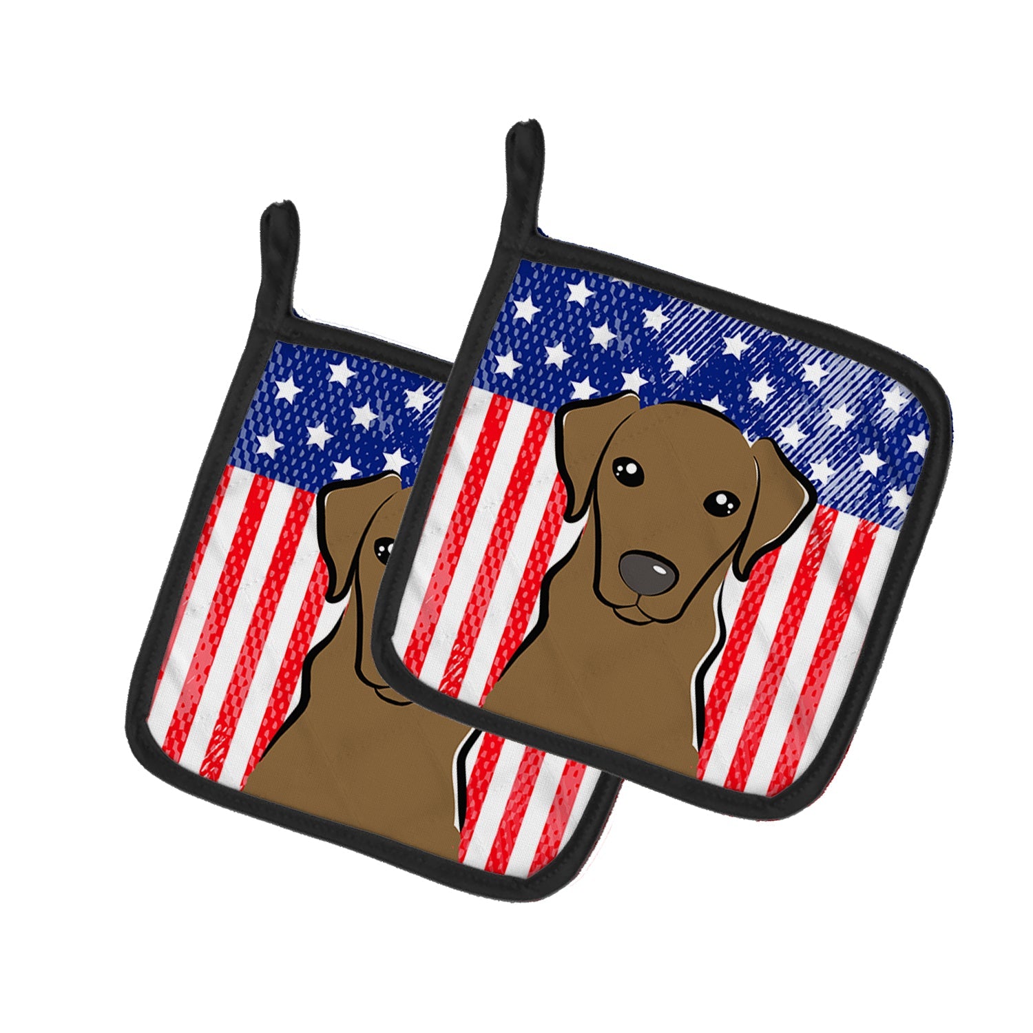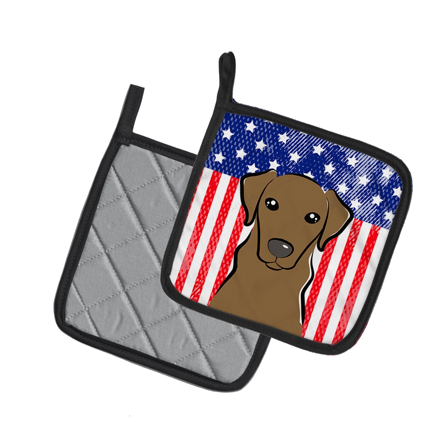 Decorate your space with our Labrador Retriever artwork on a Pair of Pot Holders. A Pair of Pot Holders to match your kitchen decor. Made in the USA these are thick and functional. Full color artwork decorates the front polyester fabric of the hot pad and accented by a black trim. Use these at as a trivet for your Thanksgiving or Christmas tablescape. Filled with insulated fabric and quilted for durability. These colorful pot holders will make a great gift for your favorite home cook or executive chef. Each pot holder measures approximately 7 1/2 inches by 7 1/2 inches. A hanging tab is included.