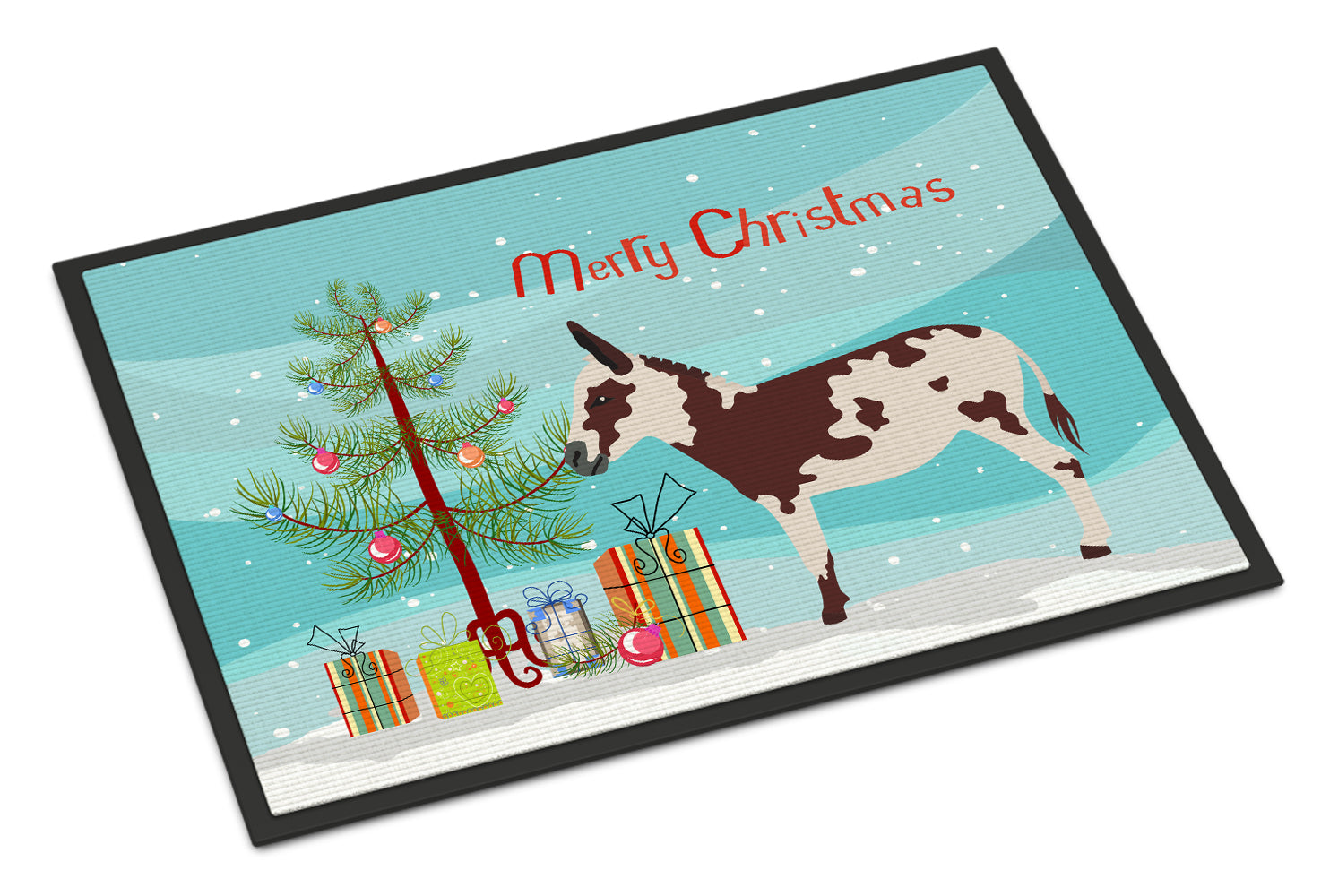 Decorate your space with our Christmas American Spotted Donkey artwork on a Doormat. Welcome your guests in style with our Artwork Door Mat, designed to withstand almost any weather condition. This mat, measuring approximately 18 by 27 inches, is held together by durable black binding tape. Its top layer, composed of polyester felt, is dyed with the eye-catching image you see on the mat. A few layers below provide the mat with stability, while its rubber bottom is stamped to help prevent slipping and ensures safety. Our mat works wonderfully as both an indoor or outdoor door mat. For cleaning, simply hose it off with water or use a power washer - no need for any cleaner that produces suds. Avoid scrubbing with a brush, instead, opt for the vacuum on floor setting. Designed manufactured and printed in the USA, this mat is a perfect addition to your porch, outdoor kitchen, entryway, or any indoor space. Its unique design makes it a charming decorative rug that greets your guests and adds a stylish touch to your home decor.
