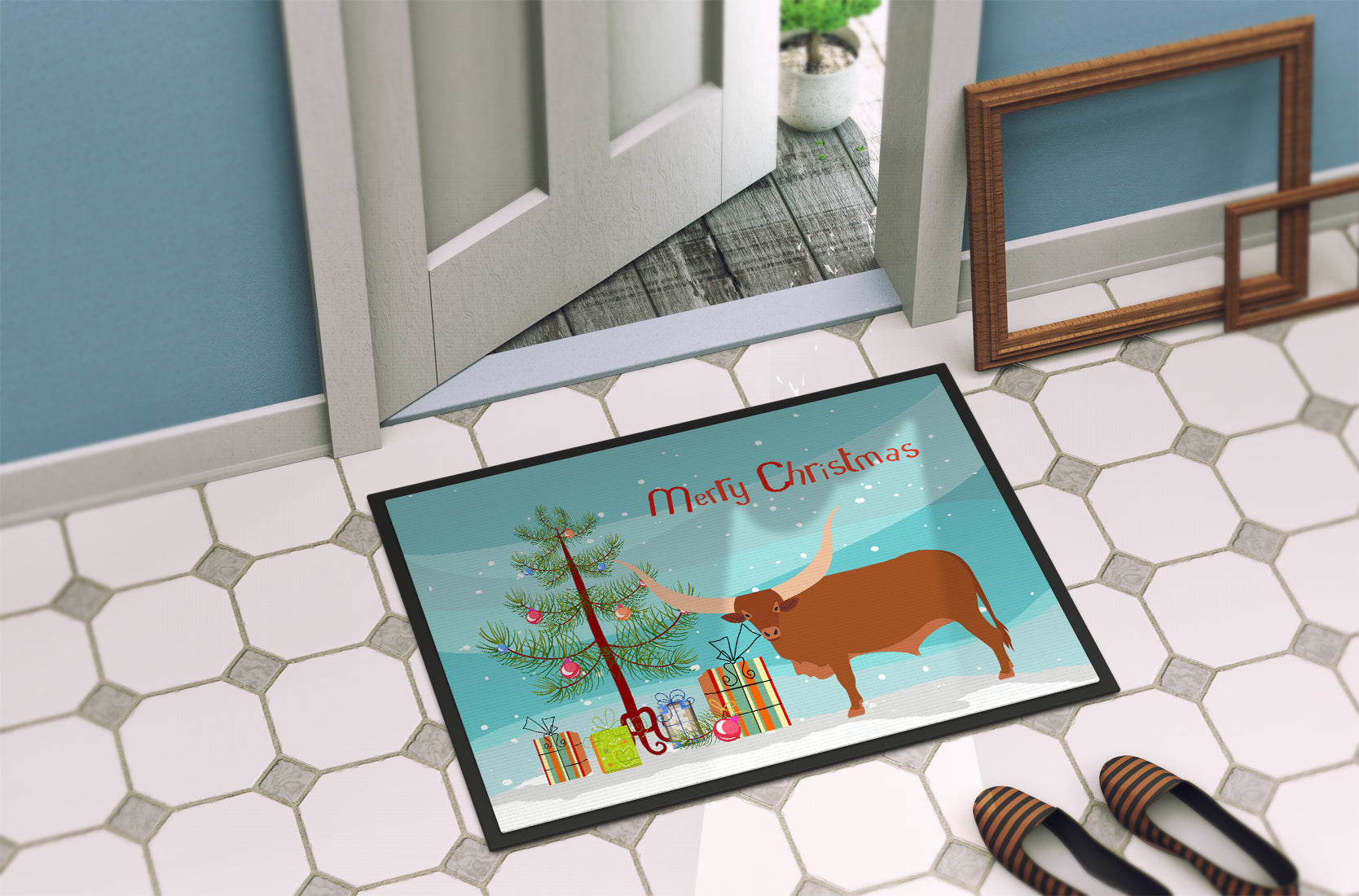 Decorate your space with our Christmas Ankole-Watusu Cow artwork on a Doormat. Welcome your guests in style with our Artwork Door Mat, designed to withstand almost any weather condition. This mat, measuring approximately 18 by 27 inches, is held together by durable black binding tape. Its top layer, composed of polyester felt, is dyed with the eye-catching image you see on the mat. A few layers below provide the mat with stability, while its rubber bottom is stamped to help prevent slipping and ensures safety. Our mat works wonderfully as both an indoor or outdoor door mat. For cleaning, simply hose it off with water or use a power washer - no need for any cleaner that produces suds. Avoid scrubbing with a brush, instead, opt for the vacuum on floor setting. Designed manufactured and printed in the USA, this mat is a perfect addition to your porch, outdoor kitchen, entryway, or any indoor space. Its unique design makes it a charming decorative rug that greets your guests and adds a stylish touch to your home decor.