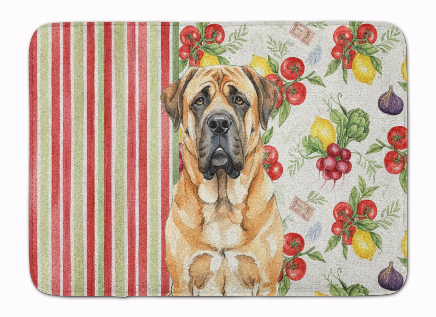 Shown here is the Apricot English Mastiff Vegetables Memory Foam Kitchen Mat from Caroline's Treasures featuring artwork of a English Mastiff in a Everyday design. The detailed illustration and vibrant colors make it a standout accent that celebrates both seasonal style and love for the subject. This image features a vibrant watercolor vegetable pattern with tomatoes, lemons, artichokes, figs, radishes, and leafy greens arranged in a repeating design, paired with classic red and green stripes. The bright, garden-fresh palette creates a cheerful, farmhouse-inspired look that feels lively, welcoming, and perfect for kitchen décor. Everyday décor celebrates personal style and the small moments that make a house feel like home. Thoughtful designs add warmth and personality that can be enjoyed year-round. Transform your floor into a work of art with Caroline's Treasures' Memory Foam Mat. This mat offers not only a stunning visual appeal but also a luxurious, plush feel that's incredibly comfortable to the touch. It's a versatile, machine-washable mat designed for both bath and kitchen use, ensuring you experience the best in comfort and convenience. Care Instructions: Maintaining this memory foam mat is a breeze. Simply follow the care instructions on the product tag. It's recommended to wash in cold water and dry on a low-temperature setting in the dryer. This ensures the mat retains its quality and longevity, allowing you to enjoy its beauty and comfort for a long time. Caroline's Treasures' Memory Foam Mat Machine Washable is the perfect blend of artistry, comfort, and practicality, making it a standout addition to any space. Upgrade your home decor with this versatile and stylish mat today. English Mastiffs are massive yet gentle dogs known for their calm demeanor and loyalty. This ancient guardian breed is admired for its protective instincts and steady, affectionate presence. Makes a heartfelt gift for: English Mastiff owners, Dogs lovers, Everyday gifts, pet parents, friends who adore their English Mastiff, or anyone celebrating Dogs.