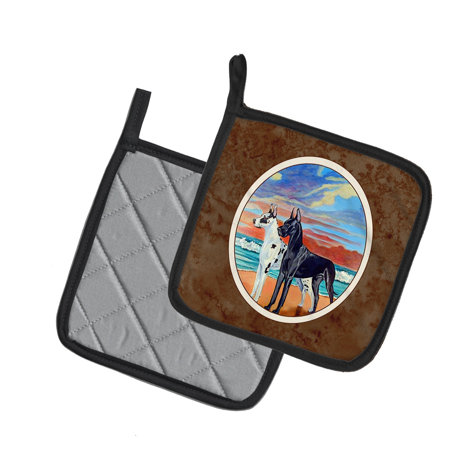 Decorate your space with our Great Dane artwork on a Pair of Pot Holders. A Pair of Pot Holders to match your kitchen decor. Made in the USA these are thick and functional. Full color artwork decorates the front polyester fabric of the hot pad and accented by a black trim. Use these at as a trivet for your Thanksgiving or Christmas tablescape. Filled with insulated fabric and quilted for durability. These colorful pot holders will make a great gift for your favorite home cook or executive chef. Each pot holder measures approximately 7 1/2 inches by 7 1/2 inches. A hanging tab is included.