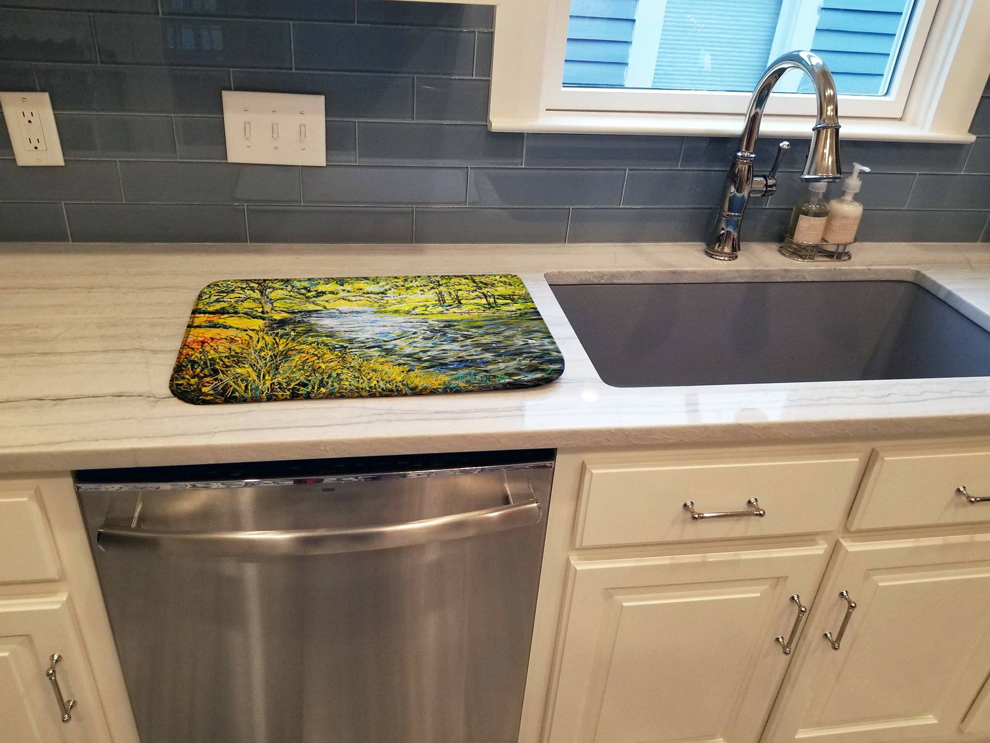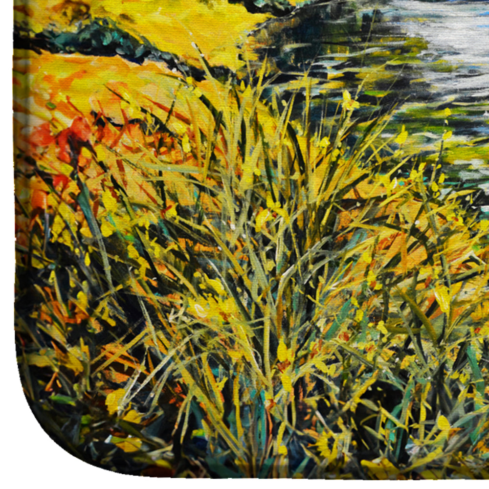 Say goodbye to messy countertops and soggy dish towels with our innovative dish drying mat. Our high-quality dish drying pad is designed to keep your countertops dry while offering a stylish and efficient solution. Whether you're air drying dishes, glasses, stemware, silverware, pots, pans, bottles, or even fruits and vegetables, our dish mat is the perfect choice. The 14 inches x 22 inches size fits most counters and dish drying racks, and the non-slip design ensures stability. Made with water-absorbent polyester and a polyurethane foam insert, our dish drying mat is not only functional but also durable. It's machine washable and printed in the USA for long-lasting use. The beautiful artwork adds flair to your kitchen decor, making it a perfect housewarming gift or present for any occasion. Upgrade your kitchen experience with our absorbent and versatile dish drying mat.