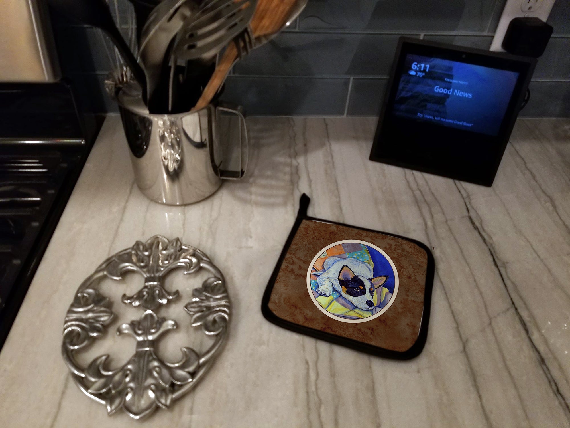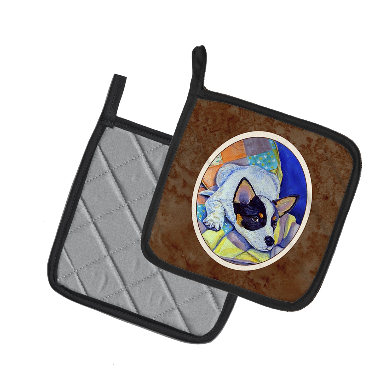 Decorate your space with our Australian Cattle Dog artwork on a Pair of Pot Holders. A Pair of Pot Holders to match your kitchen decor. Made in the USA these are thick and functional. Full color artwork decorates the front polyester fabric of the hot pad and accented by a black trim. Use these at as a trivet for your Thanksgiving or Christmas tablescape. Filled with insulated fabric and quilted for durability. These colorful pot holders will make a great gift for your favorite home cook or executive chef. Each pot holder measures approximately 7 1/2 inches by 7 1/2 inches. A hanging tab is included.