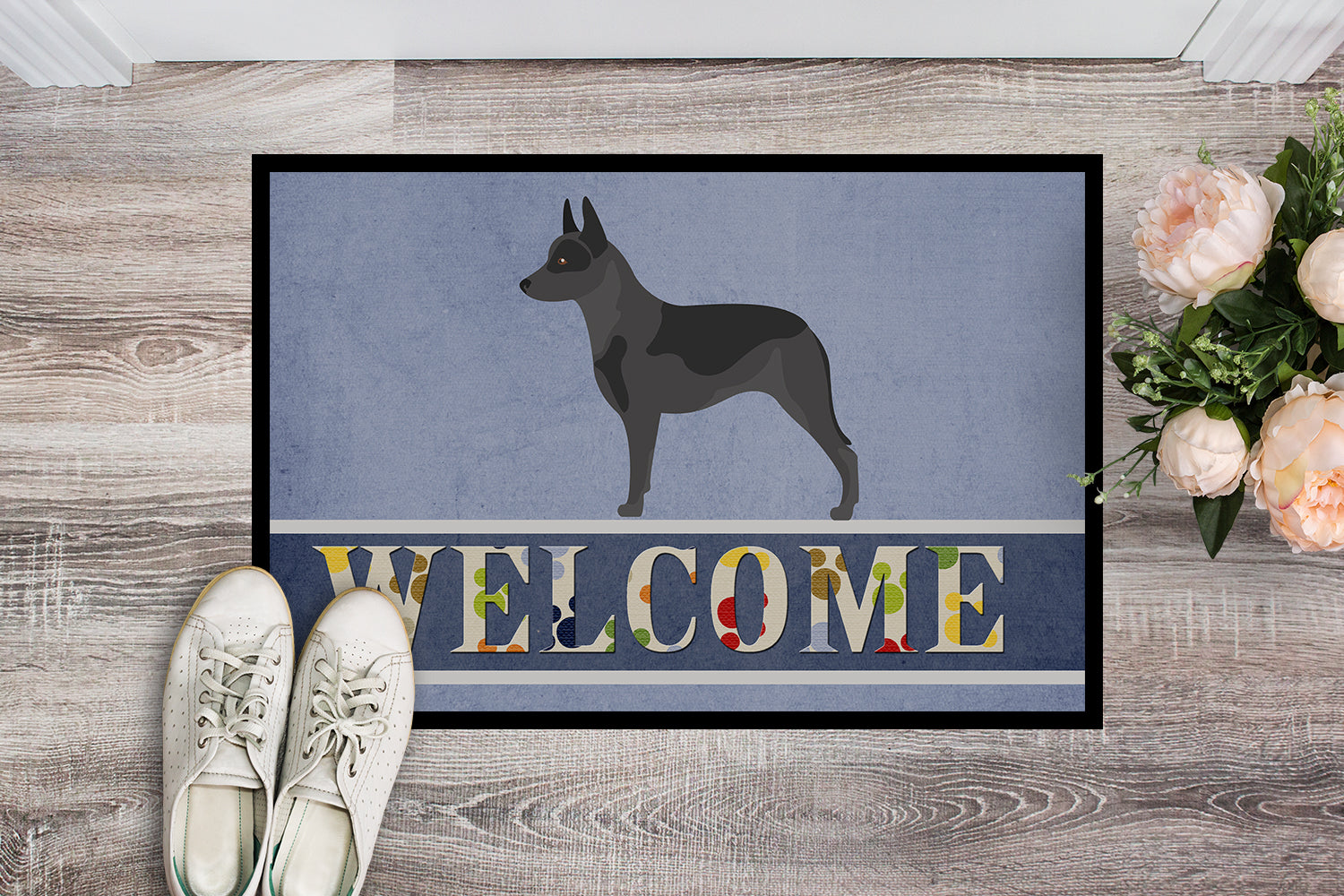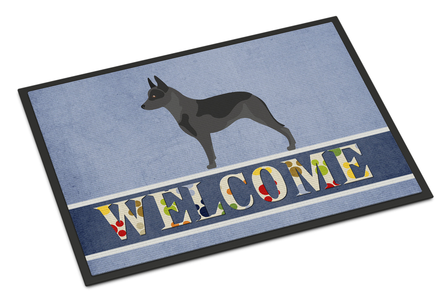 Decorate your space with our Australian Cattle Dog artwork on a Doormat. Welcome your guests in style with our Artwork Door Mat, designed to withstand almost any weather condition. This mat, measuring approximately 24 by 36 inches, is held together by durable black binding tape. Its top layer, composed of polyester felt, is dyed with the eye-catching image you see on the mat. A few layers below provide the mat with stability, while its rubber bottom is stamped to help prevent slipping and ensures safety. Our mat works wonderfully as both an indoor or outdoor door mat. For cleaning, simply hose it off with water or use a power washer - no need for any cleaner that produces suds. Avoid scrubbing with a brush, instead, opt for the vacuum on floor setting. Designed manufactured and printed in the USA, this mat is a perfect addition to your porch, outdoor kitchen, entryway, or any indoor space. Its unique design makes it a charming decorative rug that greets your guests and adds a stylish touch to your home decor.
