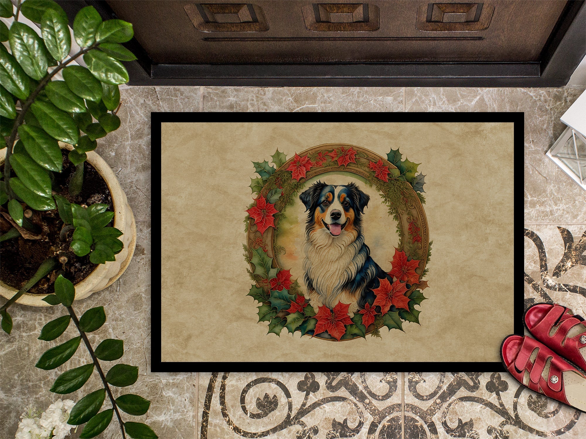 Decorate your space with our Christmas Australian Shepherd artwork on a Doormat. Bring a bit of Winter into your home with a Winter Doormat. Welcome your guests in style with our Artwork Door Mat, designed to withstand almost any weather condition. This mat, measuring approximately 18 by 27 inches, is held together by durable black binding tape. Its top layer, composed of polyester felt, is dyed with the eye-catching image you see on the mat. A few layers below provide the mat with stability, while its rubber bottom is stamped to help prevent slipping and ensures safety. Our mat works wonderfully as both an indoor or outdoor door mat. For cleaning, simply hose it off with water or use a power washer - no need for any cleaner that produces suds. Avoid scrubbing with a brush, instead, opt for the vacuum on floor setting. Designed manufactured and printed in the USA, this mat is a perfect addition to your porch, outdoor kitchen, entryway, or any indoor space. Its unique design makes it a charming decorative rug that greets your guests and adds a stylish touch to your home decor.